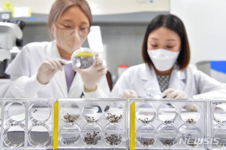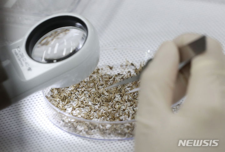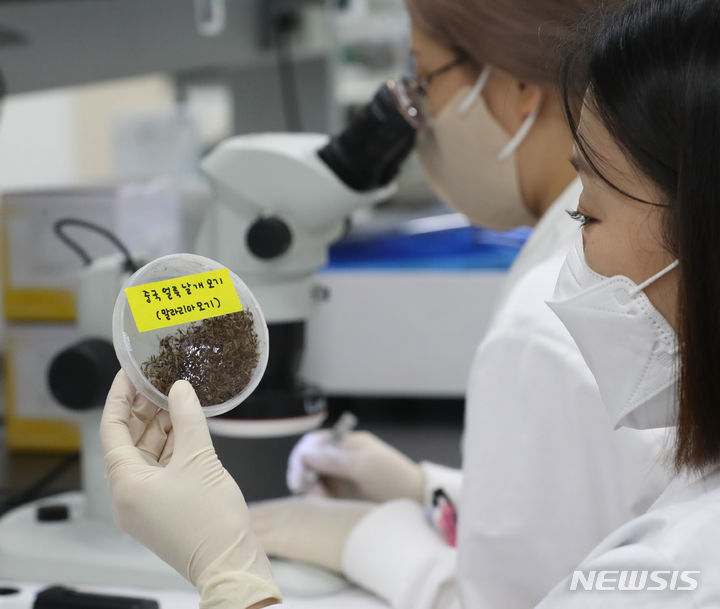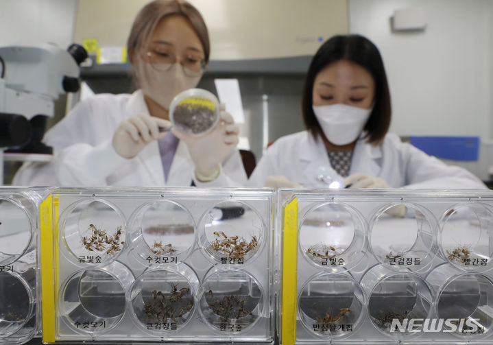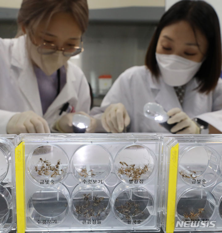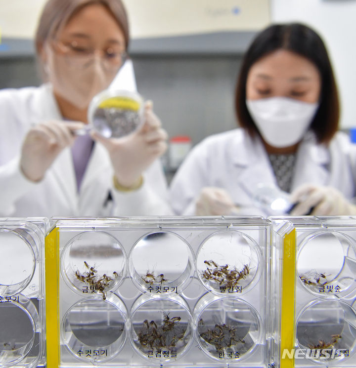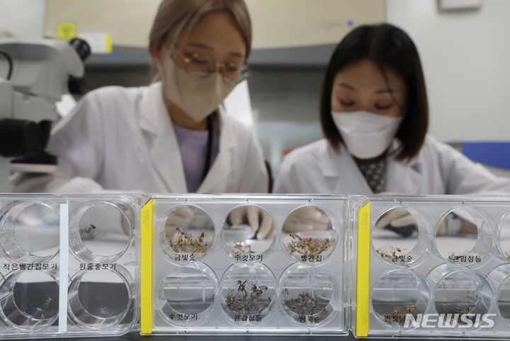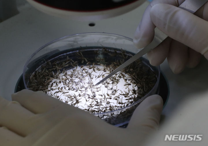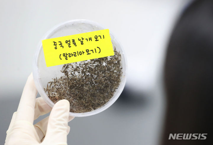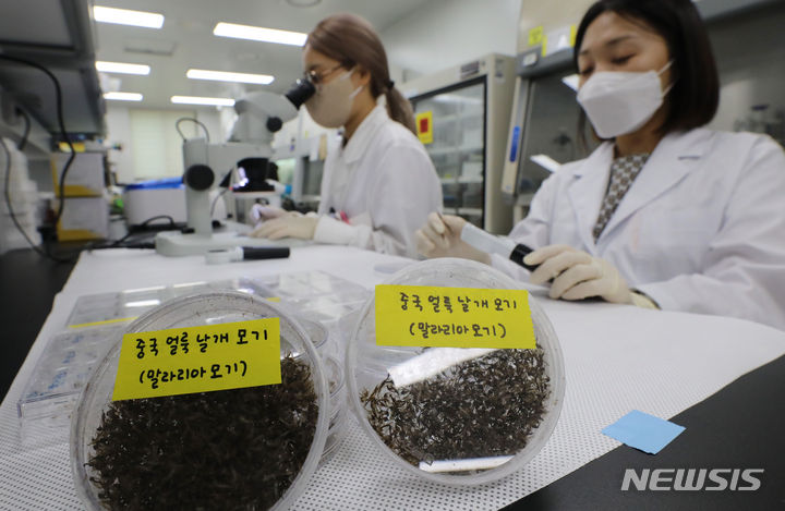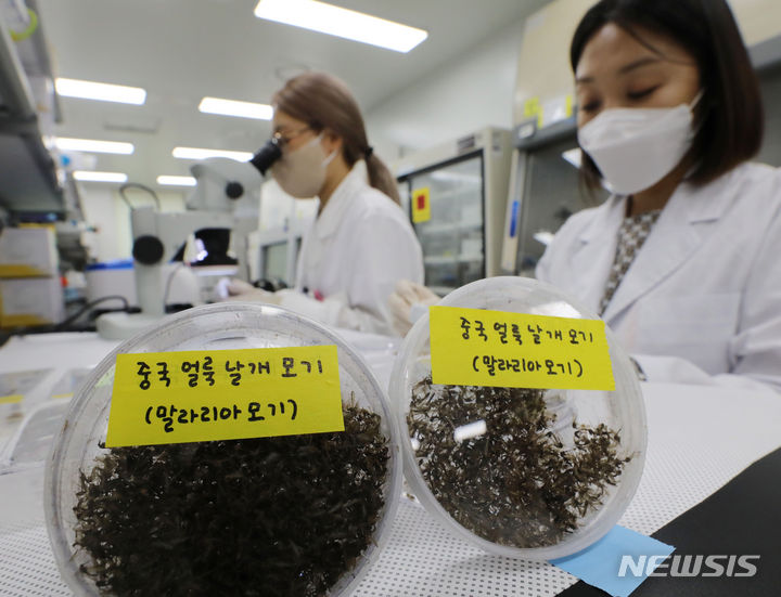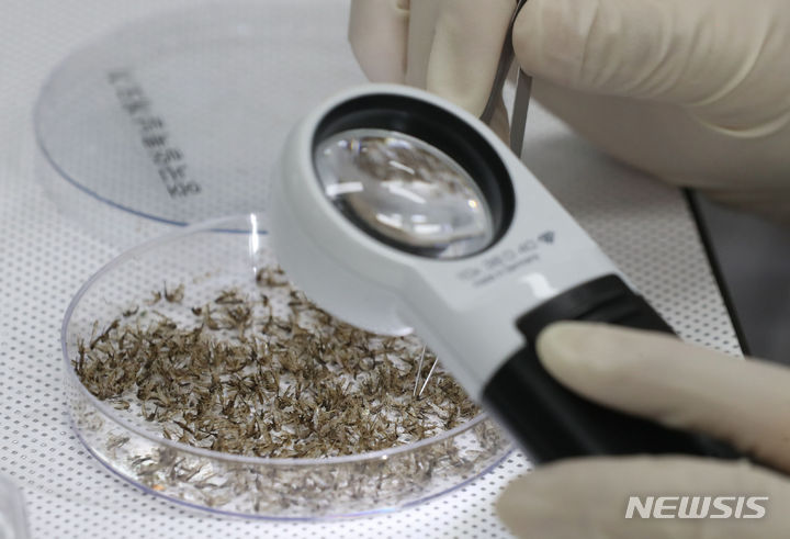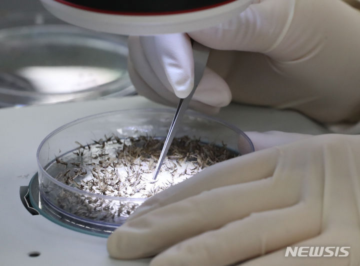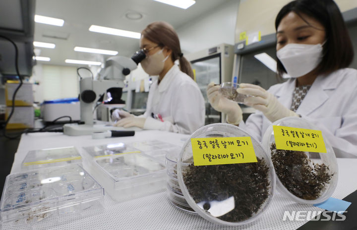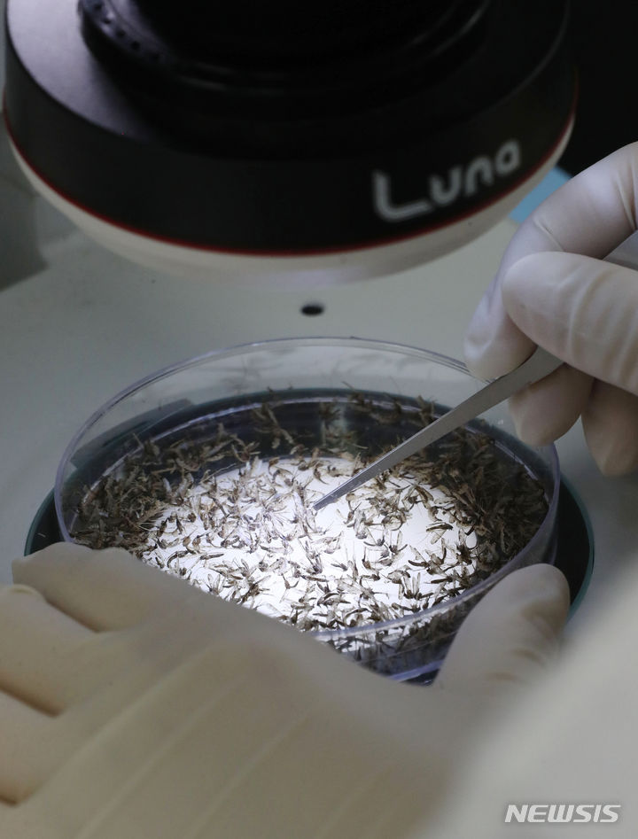 韓国でマラリア患者が急増している16日、京畿道水原市勧善区の京畿道保健環境研究院で、採集した蚊を研究員が分類しているところ。疾病管理庁は今月3日、坡州地域で採集された媒介蚊でマラリア原虫の遺伝子が確認されたことから、韓国各地にマラリア警報を発令した。