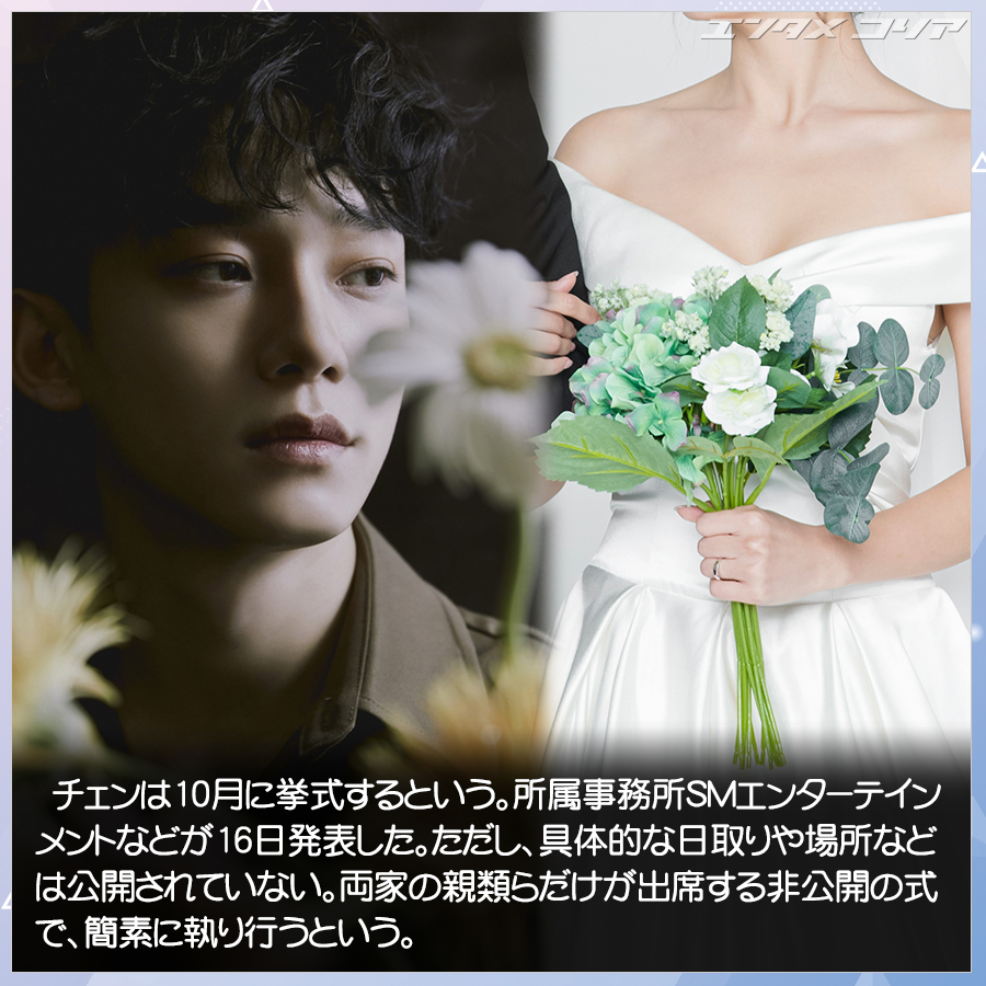 韓流グループEXOのメンバー、チェン(30、本名キム・ジョンデ)が、妻のAさんと法的に夫婦になってからおよそ3年を経てようやく結婚式を挙げる。チェンは10月に挙式するという。所属事務所SMエンターテインメントなどが…