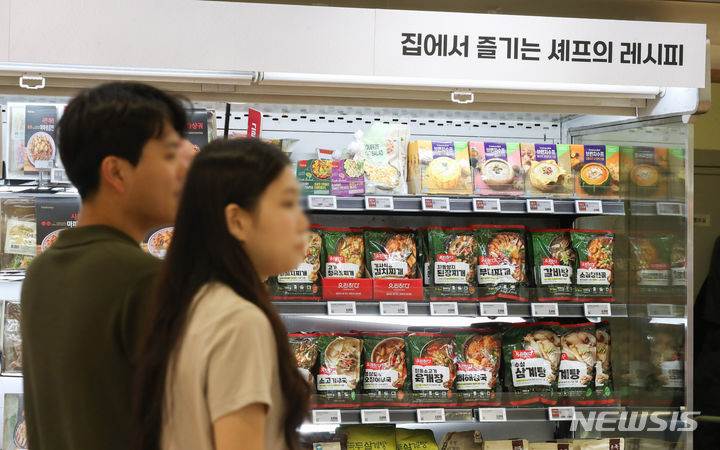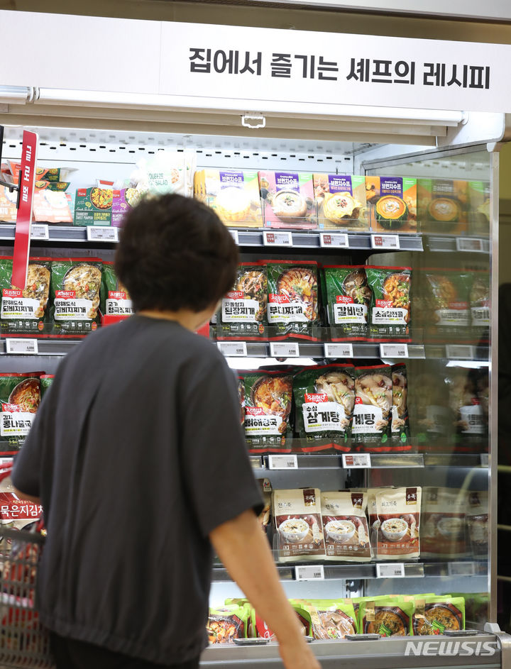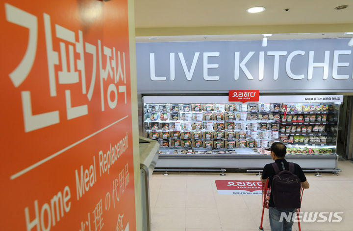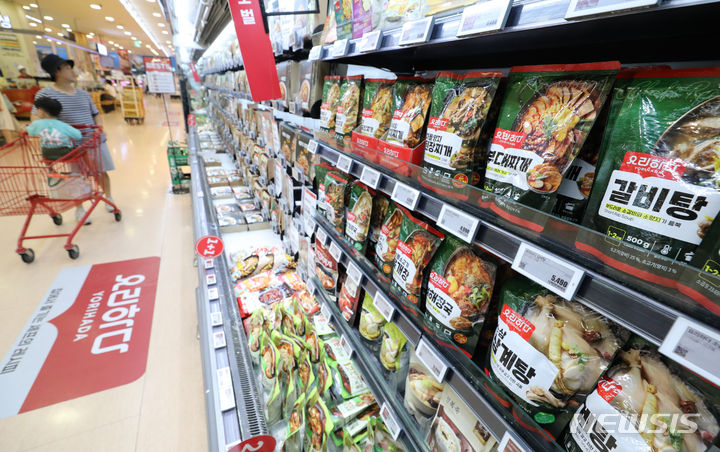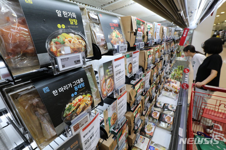 【NEWSIS】20日午前、ソウル市内のある大型スーパーにある半調理品やミールキットの売り場に来た買い物客。急騰する外食代や猛暑で半調理品を買い求める消費者が増えている。