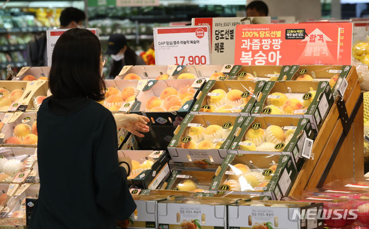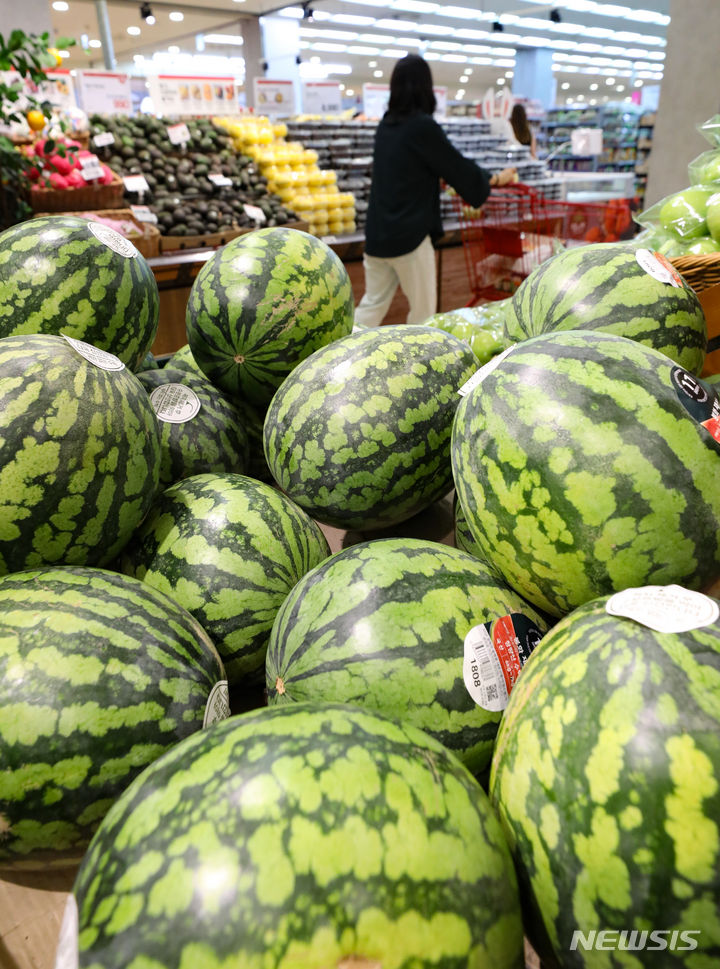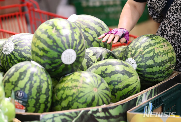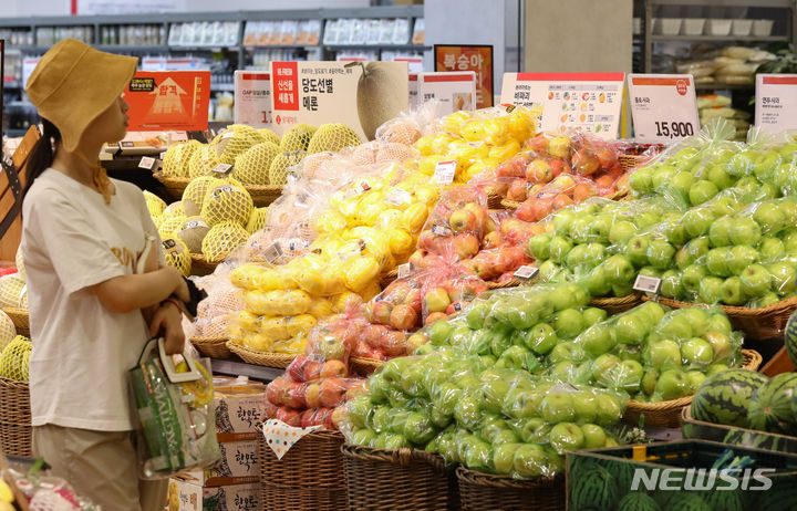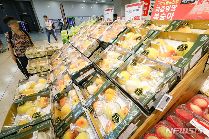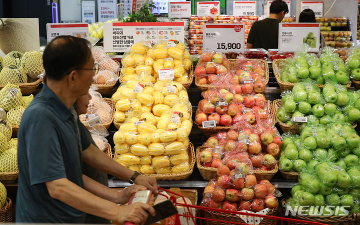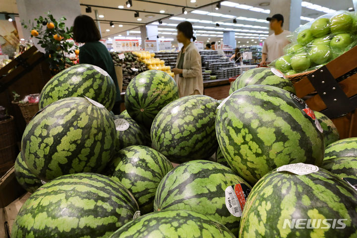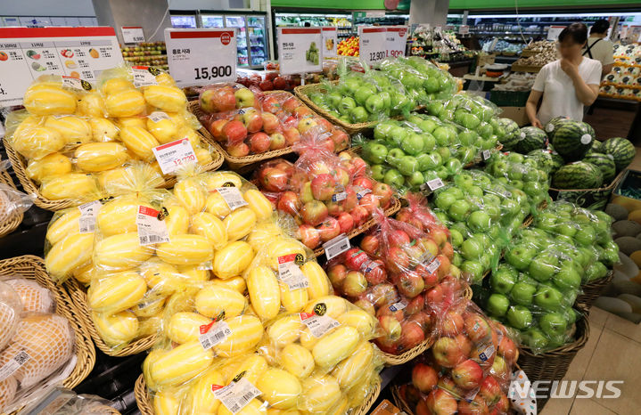 【NEWSIS】今夏は集中豪雨と猛暑により果物の収穫量が減り、果物の価格が上昇している。リンゴの価格は最大で34%上がり、モモは20-40%、スイカも最大57%も急騰するなど、近づく秋夕(中秋節、今年は9月29日)を前に、消費者も頭を抱えている。写真は20日午前、ソウル市内のある大型スーパーの果物売り場の様子。