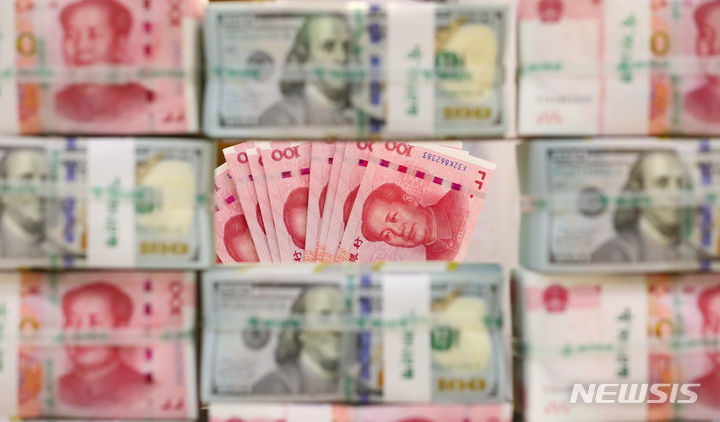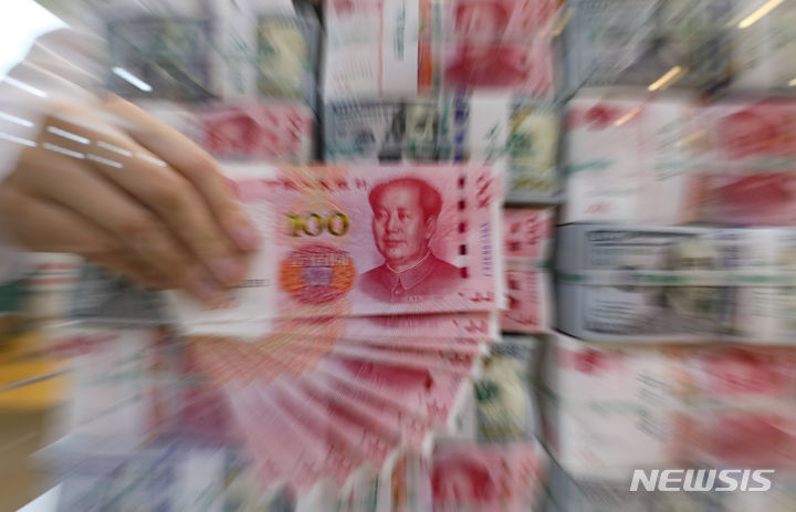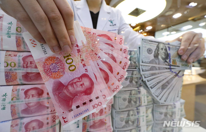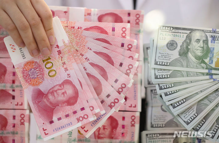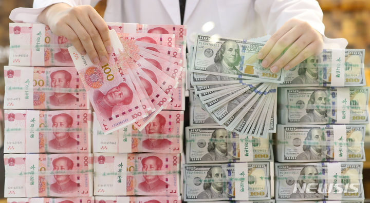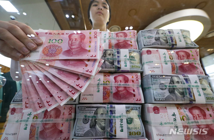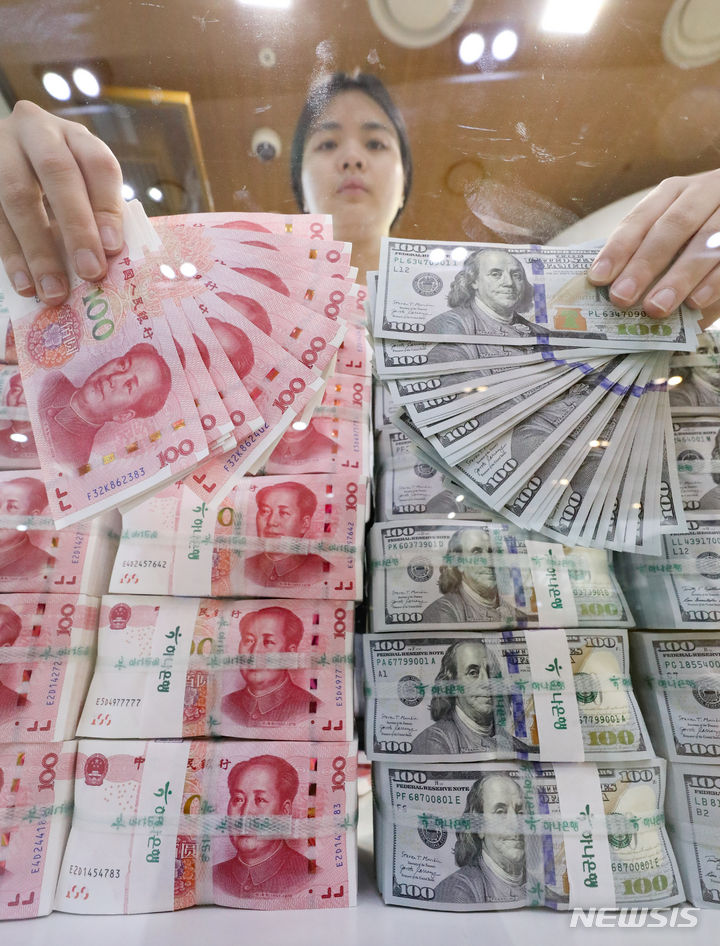 中国元の価値が、16年ぶりのドル高・元安水準となる1ドル7.3元まで下落した。これは、中国人民銀行が、基準金利の役割を果たす最優遇貸出金利(LPR/ローンプライムレート)1年物を、予想引き下げ幅よりも小さい0.1ポイントの引き下げで3.45%としたことの余波だと解されている。写真は21日午後、ソウル市中区のハナ銀行偽変造対応センターで中国元と米ドルを整理している行員の様子。