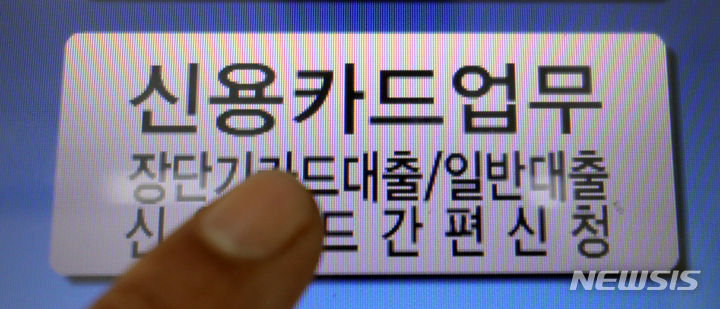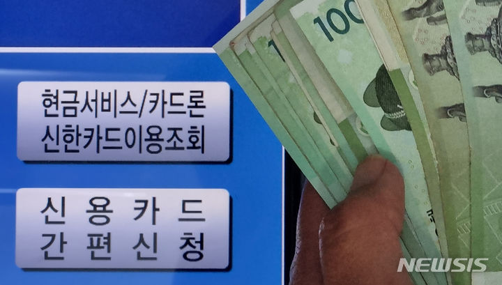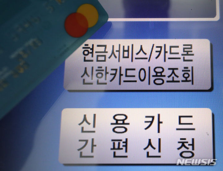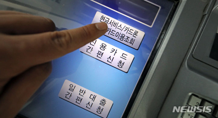 22日に与信金融協会が発表したところによると、カード会社8社(新韓、サムスン、KB国民、現代、ロッテ、ウリ、ハナ、BCカード)の先月末基準のカードローン残額は35兆3952億ウォン(約3兆8500億円)を記録、6月(34兆8468億ウォン=約3兆8000億円)に比べ5483億ウォン(約597億円)増加したという。写真はこの日、ソウル市内のATMに表示されているカードローン案内。