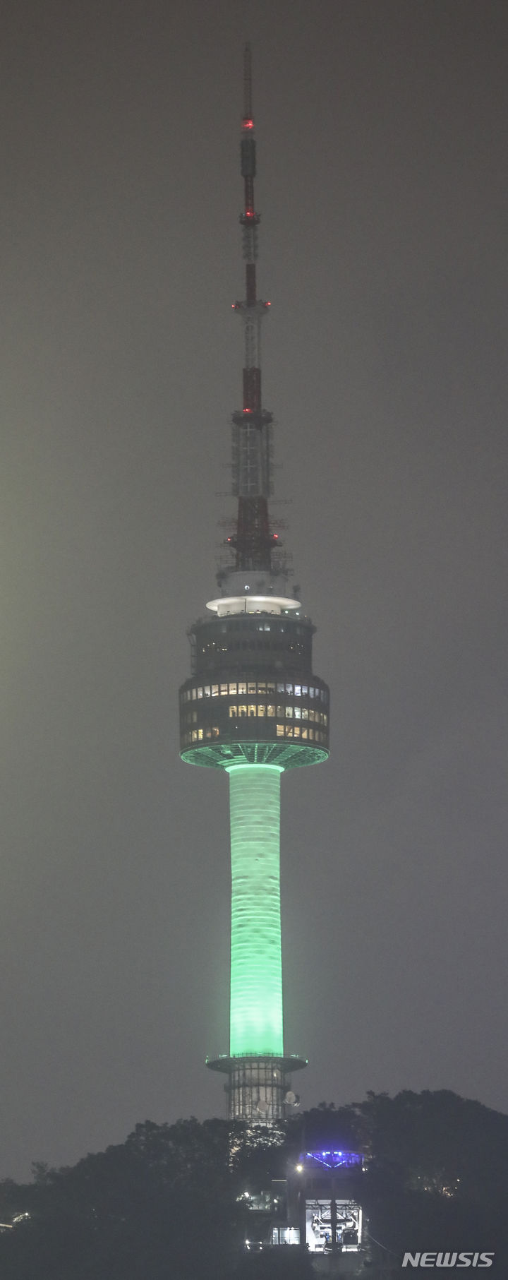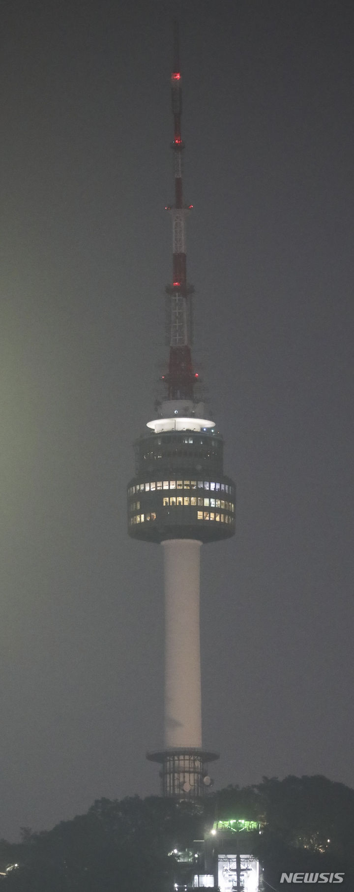 第20回エネルギーの日を迎え、ソウル市内にあるNソウルタワーが22日午後9時から5分間消灯した。写真は、消灯前後のタワーの様子。