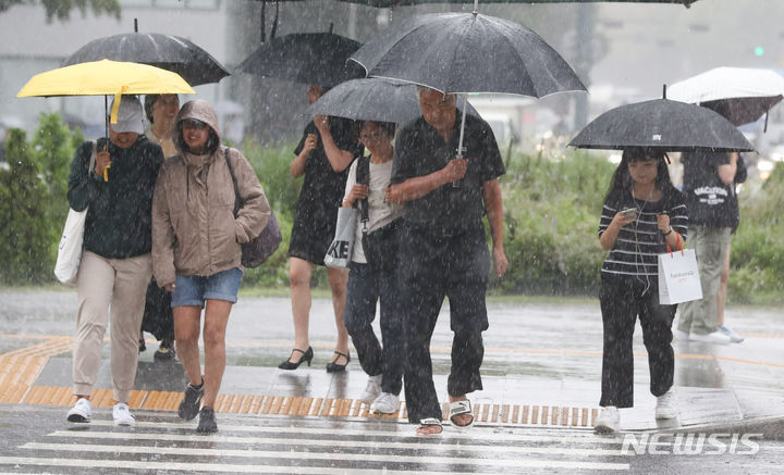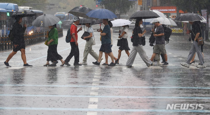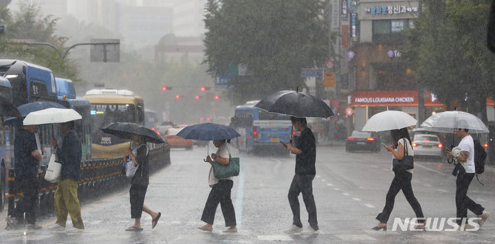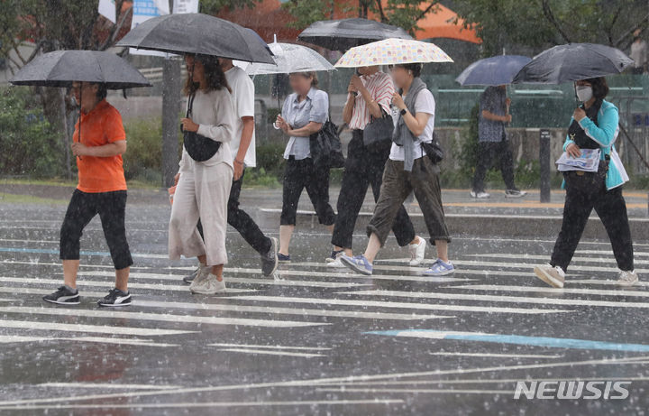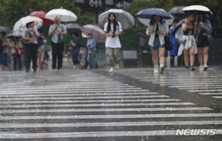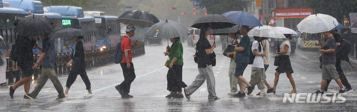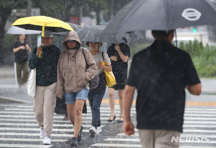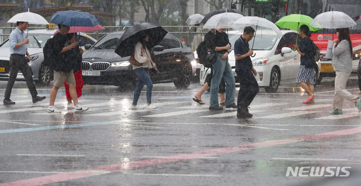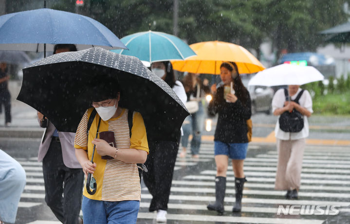 23日午後、ソウル市鍾路区の世宗大路交差点で、雨傘を差して行き交う市民の様子。