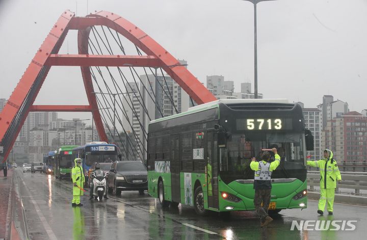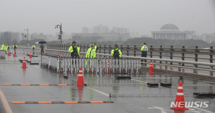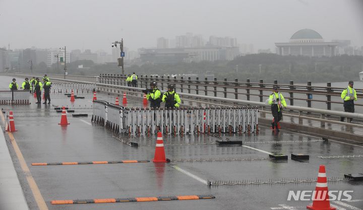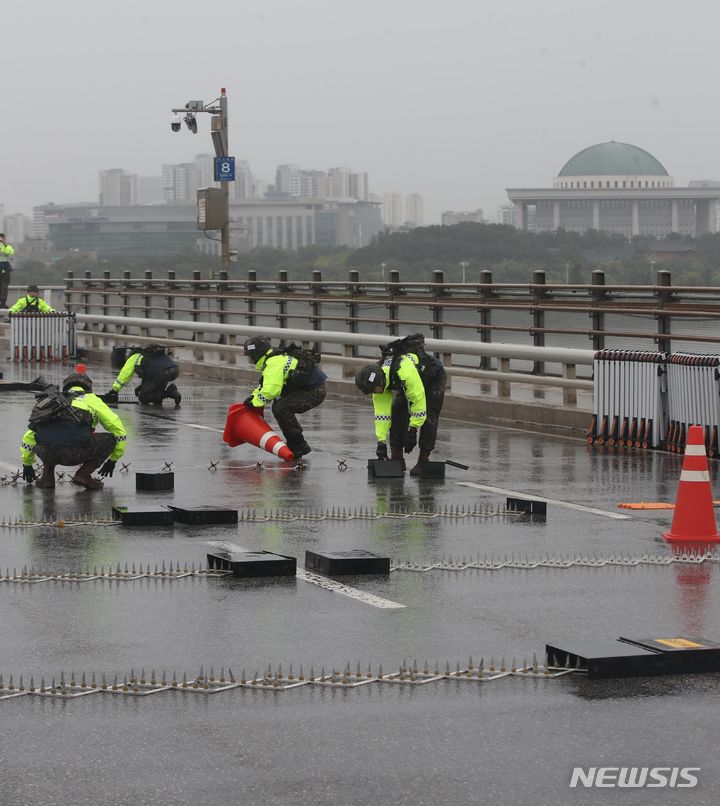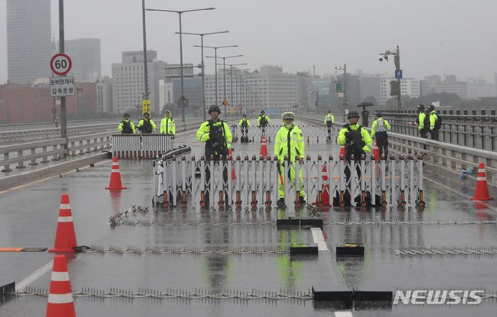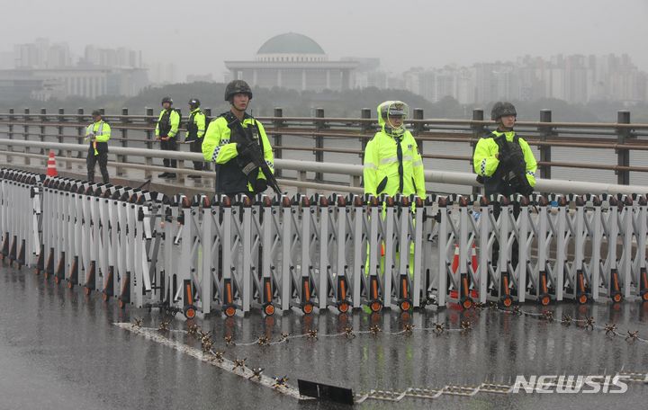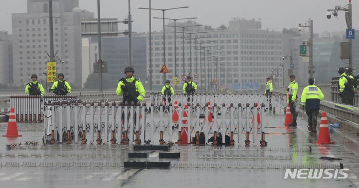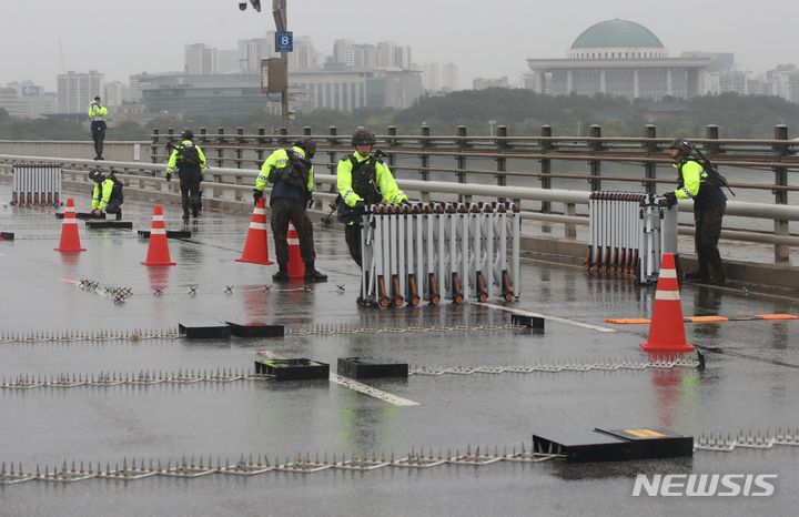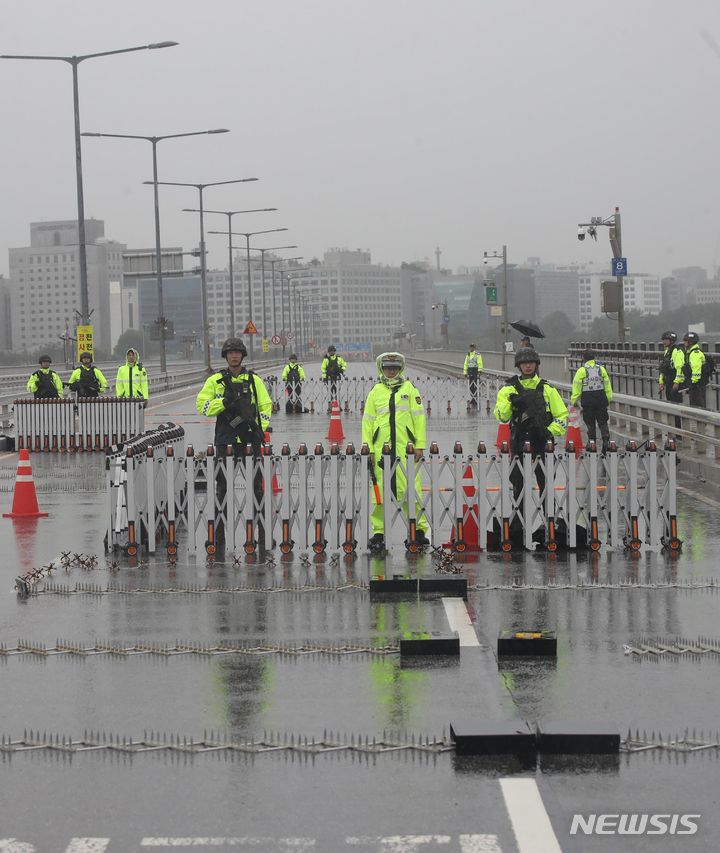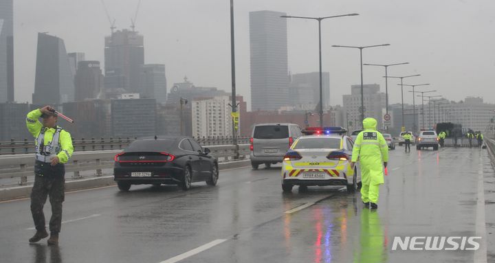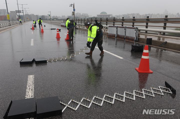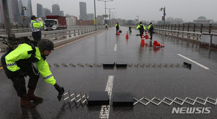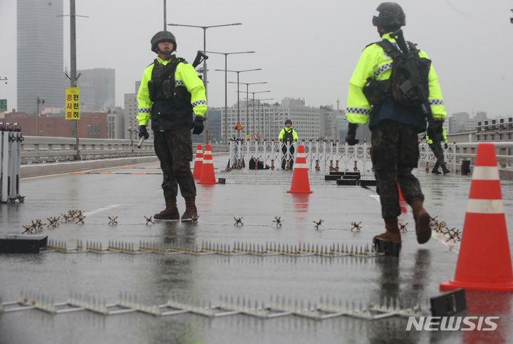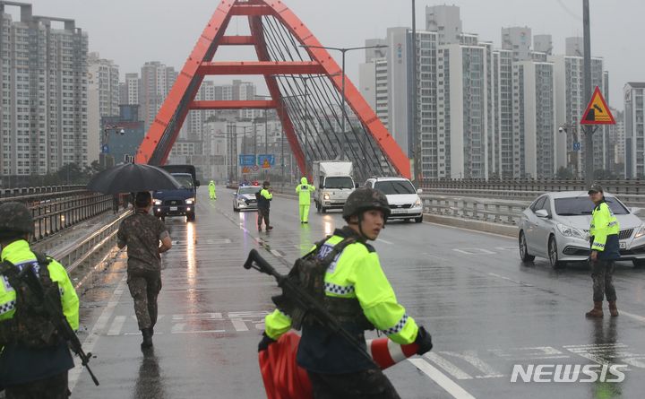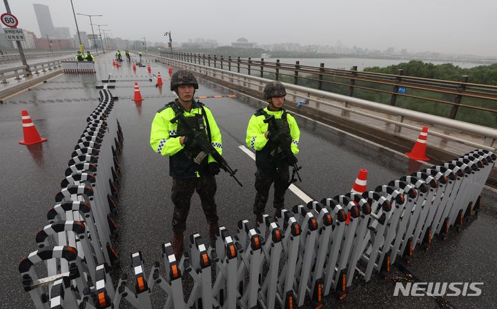 2023乙支演習と連携して民防衛訓練が行われた23日、ソウルの西江大橋で首都防衛司令部所属の兵士たちと警察が合同で交通統制所を設置し、車両を規制している。