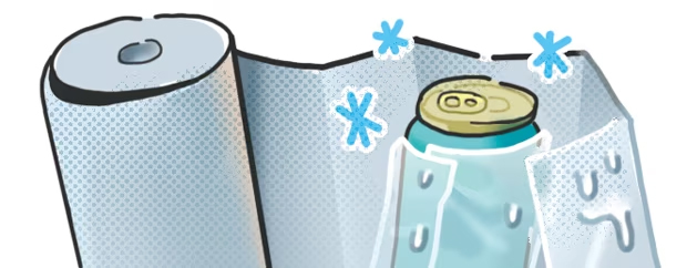 ぬるい缶飲料は水でぬらしたキッチンタオルで包んで冷凍庫に入れると、そのまま冷やすよりも早く冷たくなる。