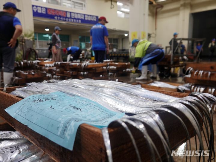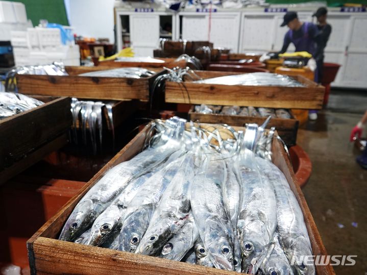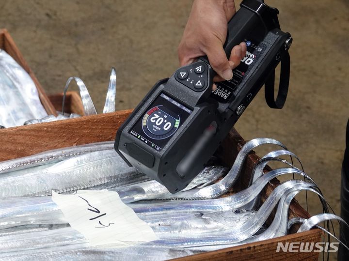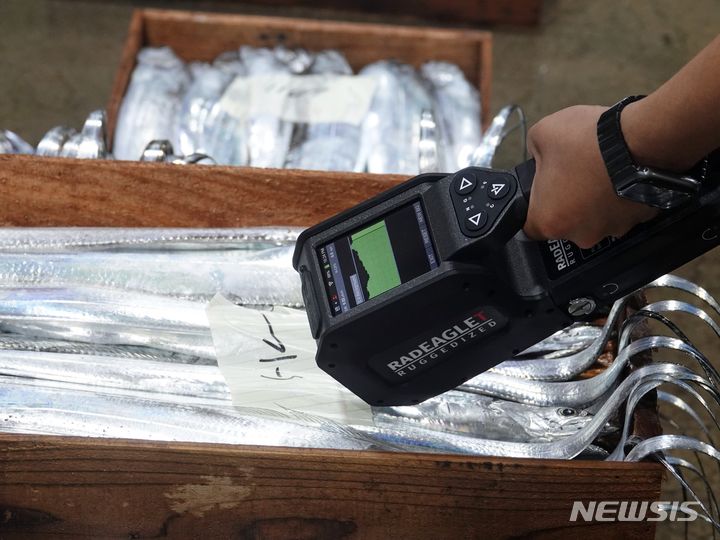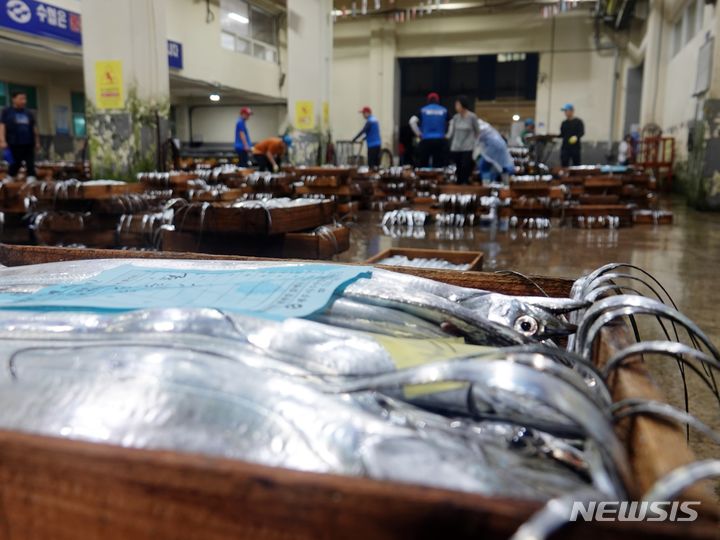【NEWSIS】日本による福島原発汚染水の海洋放出が予定されている24日午前、済州市水産業共同組合の水産物市場で、水産物の競りの準備をする職員たち。組合側は携帯用放射能検査装置を使い、競りの前に放射線検査を実施する方針だ。