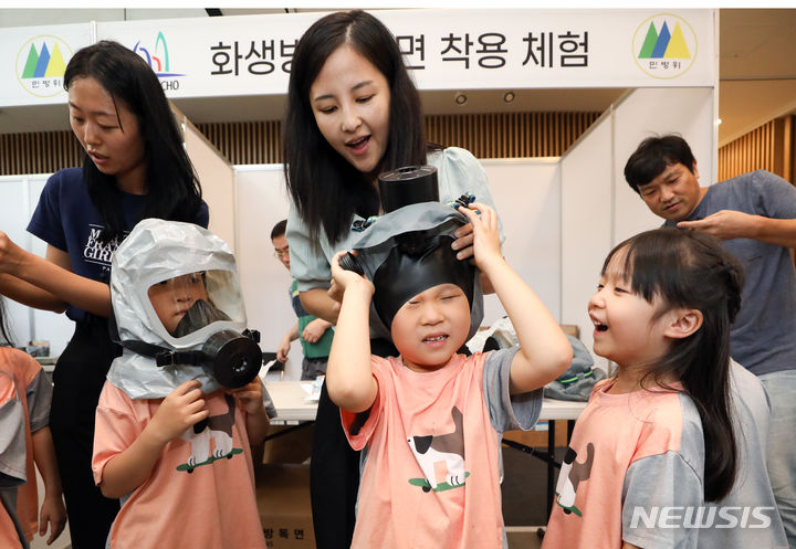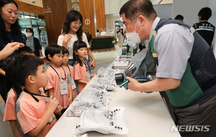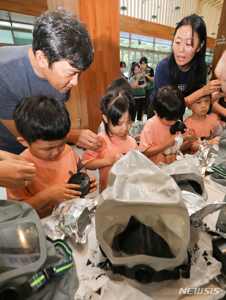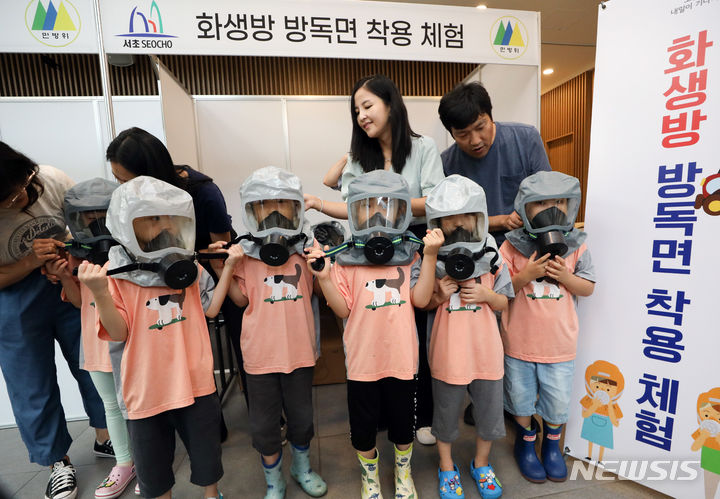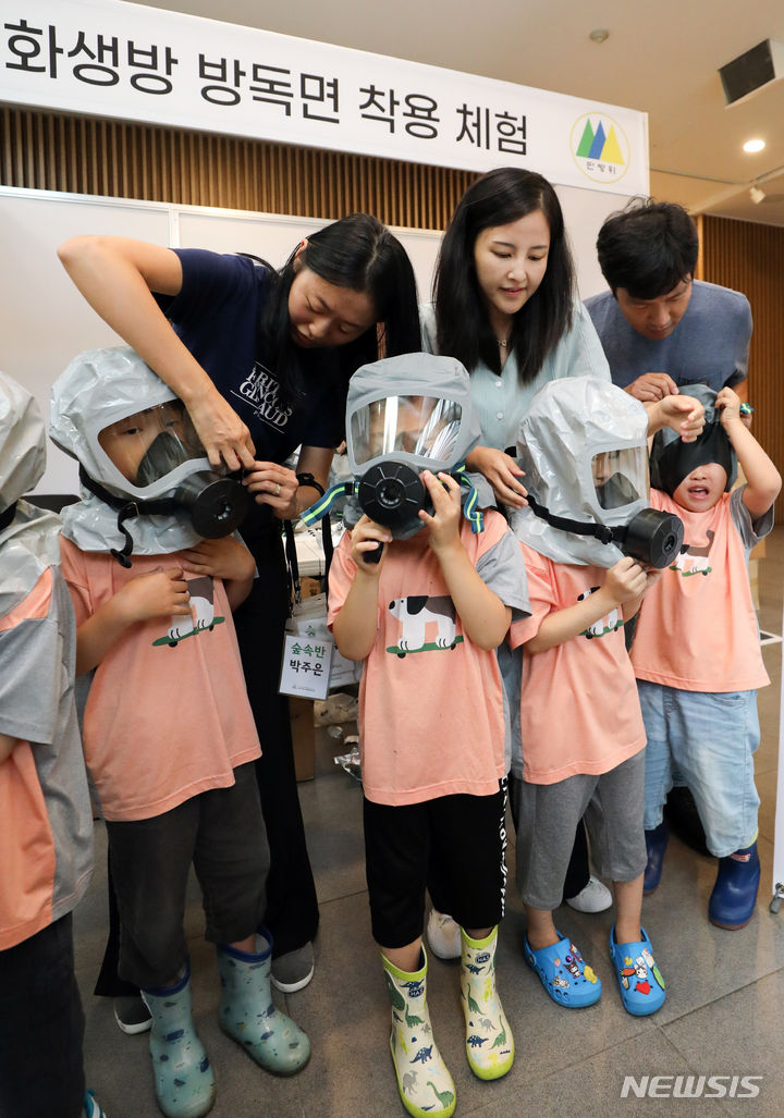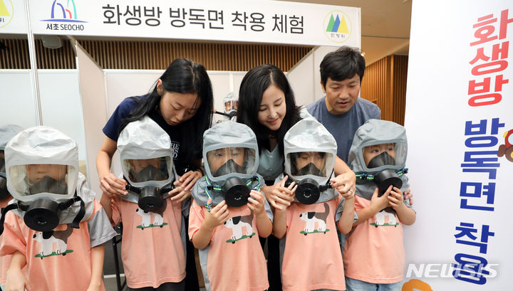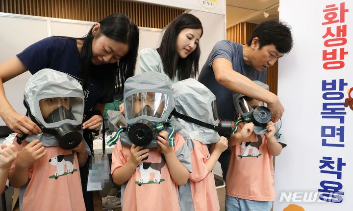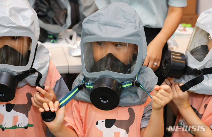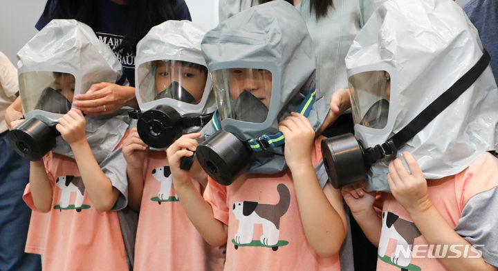 乙支訓練最終日の24日、ソウル市瑞草区庁のロビーで行われた「瑞草区乙支練習安保体験イベント」で、子どもたちが化学・生物・放射能に備える防毒マスク着用体験に臨んだ。今回のイベントは、瑞草区が乙支訓練の期間を迎えるに当たり、住民や子どもたち、若者たちに安保精神を伝えるために企画した。