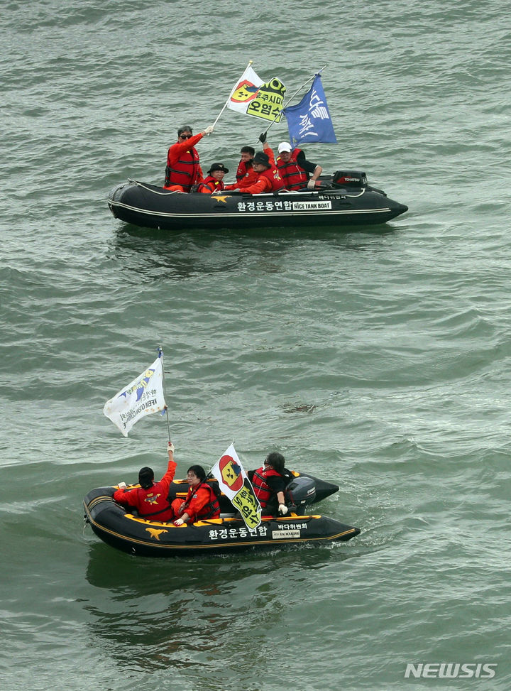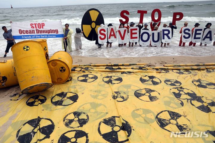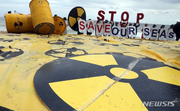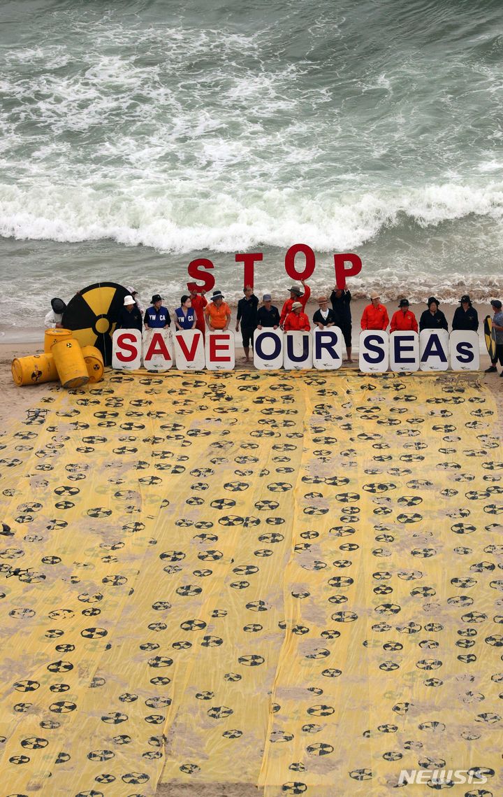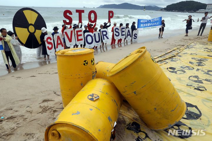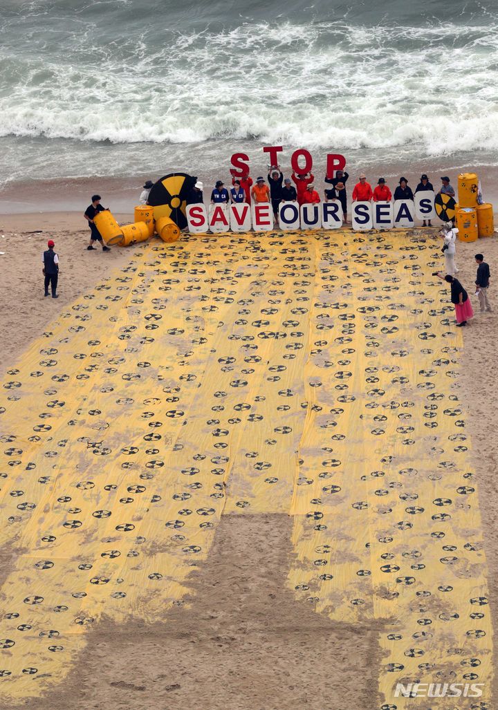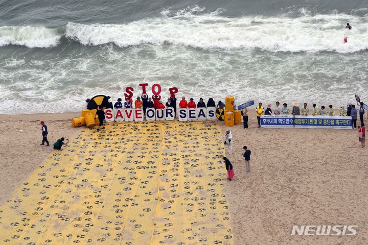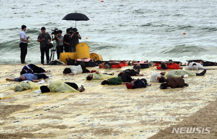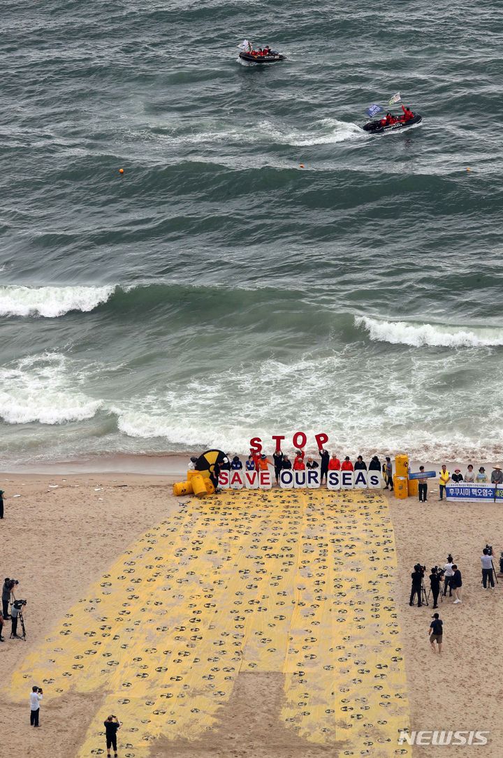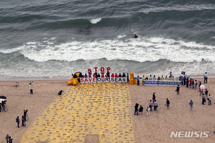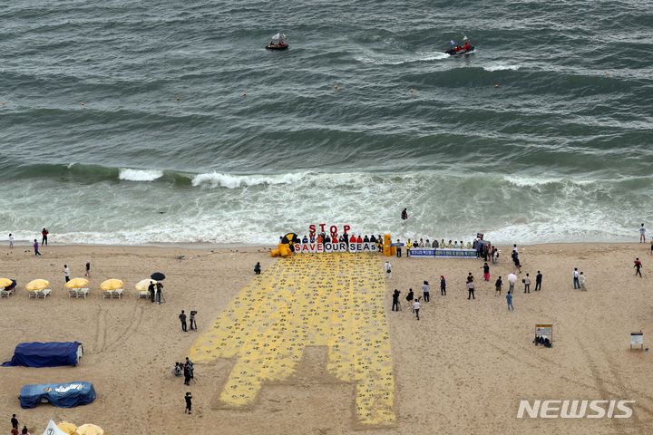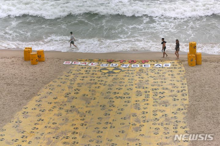 日本が福島原発汚染水海洋放流を開始した24日、釜山市海雲台区の海雲台海水浴場で環境運動連合海委員会など複数の環境団体・市民団体の活動家らが、黄色のビニールなどを用いて原発の汚染水が釜山沖に押し寄せることを表現しつつ、海洋投棄反対のキャンペーンを展開している。