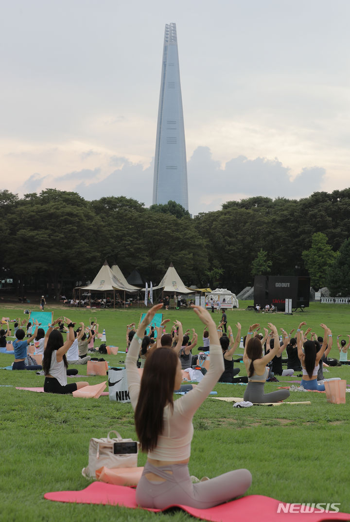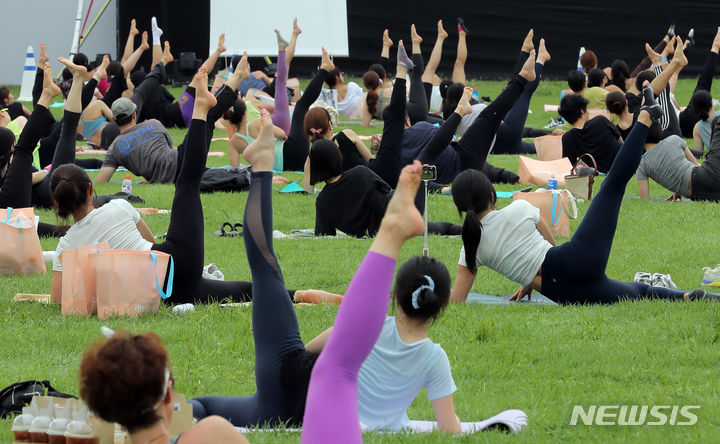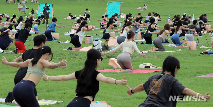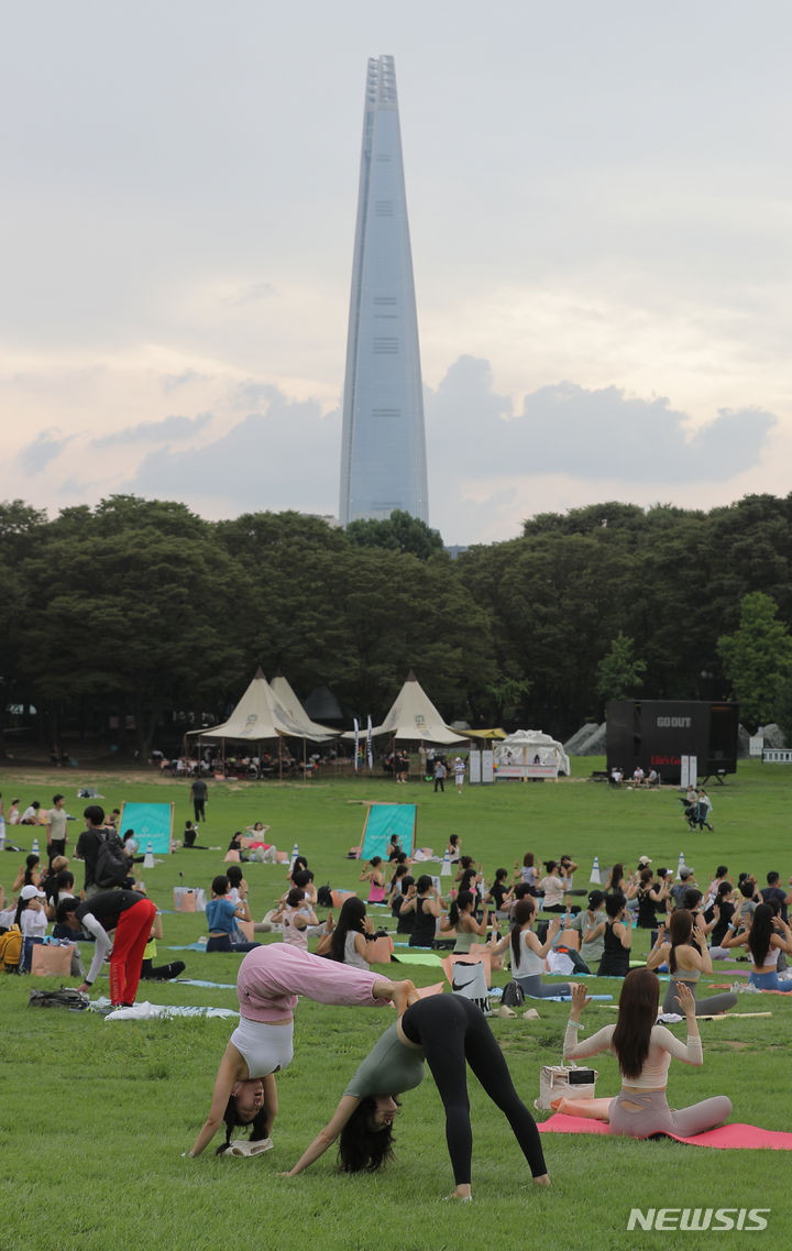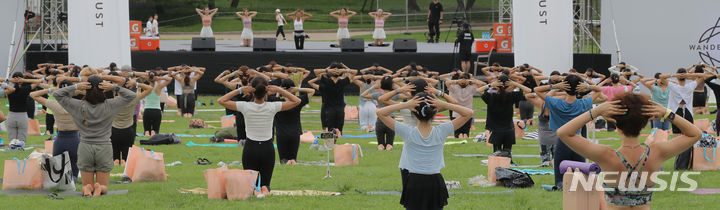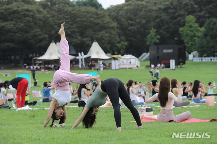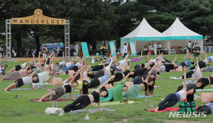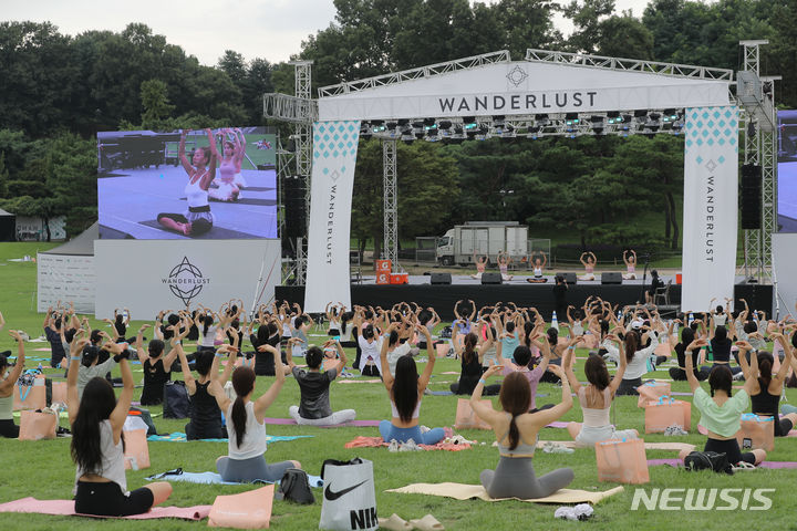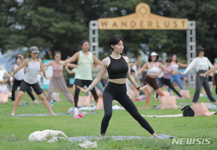 【NEWSIS】27日午後、ソウル市松坡区のソウルオリンピック公園88広場で、ウェルネス・フェスティバル「WANDERLUST KOREA(ワンダーラスト・コリア)2023」が行われた。写真はヨガのレッスンを受ける人々。