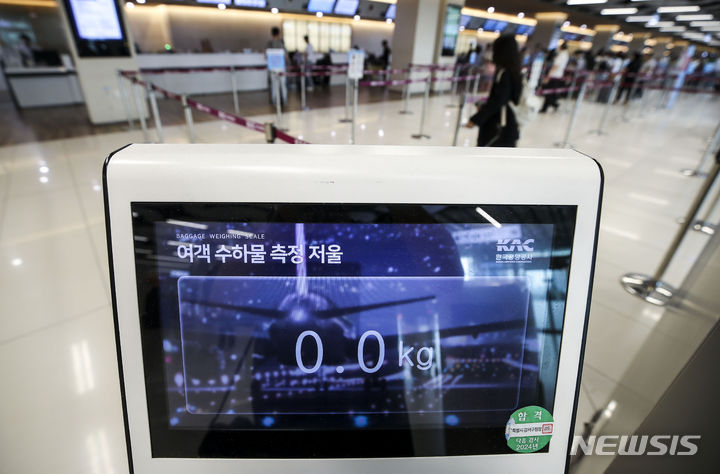 韓国国土交通部の「航空機重量および平衡管理基準」により、航空各社は少なくとも5年周期または必要時に乗客標準重量を測定して平均値を出さなければならない。写真は27日、ソウル市江西区の金浦国際空港の国内線大韓航空搭乗手続き窓口近くに設置されたはかり。