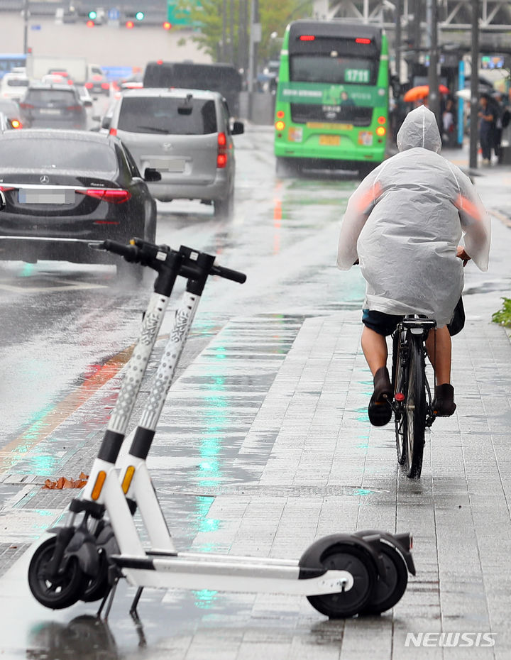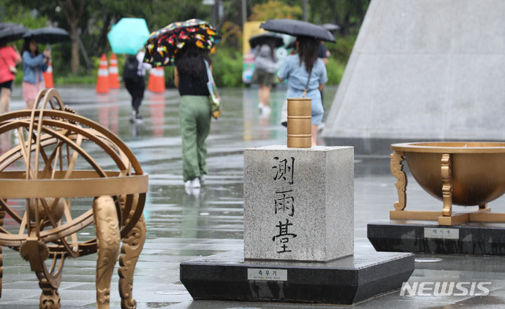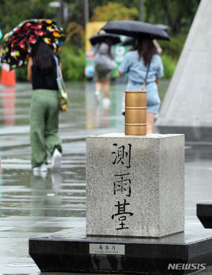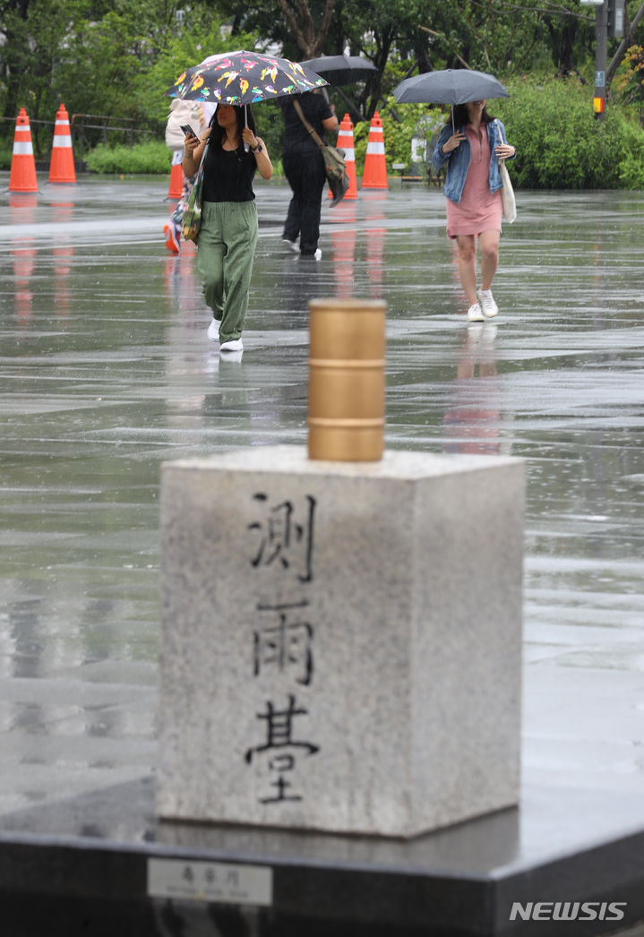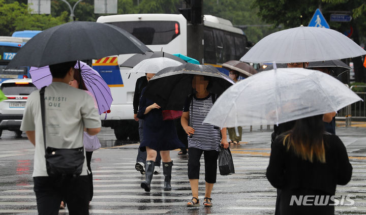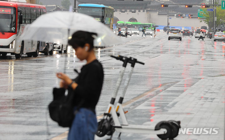 韓国各地で雨天となった28日午前、ソウルの世宗大路では、雨の中、市民が傘を差して行き交っていた。韓国気象庁によれば、29日までは低気圧の中心に近い韓国中部地方、そして大気下層の強い風によって地形の影響が大きくなる慶尚北道北部と智異山付近、済州島の山地を中心にかなりの雨が降るものとみられる。