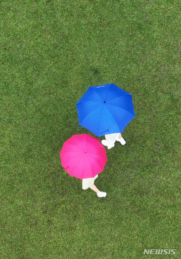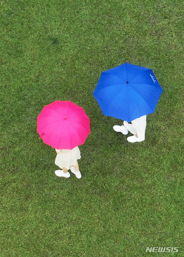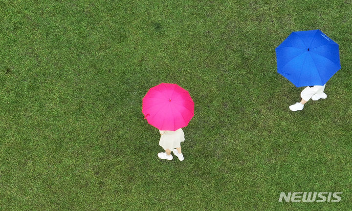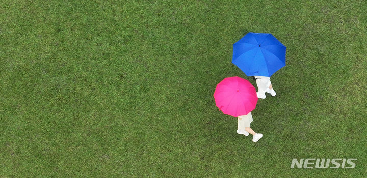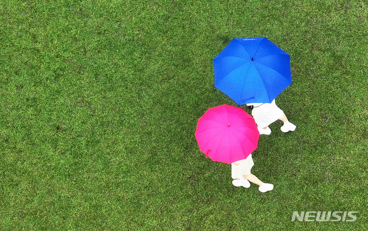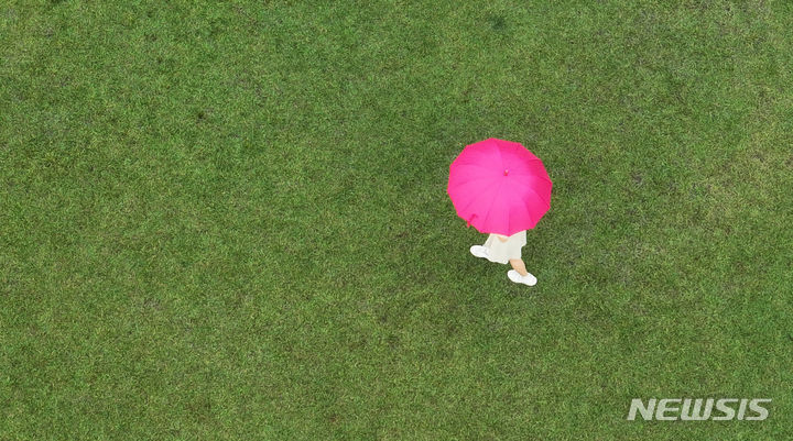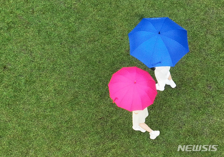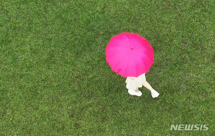 韓国各地に雲がかかって雨が降った28日、京畿道水原市八達区の京畿道庁旧庁舎で、雨傘を差して歩く市民の様子。