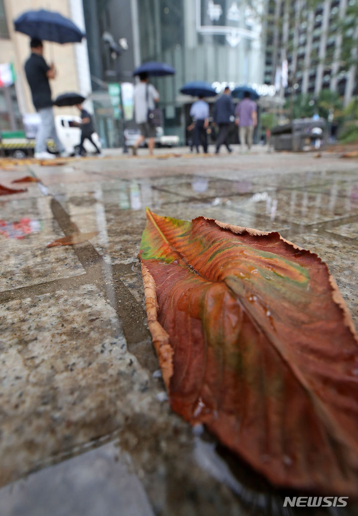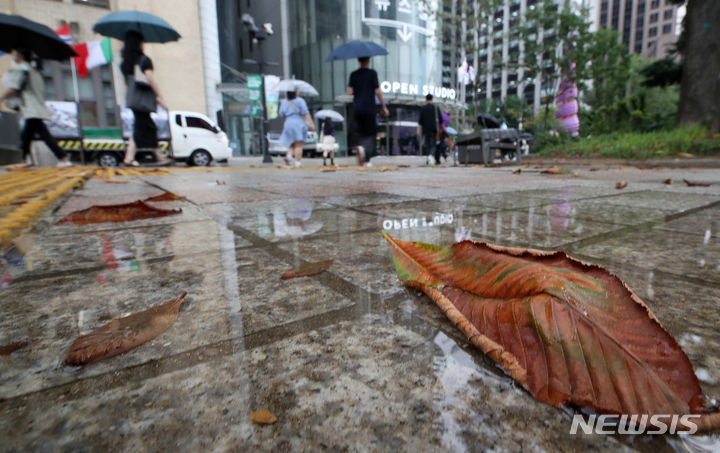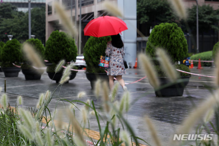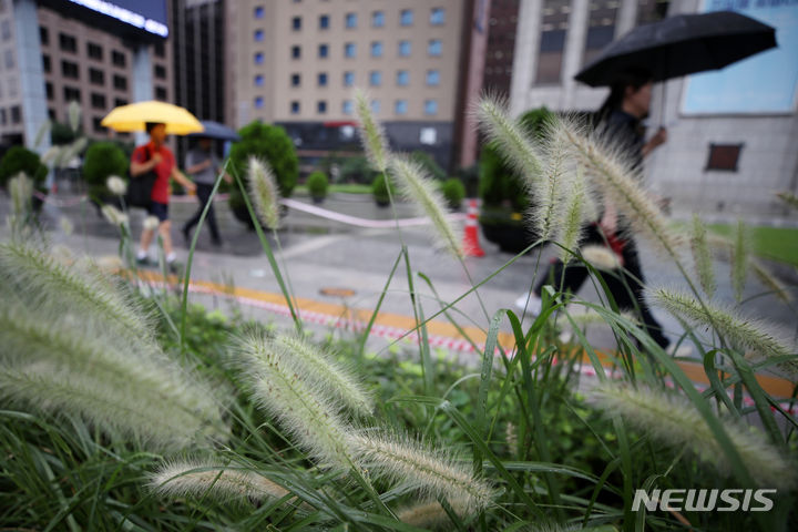【NEWSIS】全国的にくもりや雨が多かった29日午前、ソウル市鍾路区の世宗大路近くで、雨の中を傘をさして歩く人々。