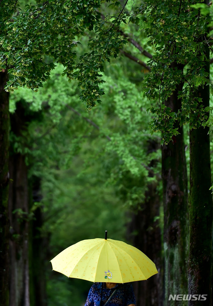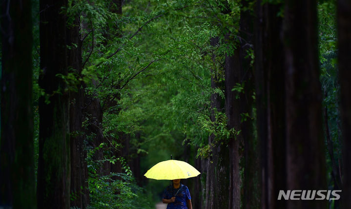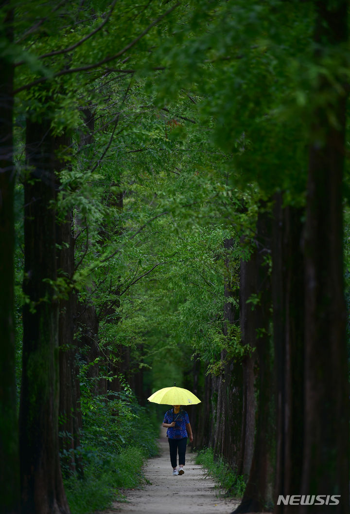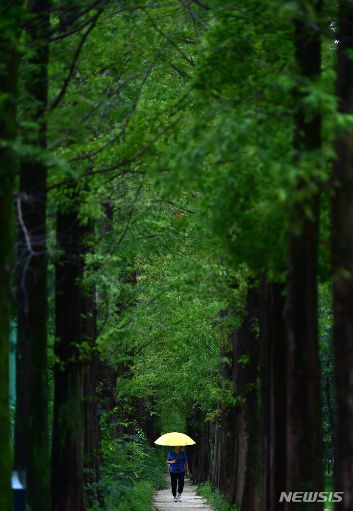 秋雨が降った29日午後、大邱市達西区の虎山公園で、傘を差してメタセコイアの林の道を歩く市民の様子。