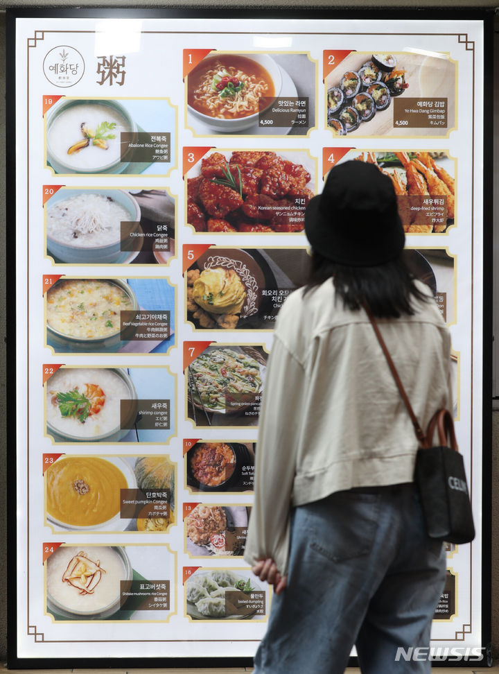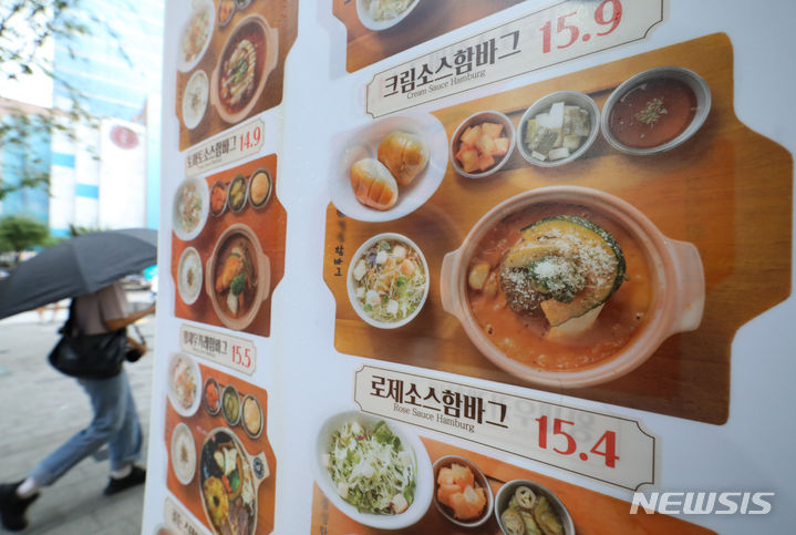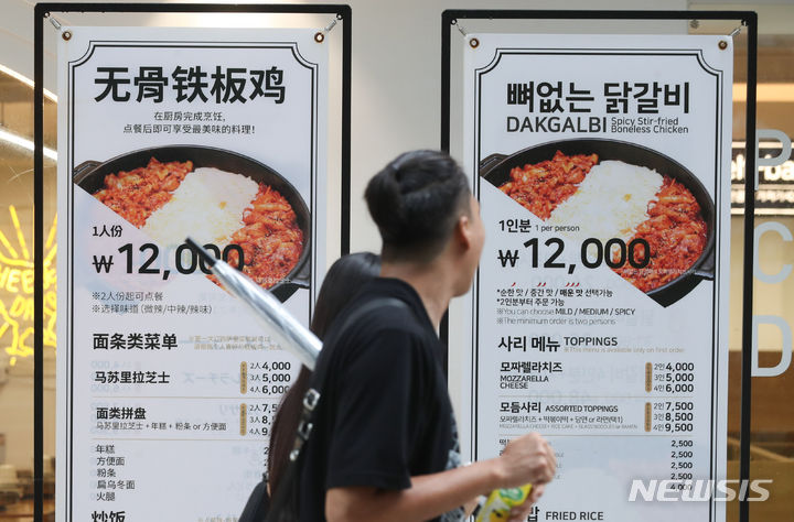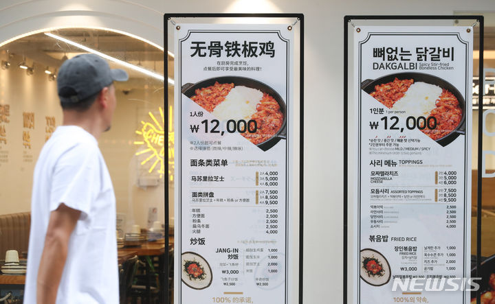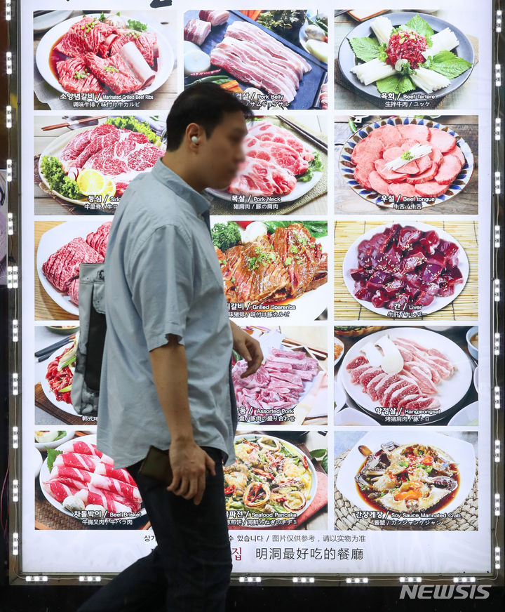 ソウル市中区は今年10月から、「ぼったくり根絶」のため明洞一帯を価格表示義務地域に指定する。区では9月を過渡期間とし、未履行の店に対して10月から最大1000万ウォン(現在のレートで約110万円)の過料を賦課する計画だ。写真は30日午前、ソウル市中区明洞の、価格が記載された飲食店広告物の様子。