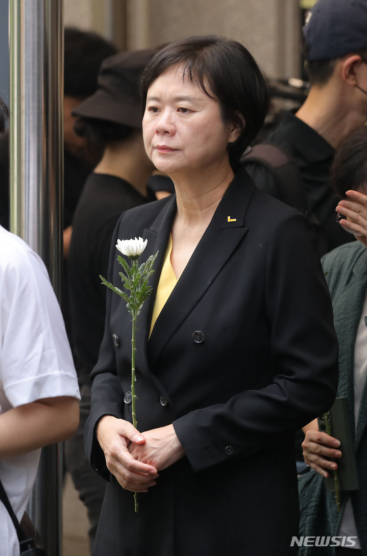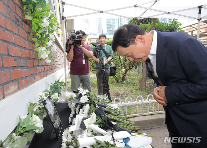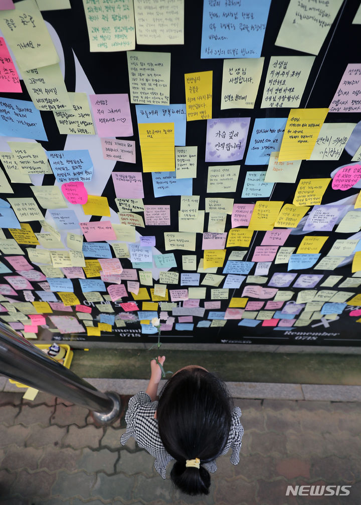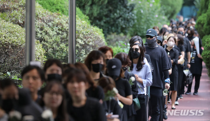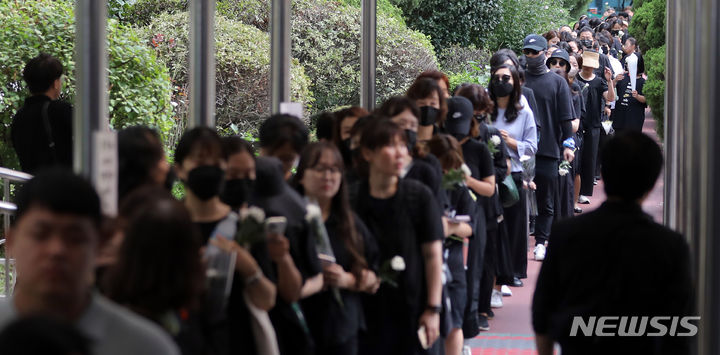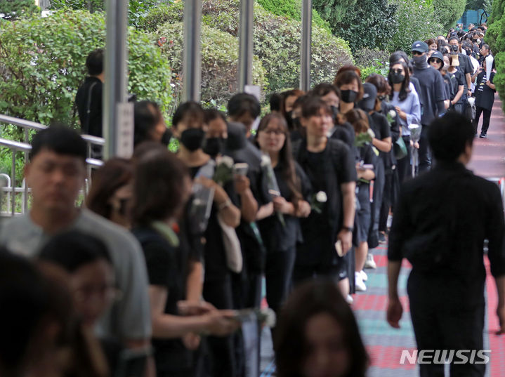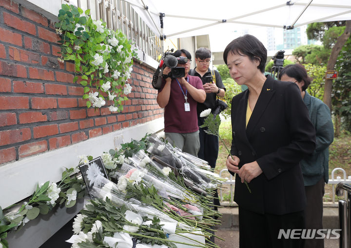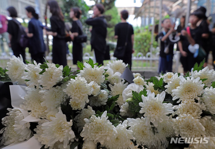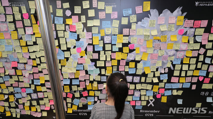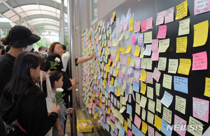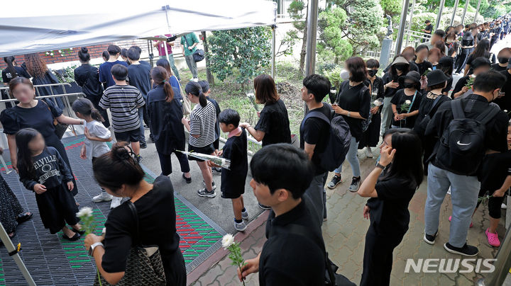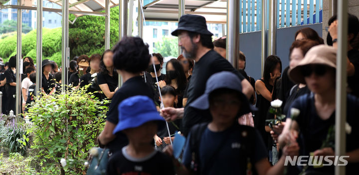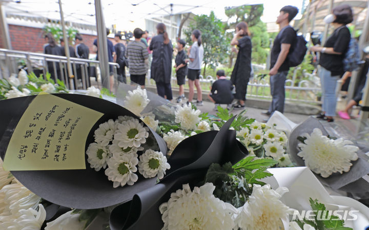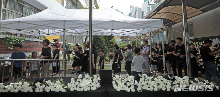 死亡した瑞二小教師の四十九日に当たる4日午前、ソウル市瑞草区の瑞二小では、追悼に訪れた人々が列を作っていた。