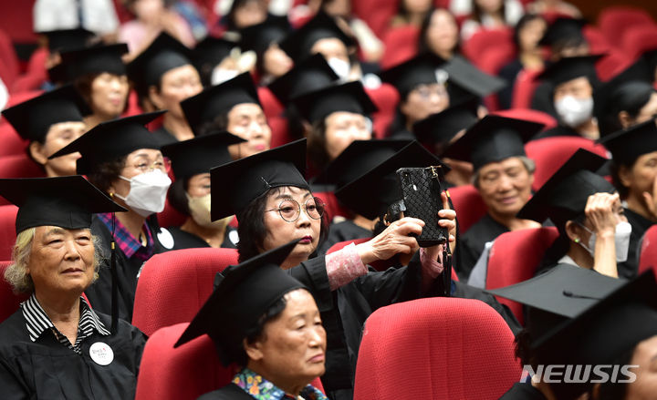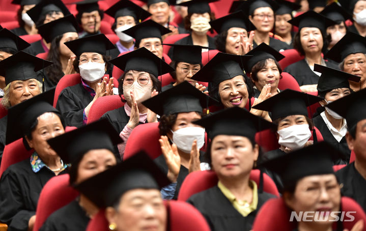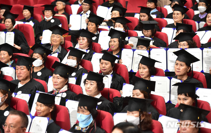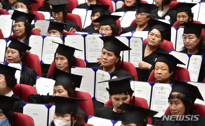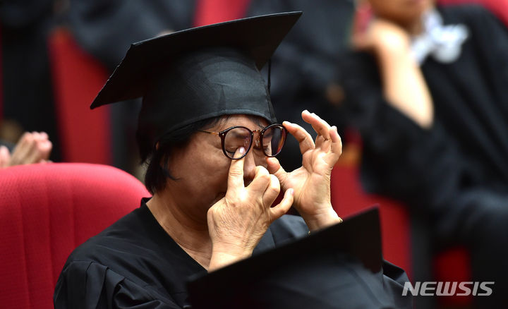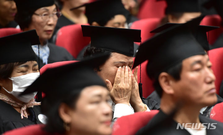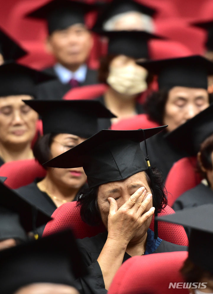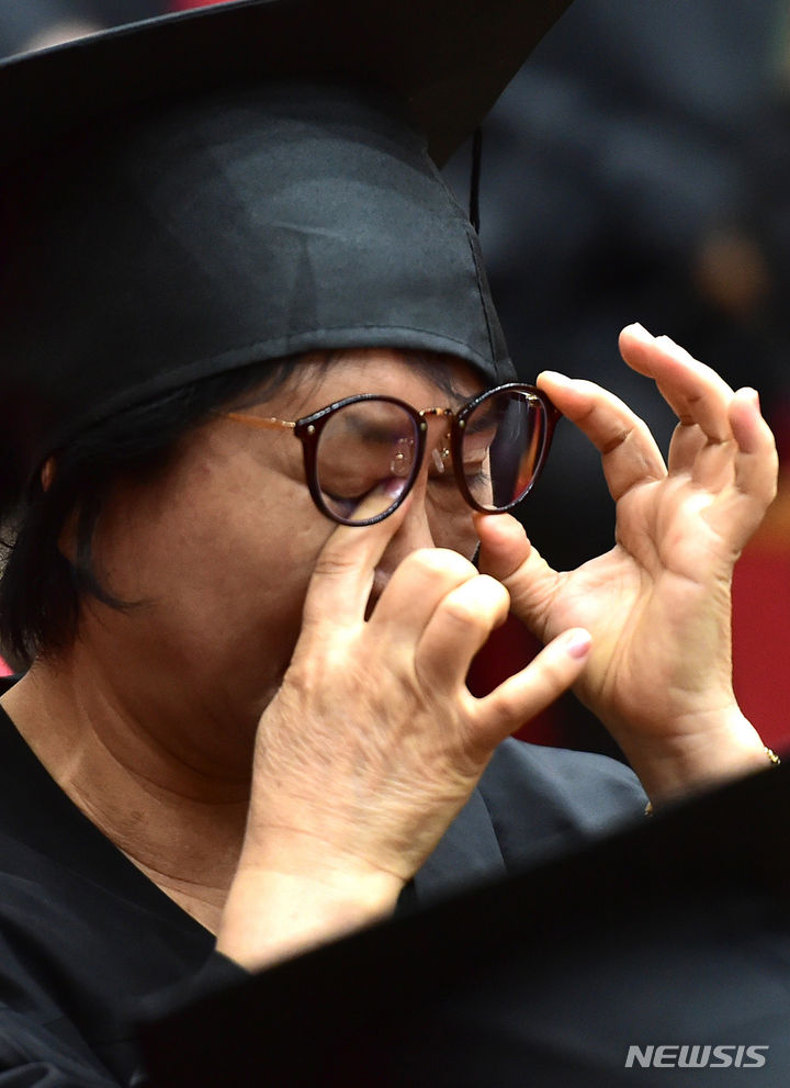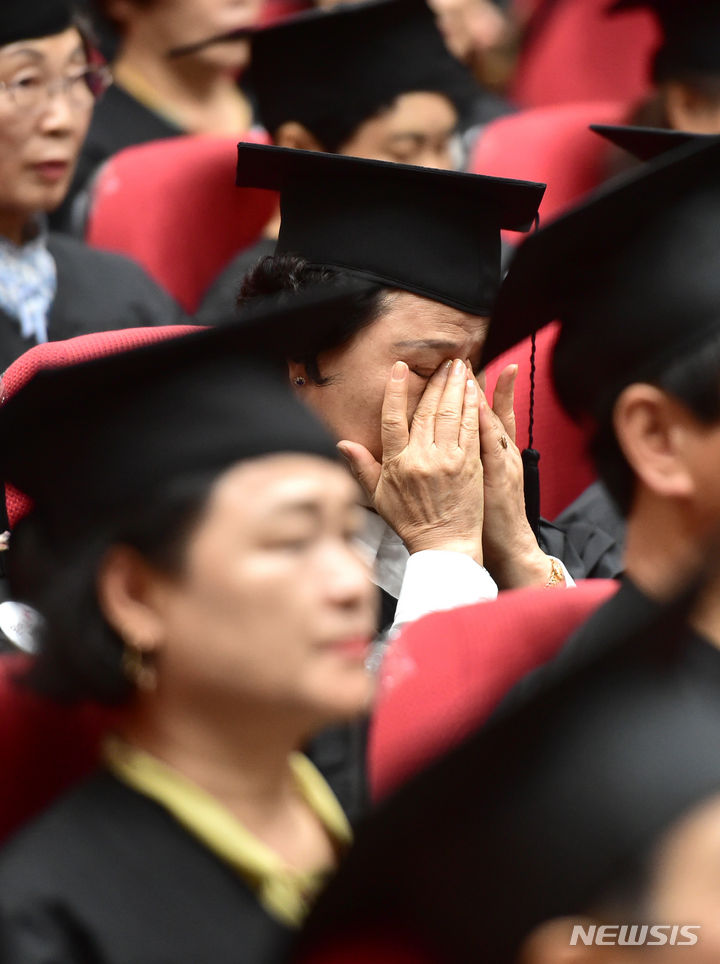 6日、大邱市教育庁幸福館で開かれた「大邱 あしたの学校初等第11回・中学第8回卒業式」に出席して涙をぬぐう卒業生らの様子。「あしたの学校」は、学びの機会を逃した成人のために、大邱市教育庁が初等・中学学力認定プログラムを運営している教育機関だ。