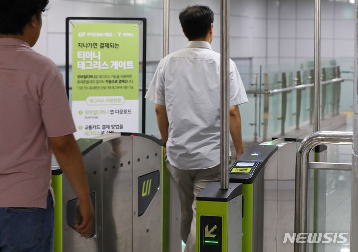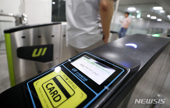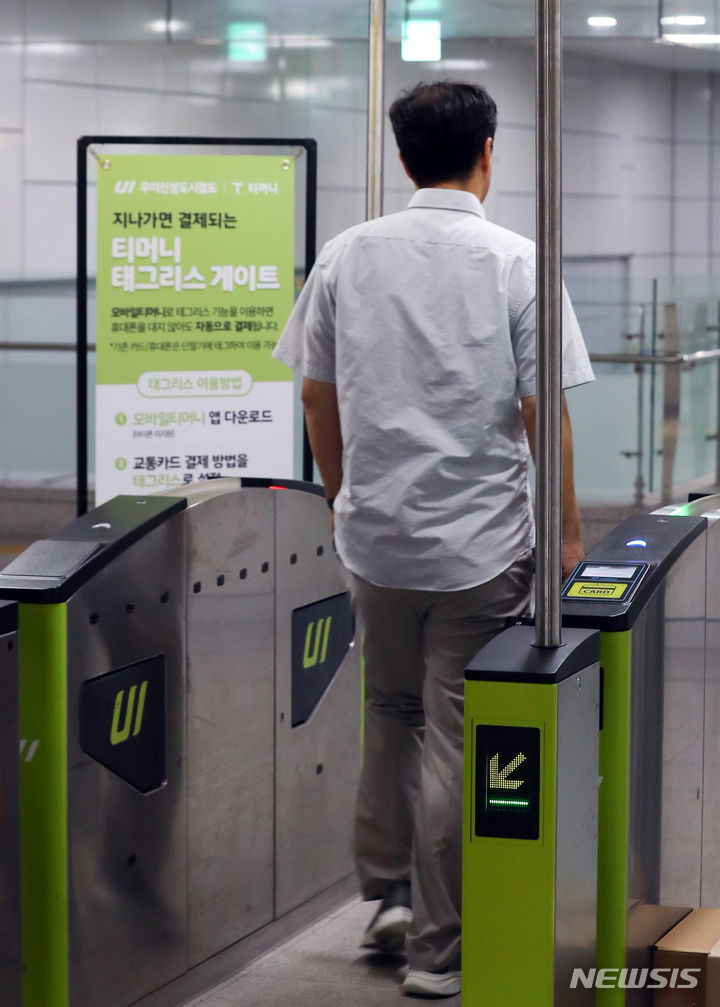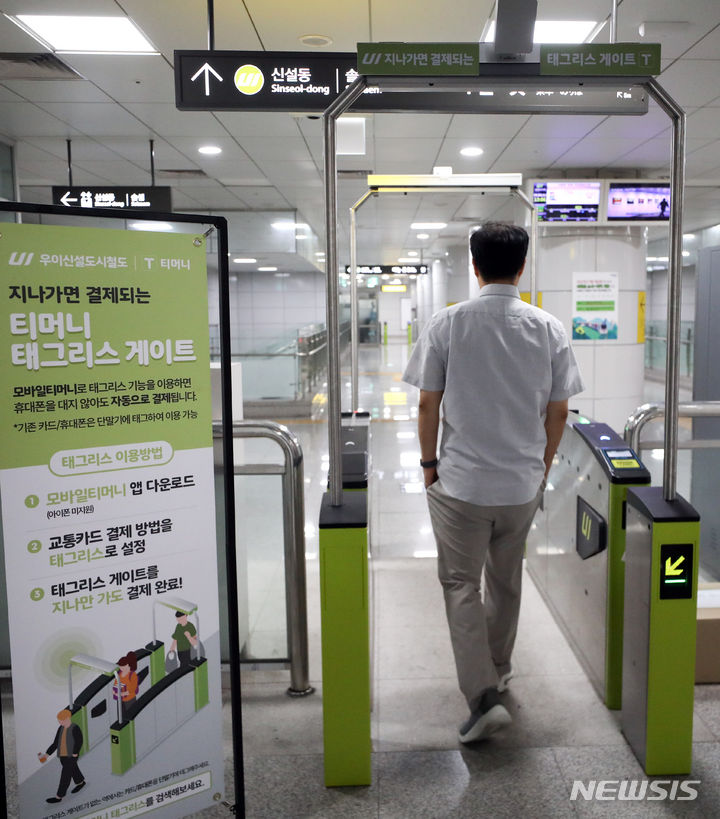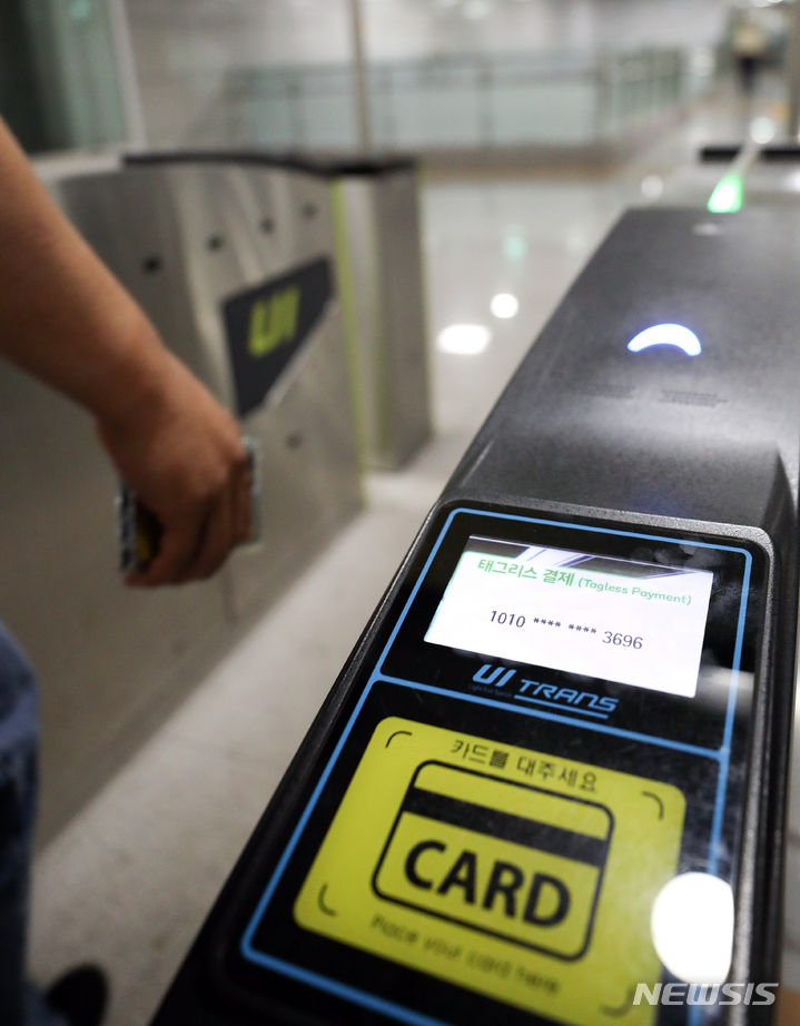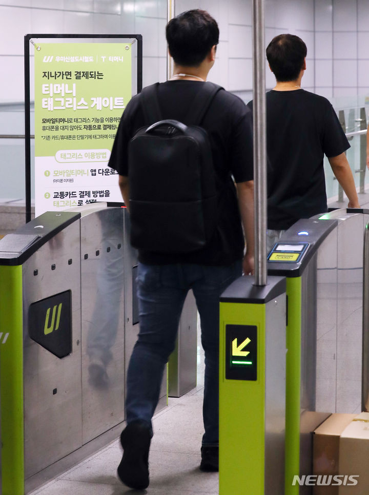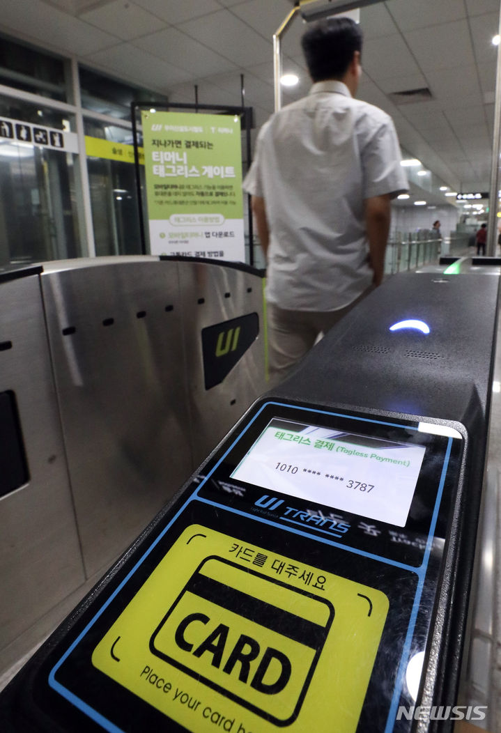 6日、ソウル市江北区の牛耳新設線三陽サゴリ駅に設置されたTマネー・タグレス(Tagless)ゲートで、関係者がスマートフォンのアプリを設定した後、交通カードやスマートフォンのタグなしで改札口を通過している様子。ソウル地下鉄牛耳新設軽電鉄で試行されるタグレス決済サービスは、地下鉄の自動改札でBluetooth通信によって利用者のモバイルTマネー情報を認識し、自動で料金が差し引かれる仕組み。Androidを搭載したスマートフォンでアプリを設定すれば利用できる。