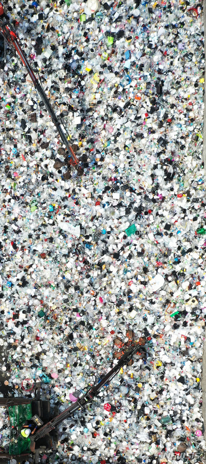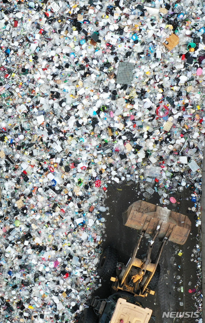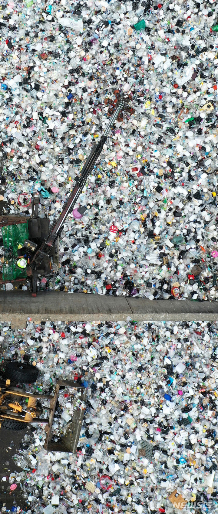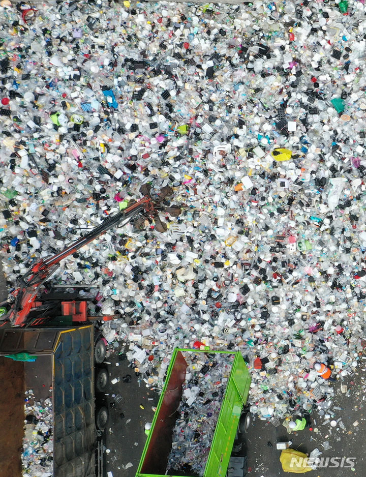 「資源循環の日」に当たる6日、京畿道水原市の資源循環センターで、ぎっしり積み上げられたプラスチック廃棄物をリサイクルするため作業員が入搬出作業を行っている様子。「資源循環の日」は、廃棄物も大切な資源だという認識を高め、生活の中における実践の重要性をPRするため、韓国政府が2009年から指定・記念している日だ。