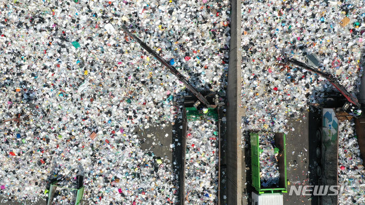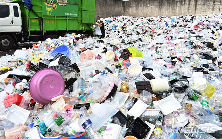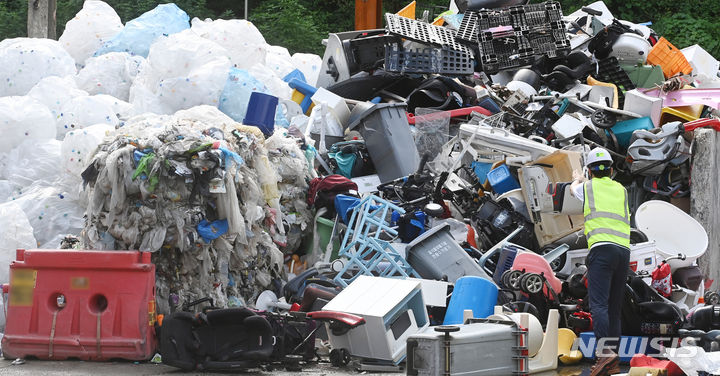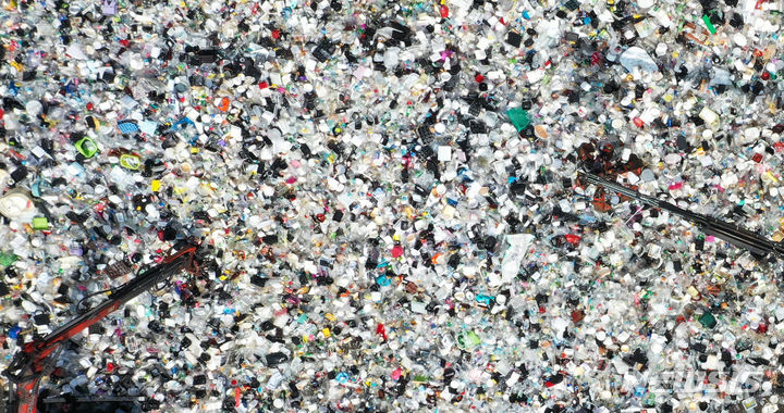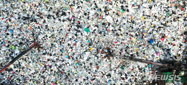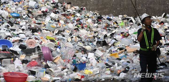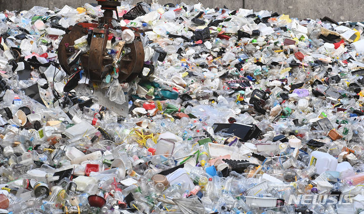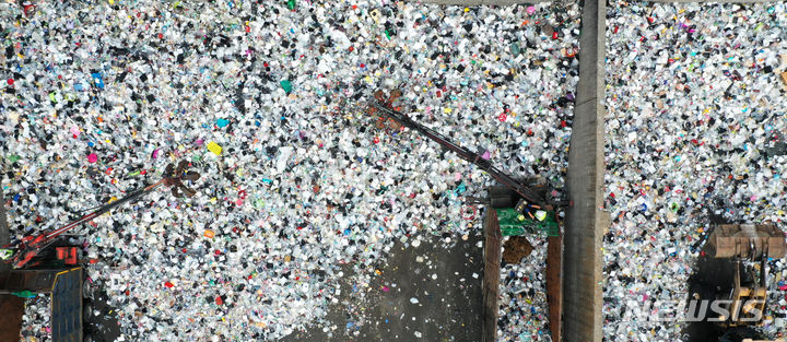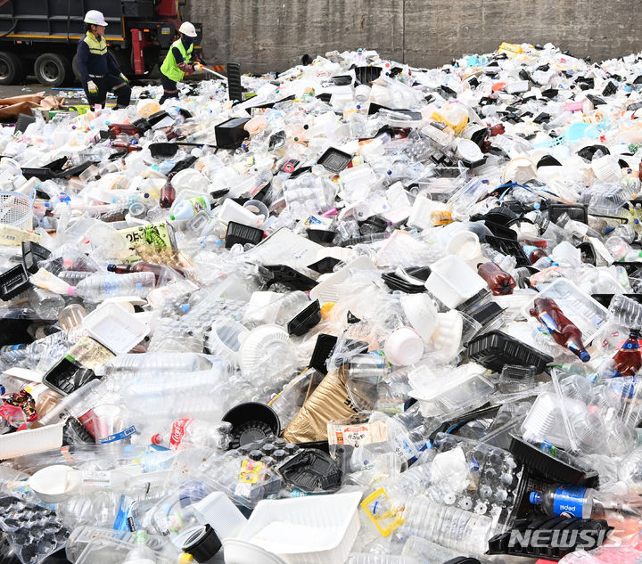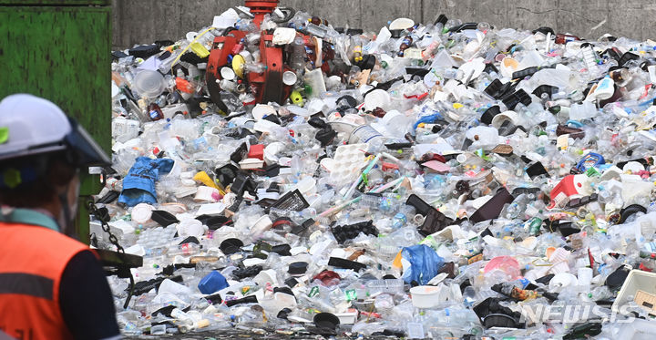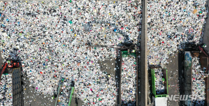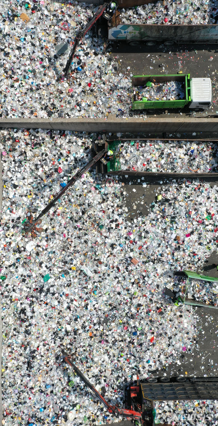 「資源循環の日」に当たる6日、京畿道水原市の資源循環センターで、ぎっしり積み上げられたプラスチック廃棄物をリサイクルするため作業員が入搬出作業を行っている様子。「資源循環の日」は、廃棄物も大切な資源だという認識を高め、生活の中における実践の重要性をPRするため、韓国政府が2009年から指定・記念している日だ。