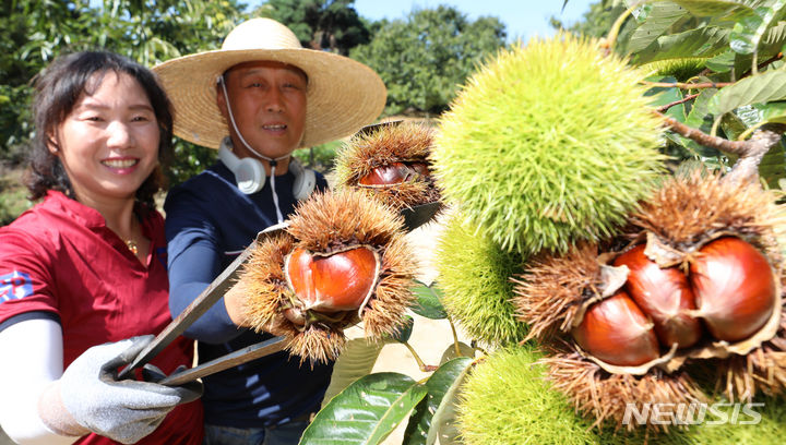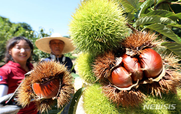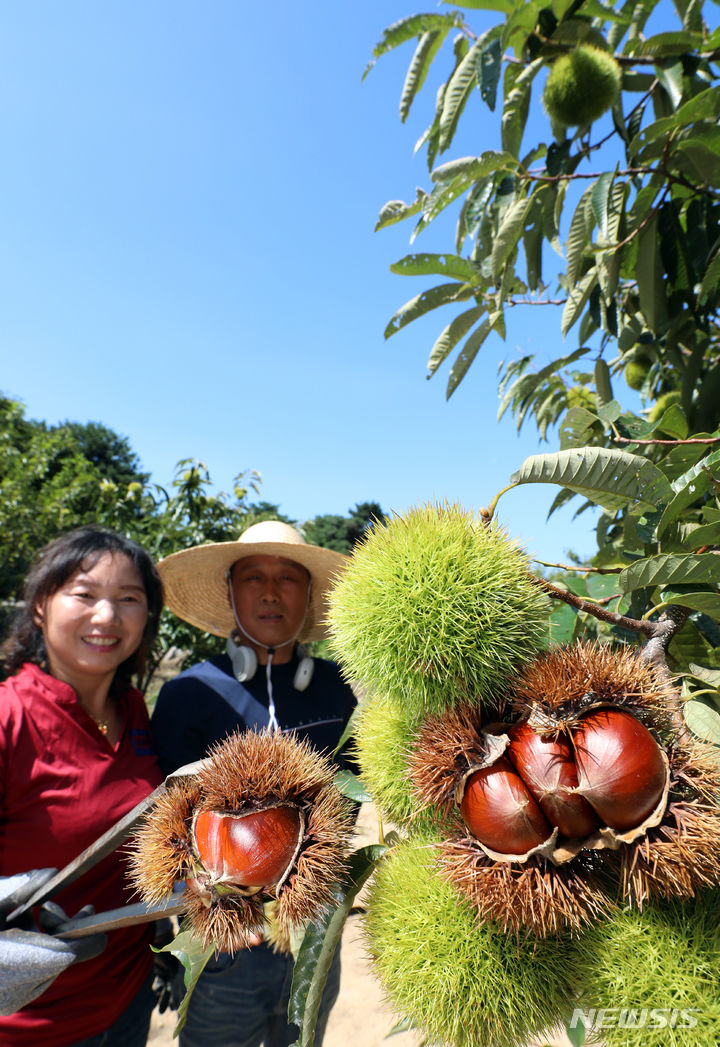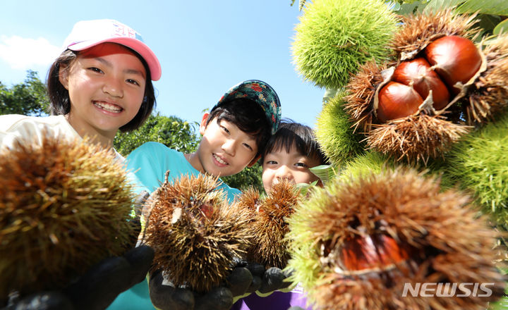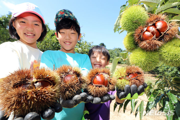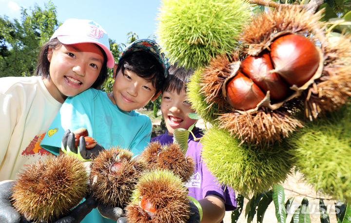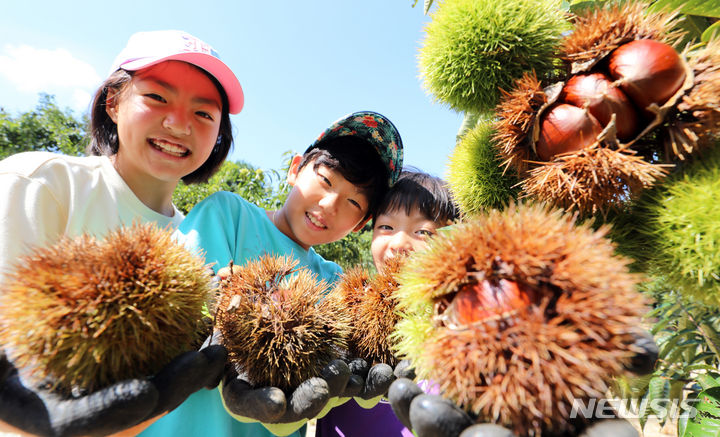 実りの季節が訪れつつある6日、忠清南道公州市反浦面のマルジェ農園で栗拾い体験をした子どもたちが、大きく実った栗入りのイガを見せている様子。