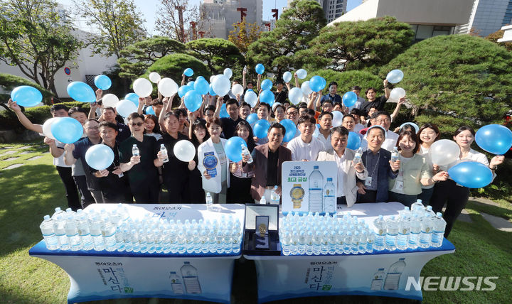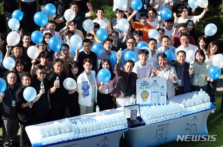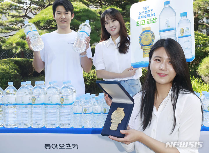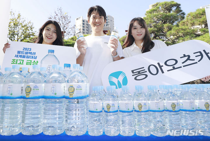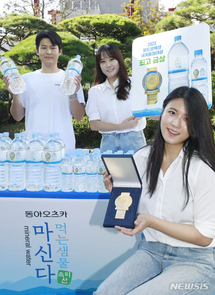 飲料メーカーの東亜大塚が7日、ソウル市東大門区竜頭洞のソウル事務所芝生広場で、2023年モンドセレクション金賞受賞を記念し、ミネラルウォーター「マシンダ」モンドセレクション・エディションをPRした。