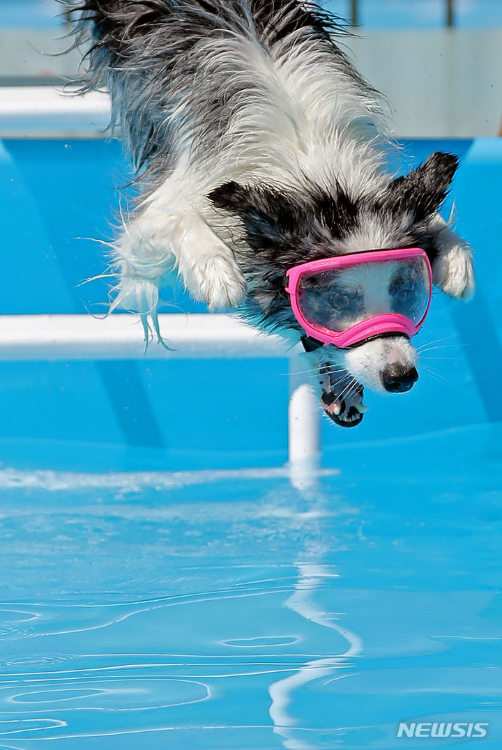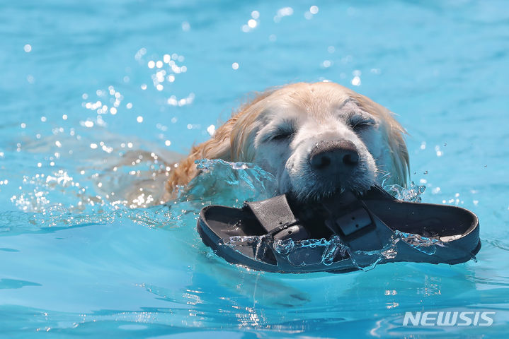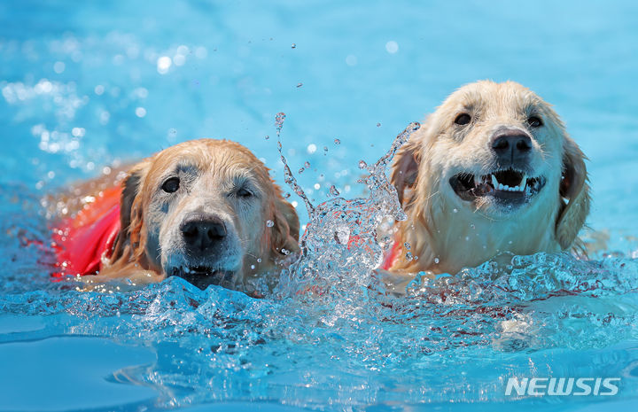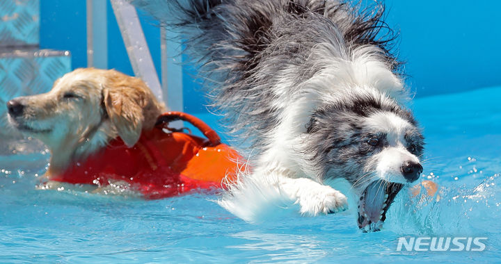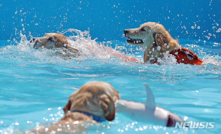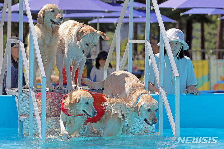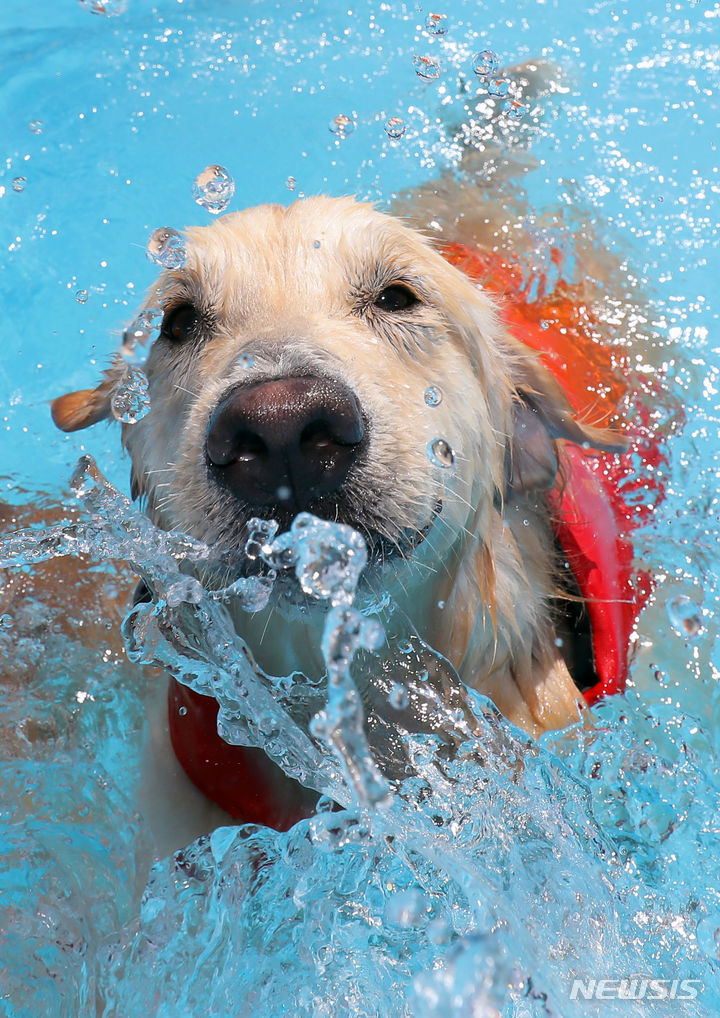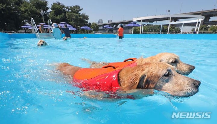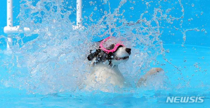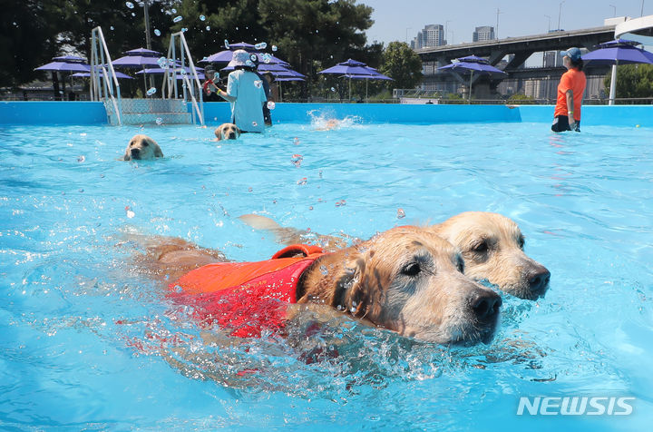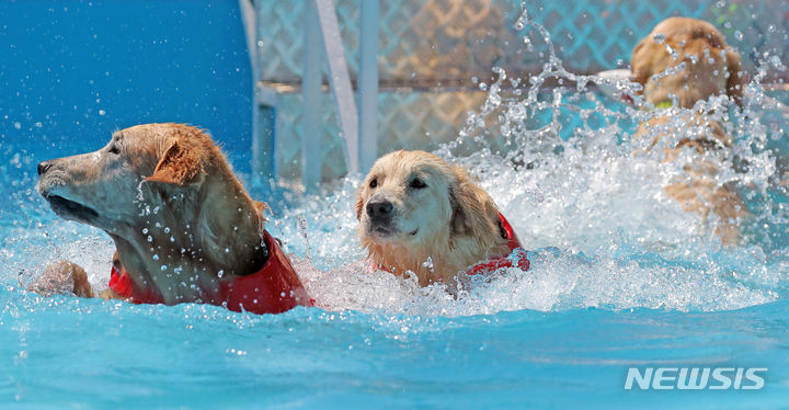ソウル市広津区のトゥクソム漢江公園内の愛犬プールで7日、イヌたちが水遊びをしている様子。市の集計によると、今月24日まで運営される愛犬プールには、今月2日から5日までの四日間で計409人の利用者と293頭の愛犬が訪れたという。