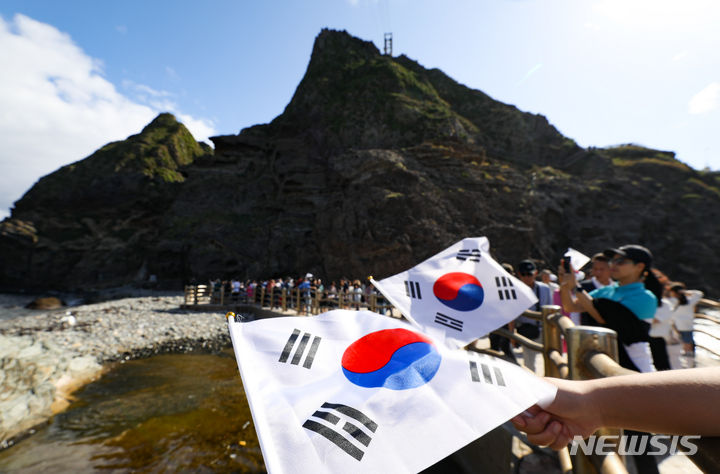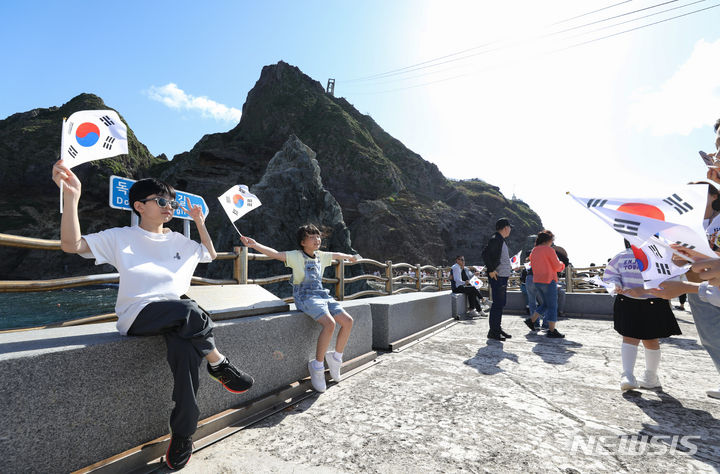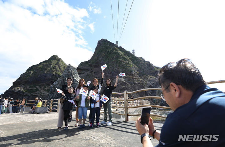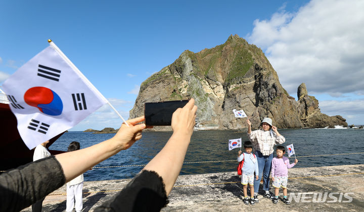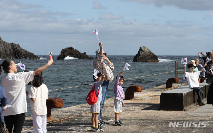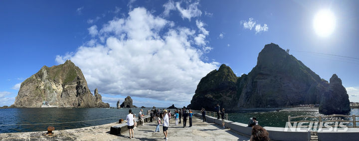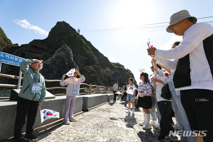 2023年度「美しい韓国の地 独島探訪」イベントの参加者らが8日、慶尚北道鬱陵郡の独島を見て回っている様子。