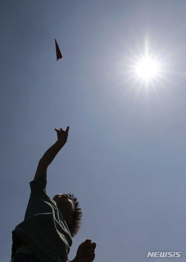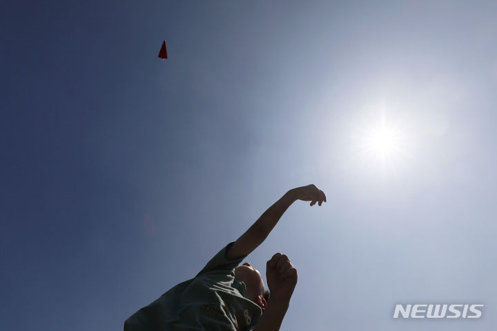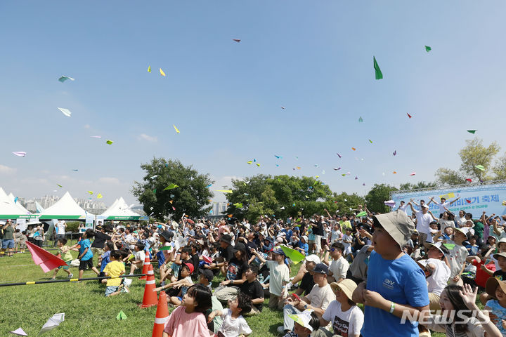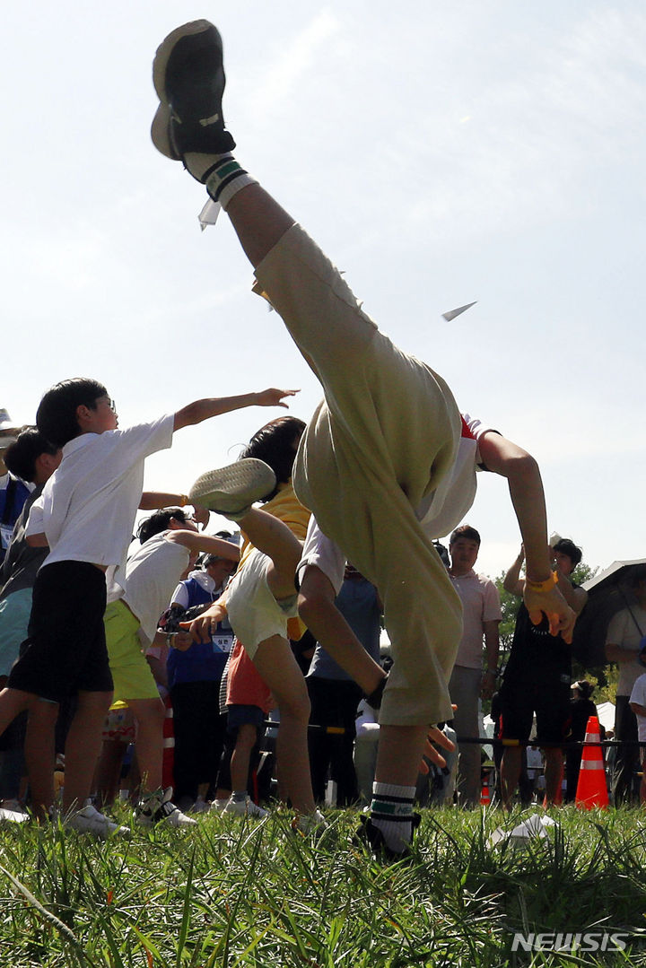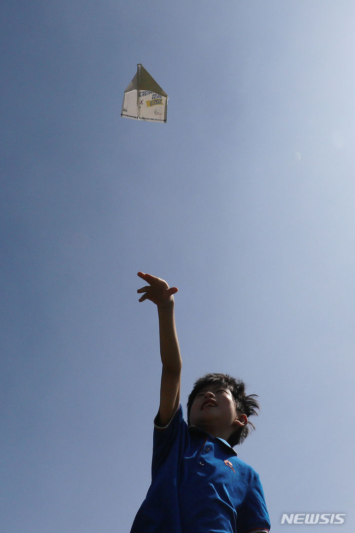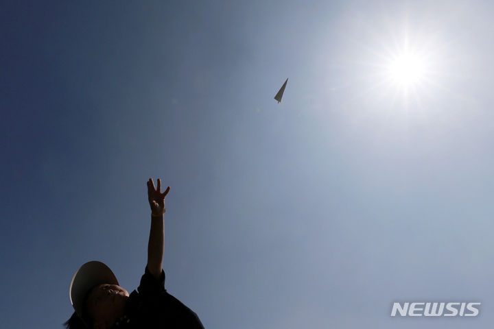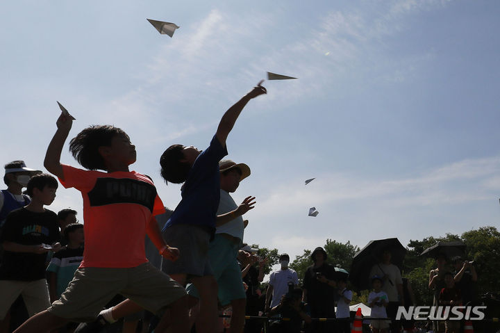 9日、ソウルの汝矣島漢江公園の芝生広場で開かれた漢江紙飛行機祭りに参加した子どもたちが、紙飛行機を空に飛ばしている。