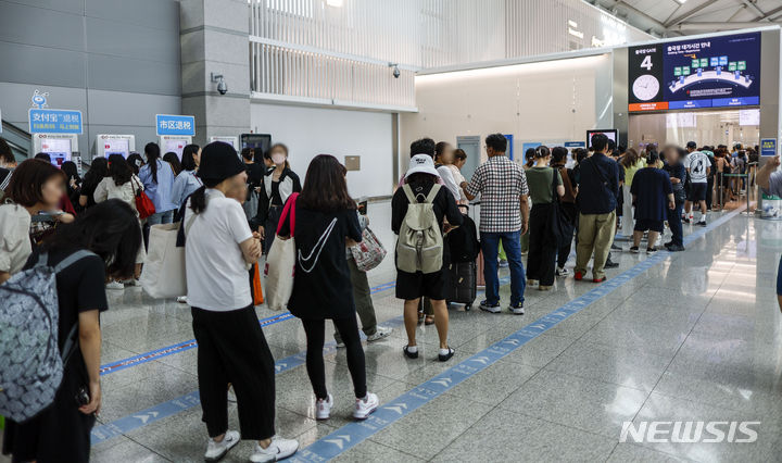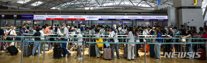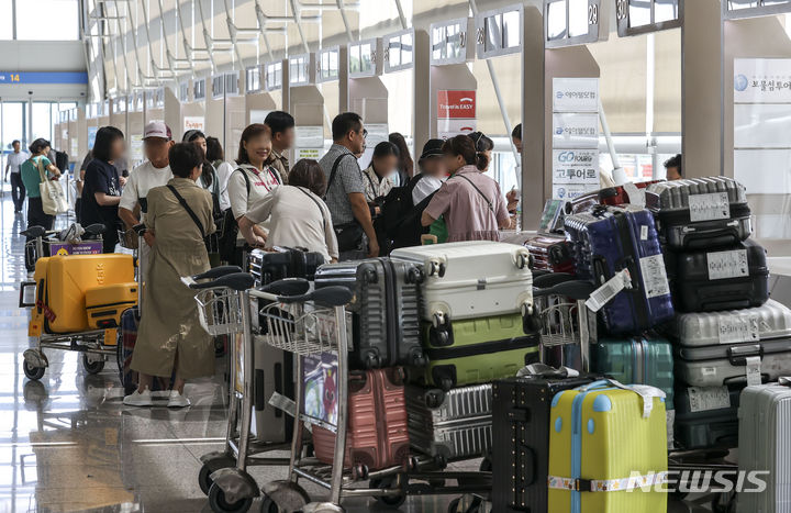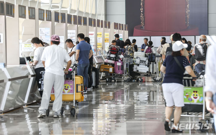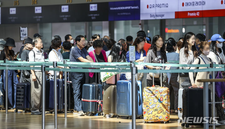 10月2日(月曜)が臨時公休日に指定されたことで、秋夕(中秋節。今年は9月29日)の連休が六日間に増える中、海外旅行の需要も高まっている。旅行業界によると、今回の連休期間中における旅行商品予約率は、先の夏休みの需要期に匹敵するほどの状況だ。写真は11日、旅行客で混み合う仁川国際空港第1ターミナル出国場の様子。