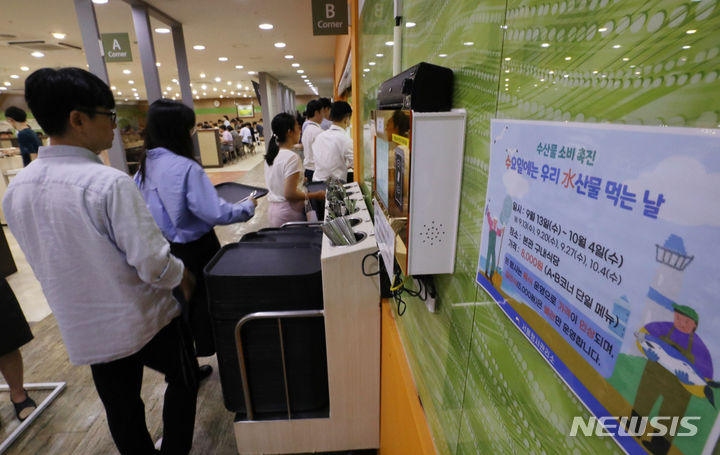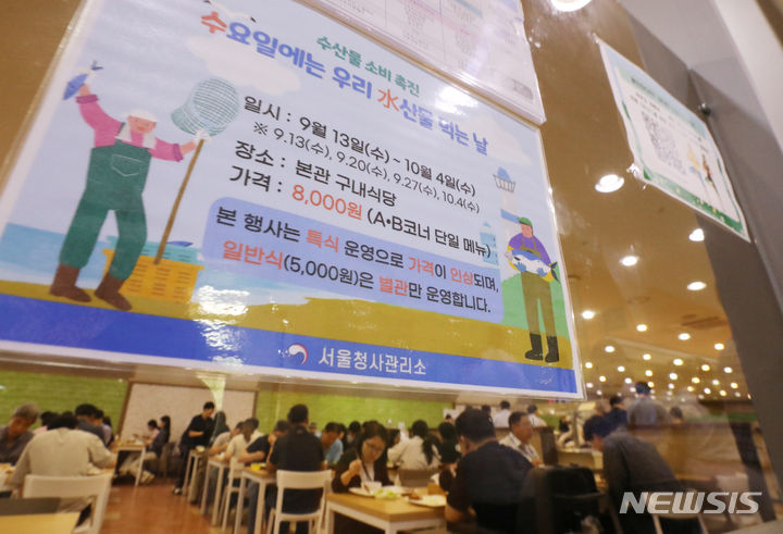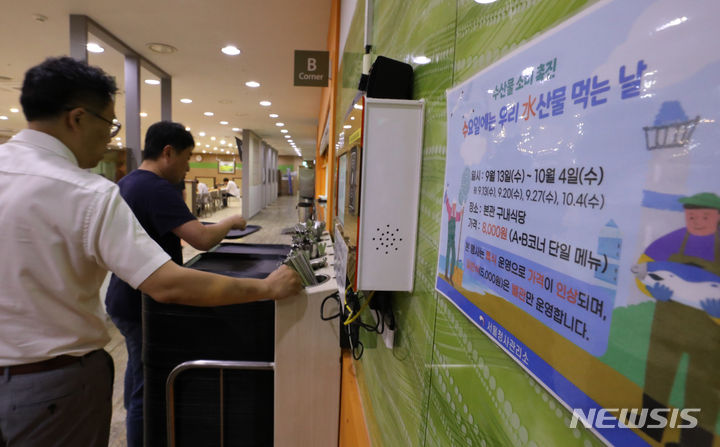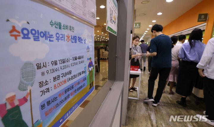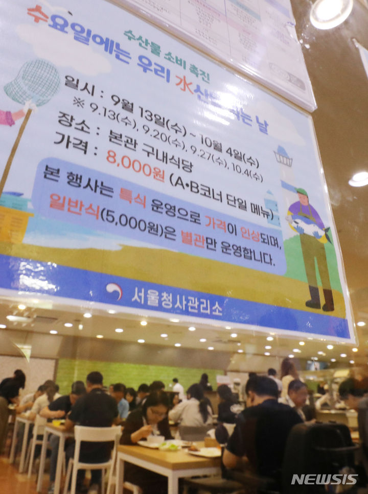 12日、政府ソウル庁舎(ソウル市鍾路区)の構内食堂に「水曜日は私たちの水産物を食べる日」という案内が掲示されている様子。行政安全部(省に相当)政府庁舎管理本部は、福島汚染水放流による消費委縮で危機に直面している韓国水産業界を支援するため、構内食堂にて1カ月間、毎週水曜に水産物を食べる水産物特食イベントを行う。
