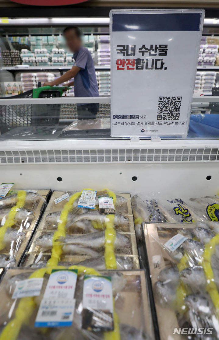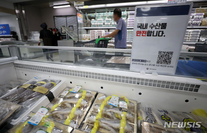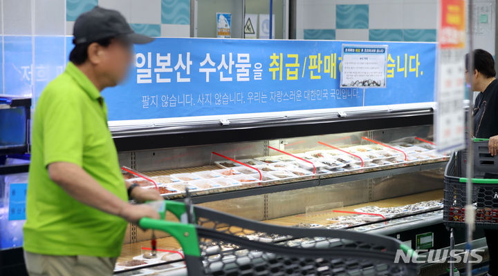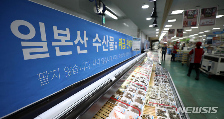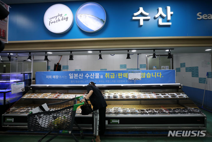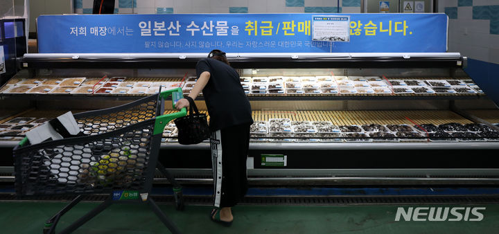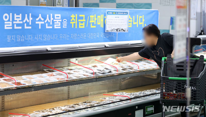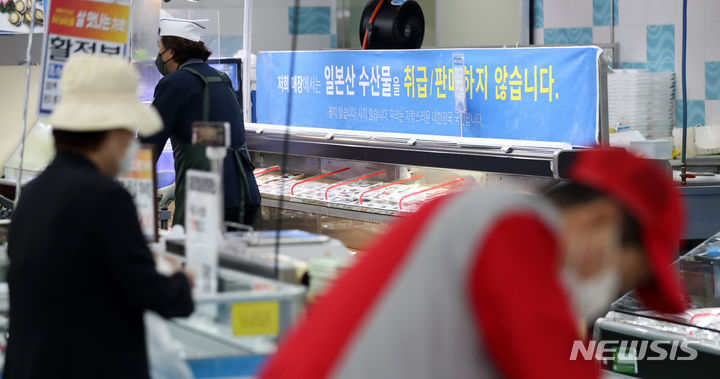先月24日から始まった福島原発汚染水の1回目の海洋放出が11日に終了した。写真は13日、京畿道高陽市の農協ハナロマート三松店の水産物コーナーに、日本産水産物の取り扱い、販売がないことを知らせる案内文が掲げられている様子。
