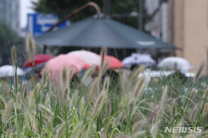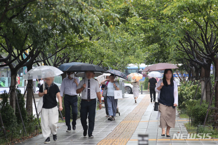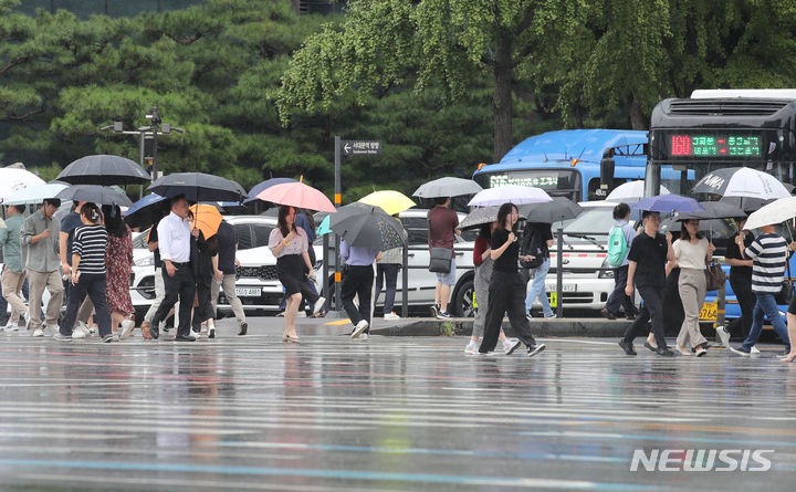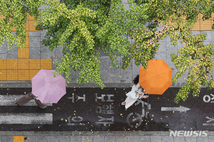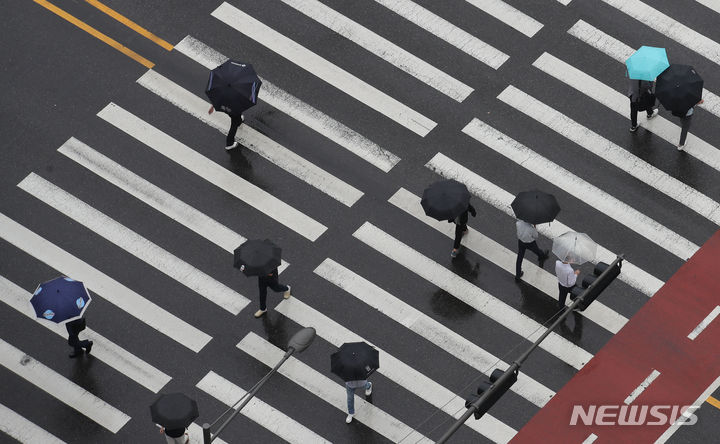 雨天となった13日午後、ソウル市鍾路区の光化門駅付近では、市民が雨傘を差して行き交っていた。