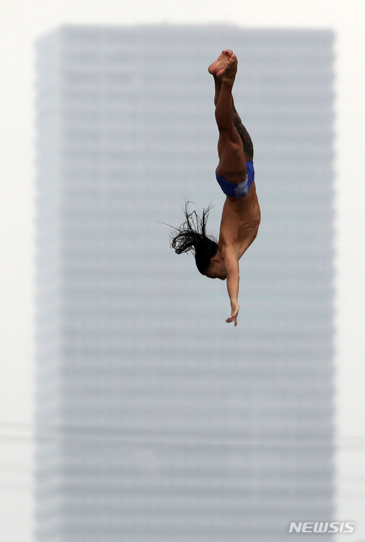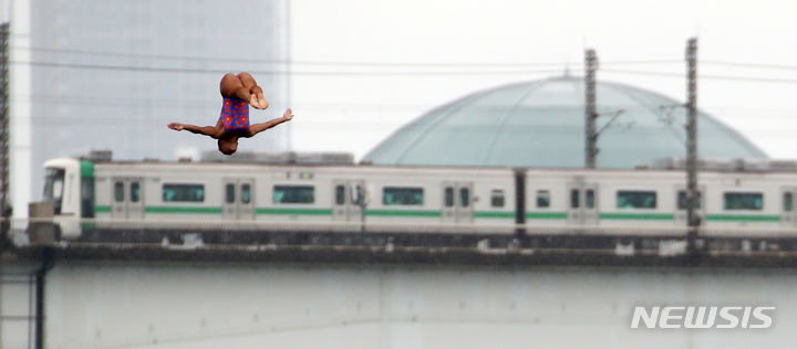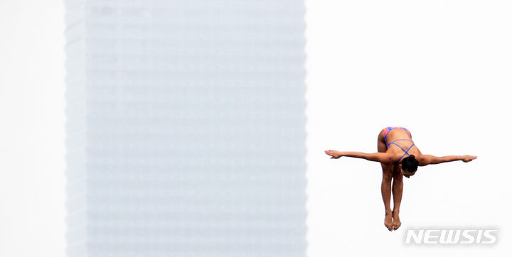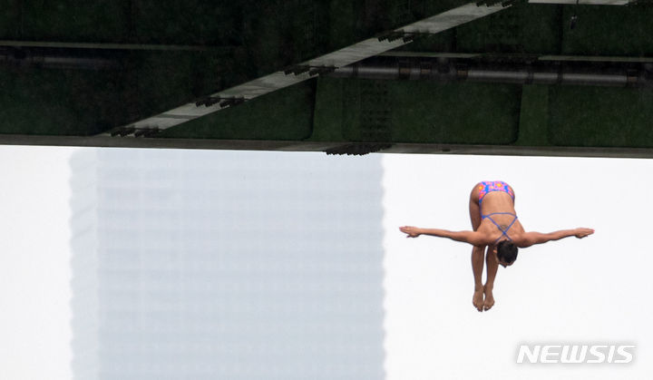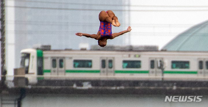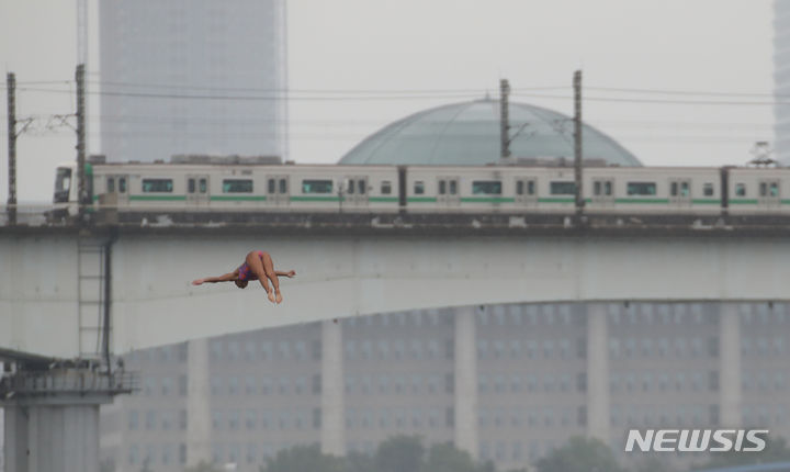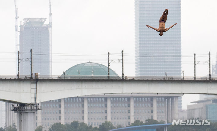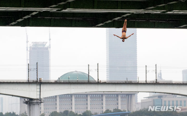 13日午後、ソウル市麻浦区の楊花大橋で開かれた「レッドブル・ソウルダイブ」にて、ハイダイバーのザンティア・ペニーシ選手(XANTHEIA PENNISI. レッドブル所属、オーストラリア)が演技を披露しているところ。今回のイベントは、クリフダイビング・ワールドシリーズを韓国国内に紹介する先行イベントという性格のプロジェクトだ。