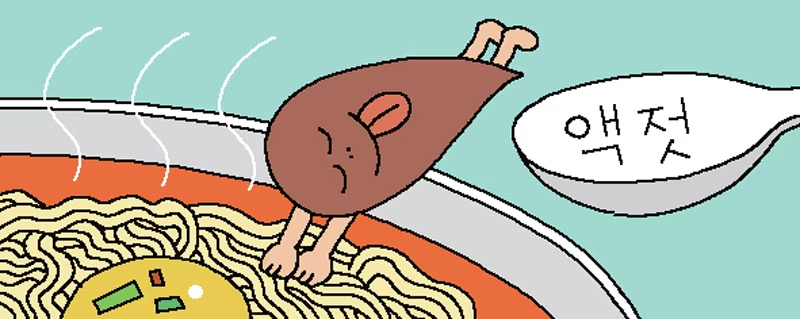 インスタントラーメンを作る時は韓国の魚しょう(ぎょしょう)「エクチョッ」を入れるとコクが出る。麺やスープなどを入れて煮た後、最後の仕上げに大さじ1杯ほど入れる。