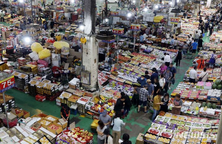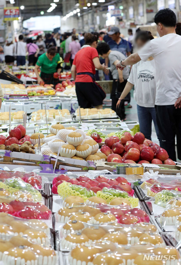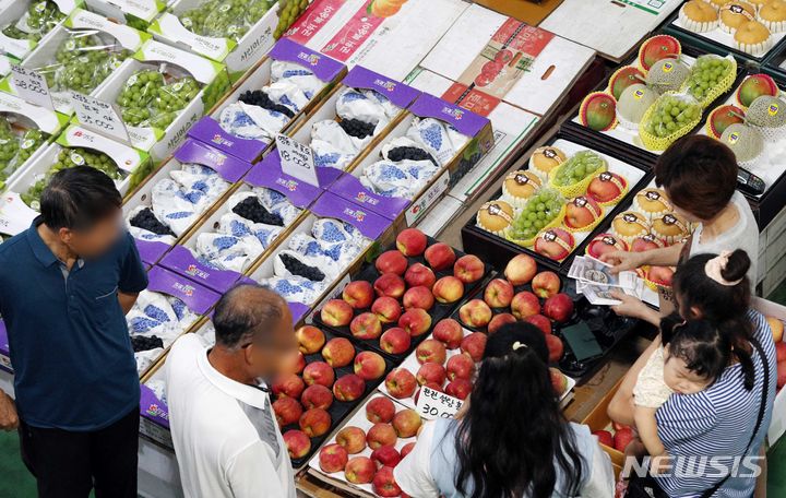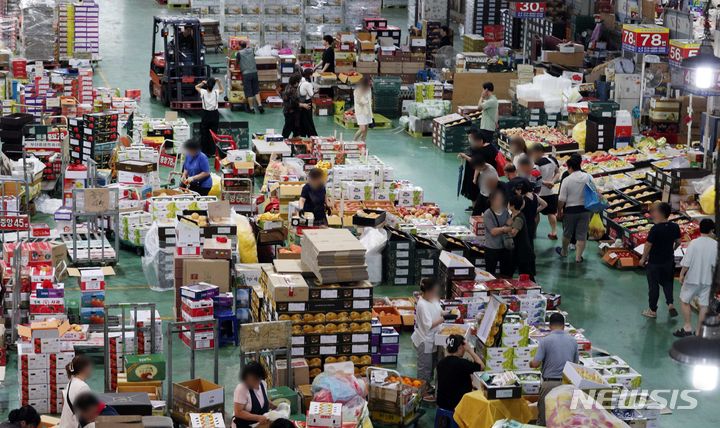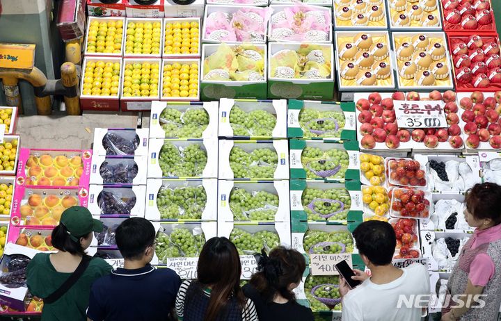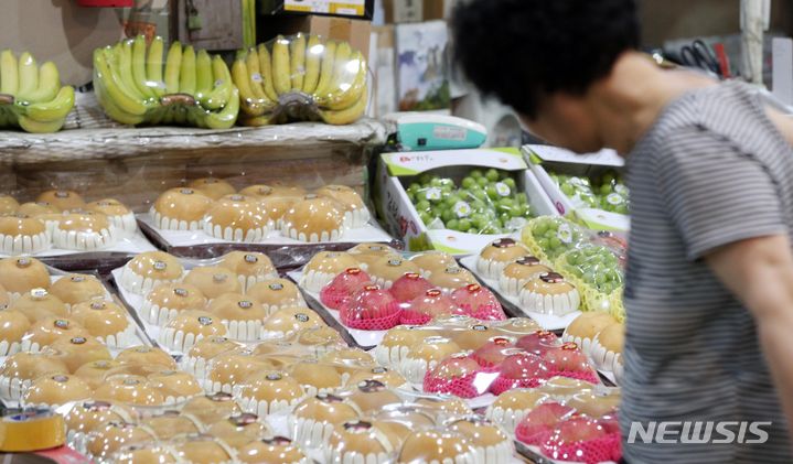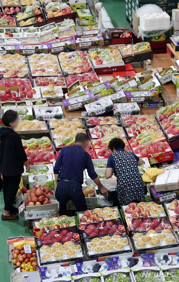 【NEWSIS】秋夕(チュソク=中秋節)連休(今年は9月28-30日)まであと約十日となった16日、釜山市海雲台区の盤如農産物卸売市場は祭祀(さいし)用や贈答品用の果物を買い求める市民たちでにぎわっていた。