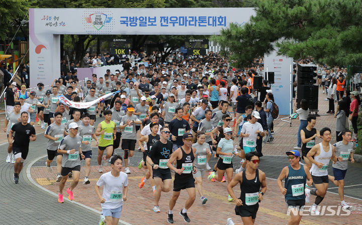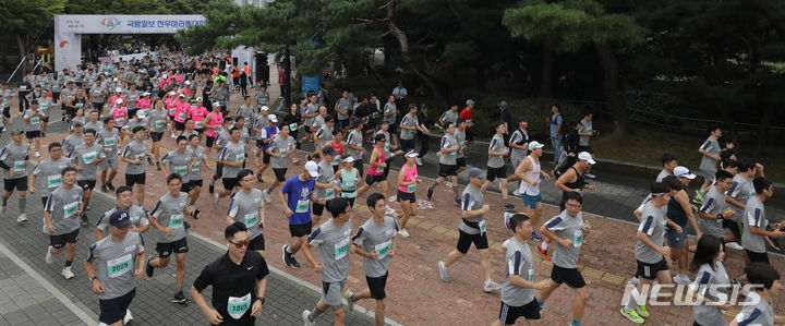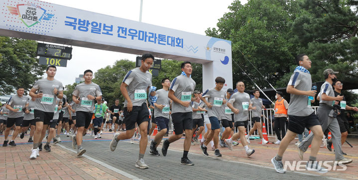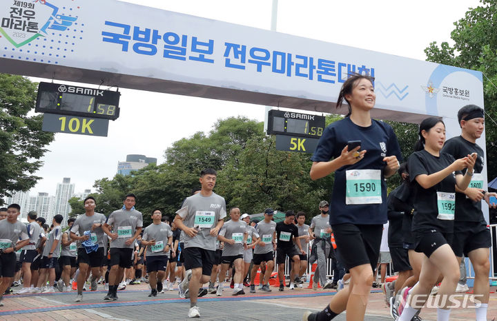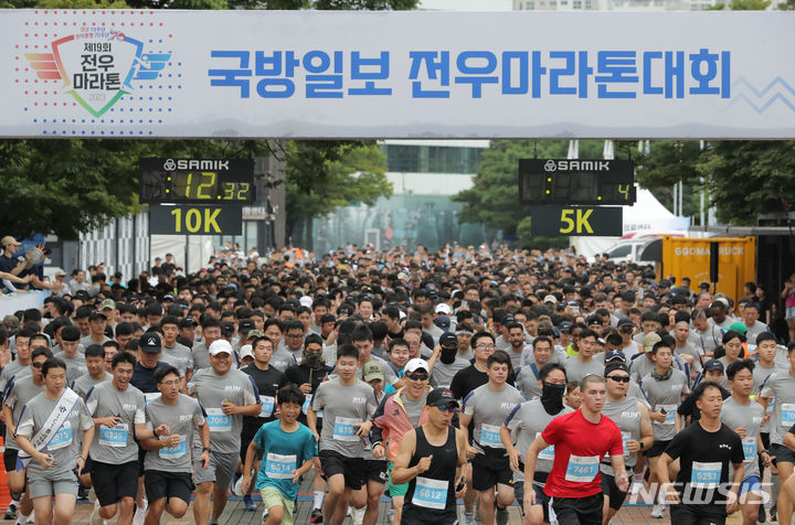 16日午前、ソウル市松坡区のオリンピック公園平和の広場一帯で行われた「建軍75周年および韓米同盟70周年記念第19回国防日報戦友マラソン大会」に参加した韓国軍の将兵をはじめ、駐韓米軍やその家族、市民ランナーたちが勢いよく出発した。