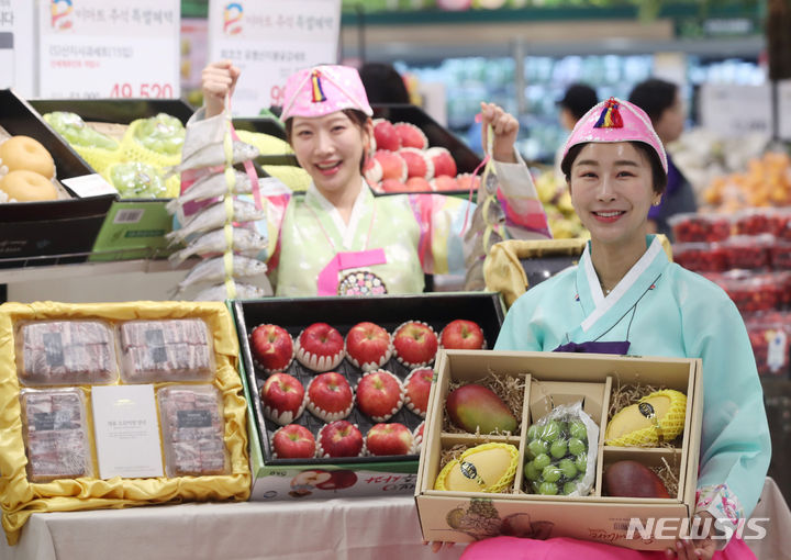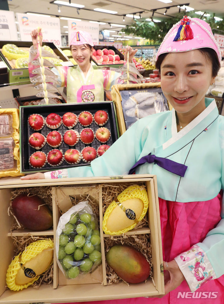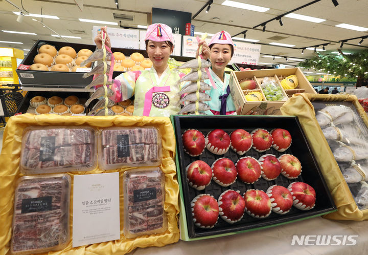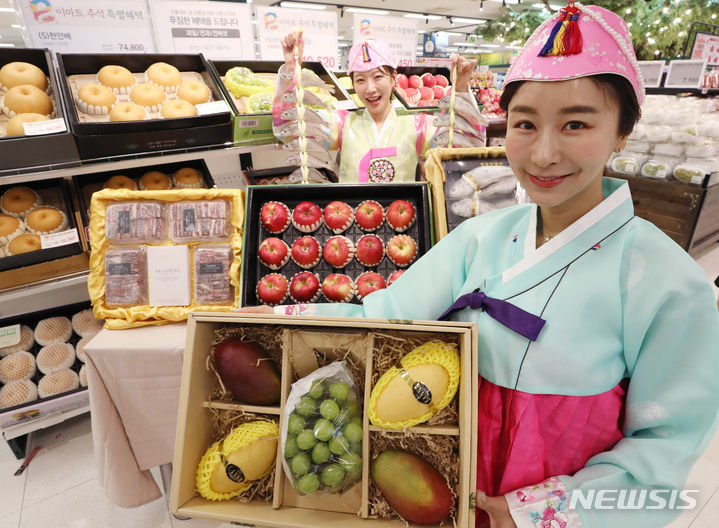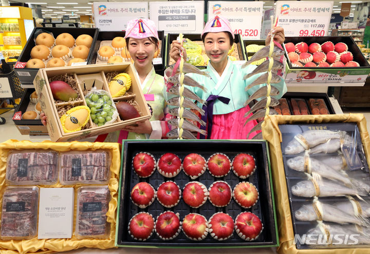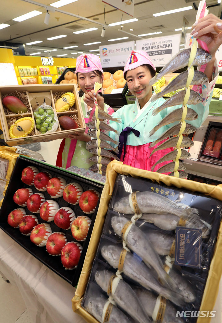 18日午前、ソウル市竜山区の大手スーパー「Eマート竜山店」で、秋夕(中秋節。今年は9月29日)のギフトセットを披露するコンパニオンの様子。Eマートは今月19日から秋夕当日の29日まで、韓国各地の売り場で秋夕のギフトセットの本格販売を行う。
