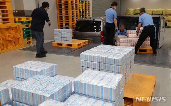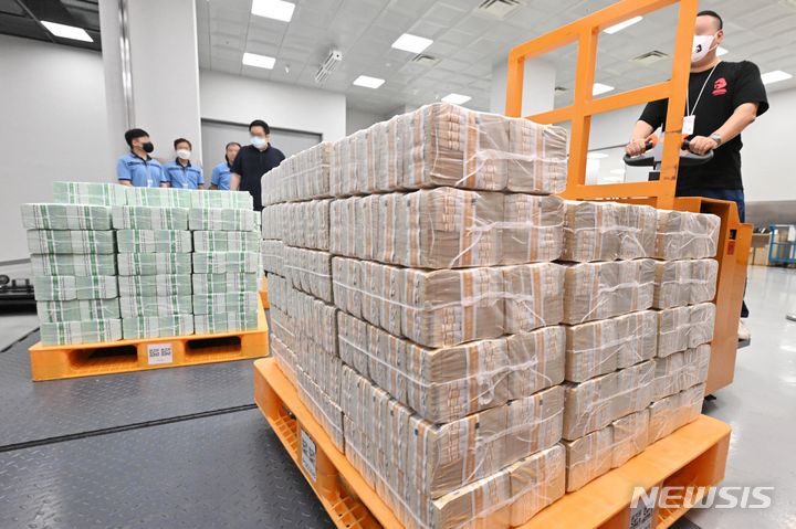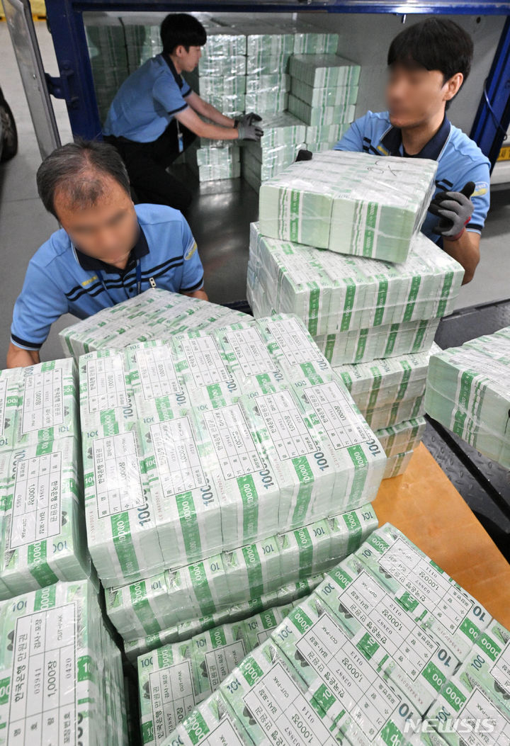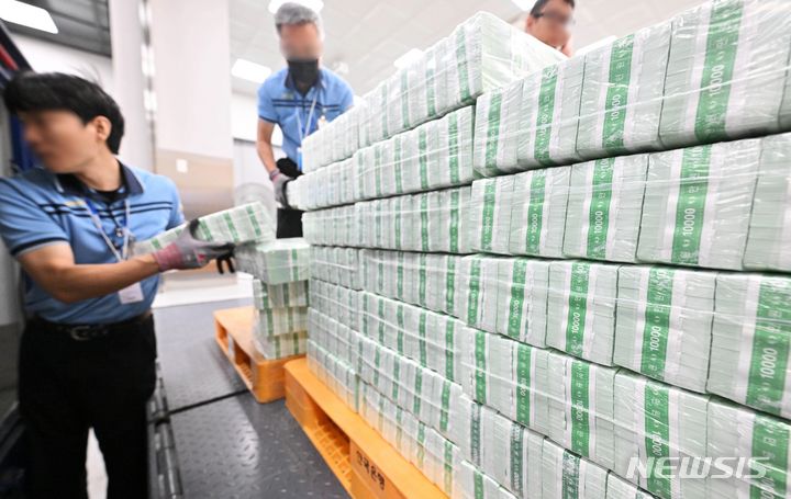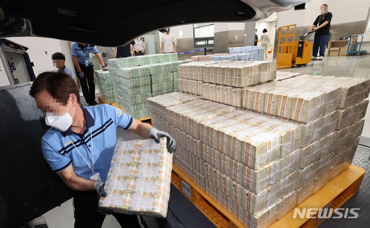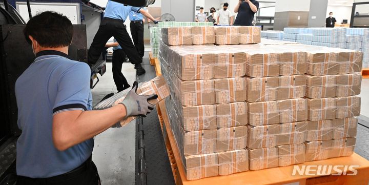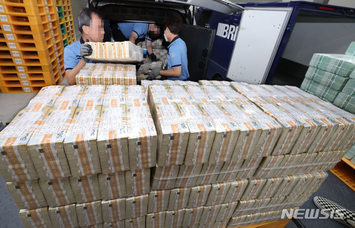 ソウル市中区にある韓国銀行の貨幣収納場で19日、関係者らが秋夕(チュソク=中秋節、今年は9月29日)に向けて貨幣を供給する様子。