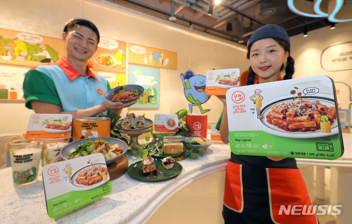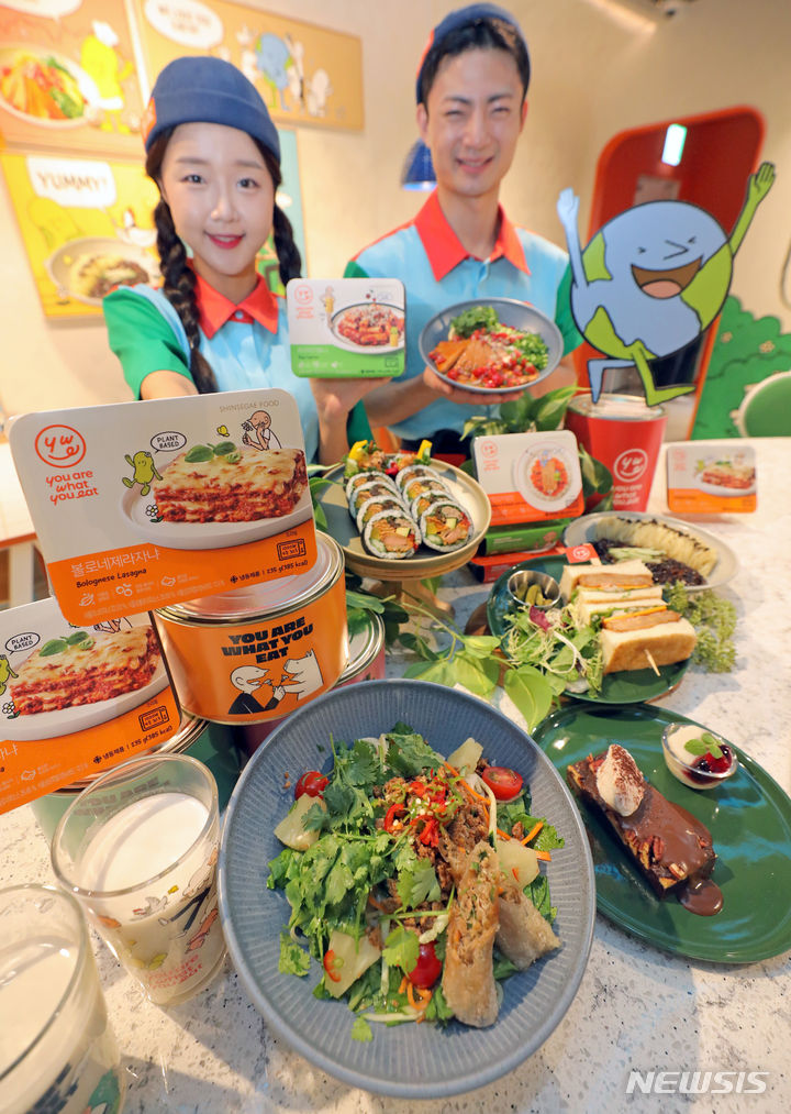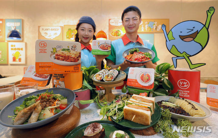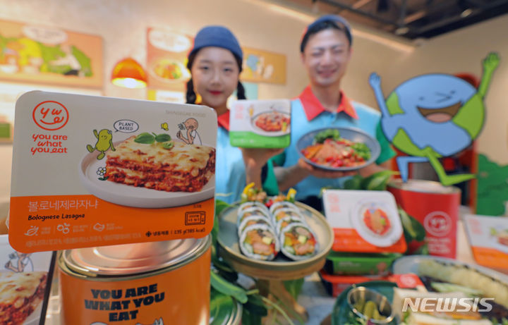 【NEWSIS】新世界フードが植物性代替食ブランド「You are What you Eat(ユー・アー・ワット・ユー・イート)」を発売した。写真は20日午前、ソウル市江南区のスター・フィールドCOEXモール「You are What you Eat COEX店」で行われた、100%植物性のメニューと植物性ミールキットのPRイベントの様子。