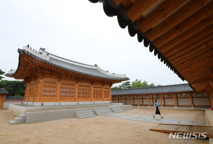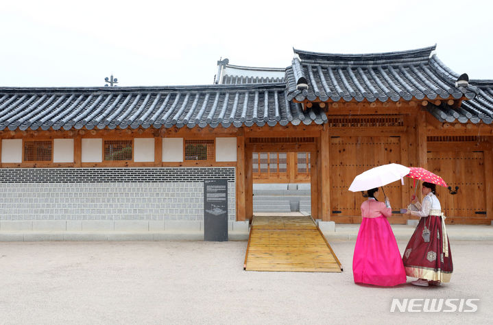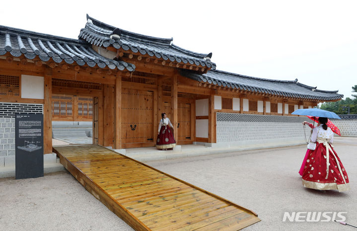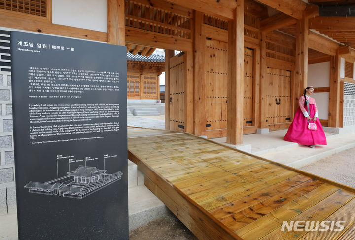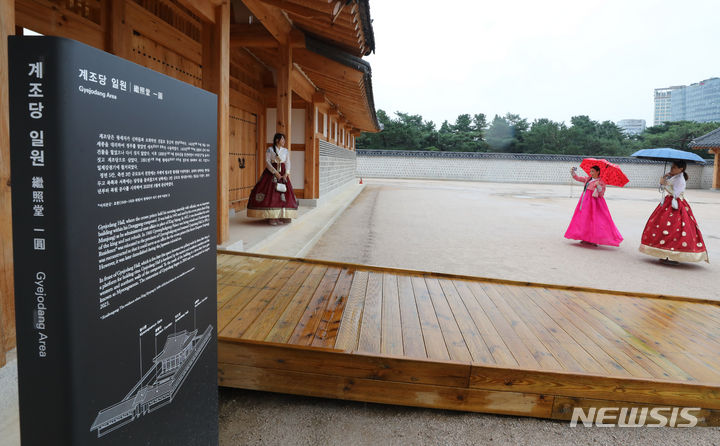 20日午前、ソウル市鍾路区の景福宮を訪れた観光客が、復元された継照堂一帯で記念撮影をしている様子。この日から一般に公開された景福宮継照堂は、朝鮮王朝の王世子が臣下らと朝会をしていた東宮の正堂で、日帝強占期の1910年に取り壊されていた。