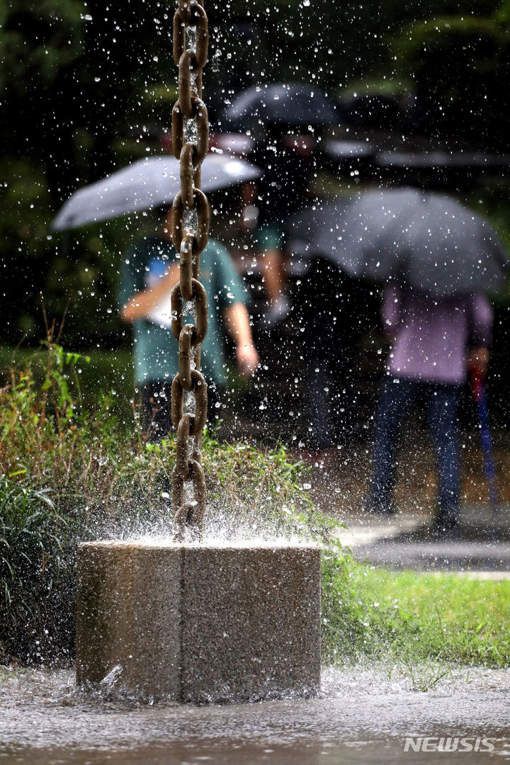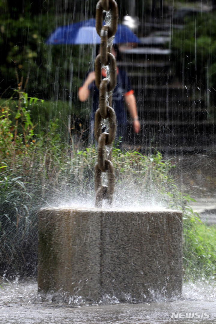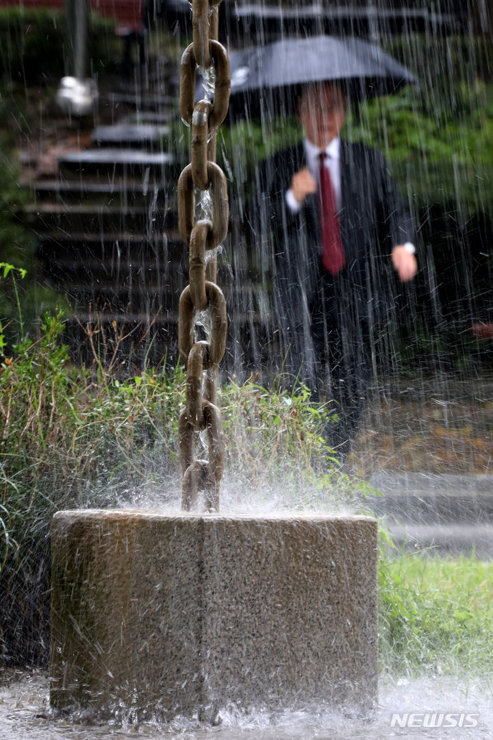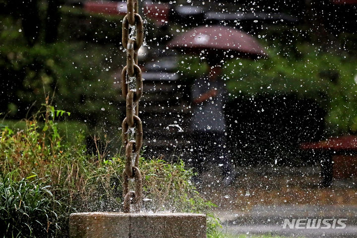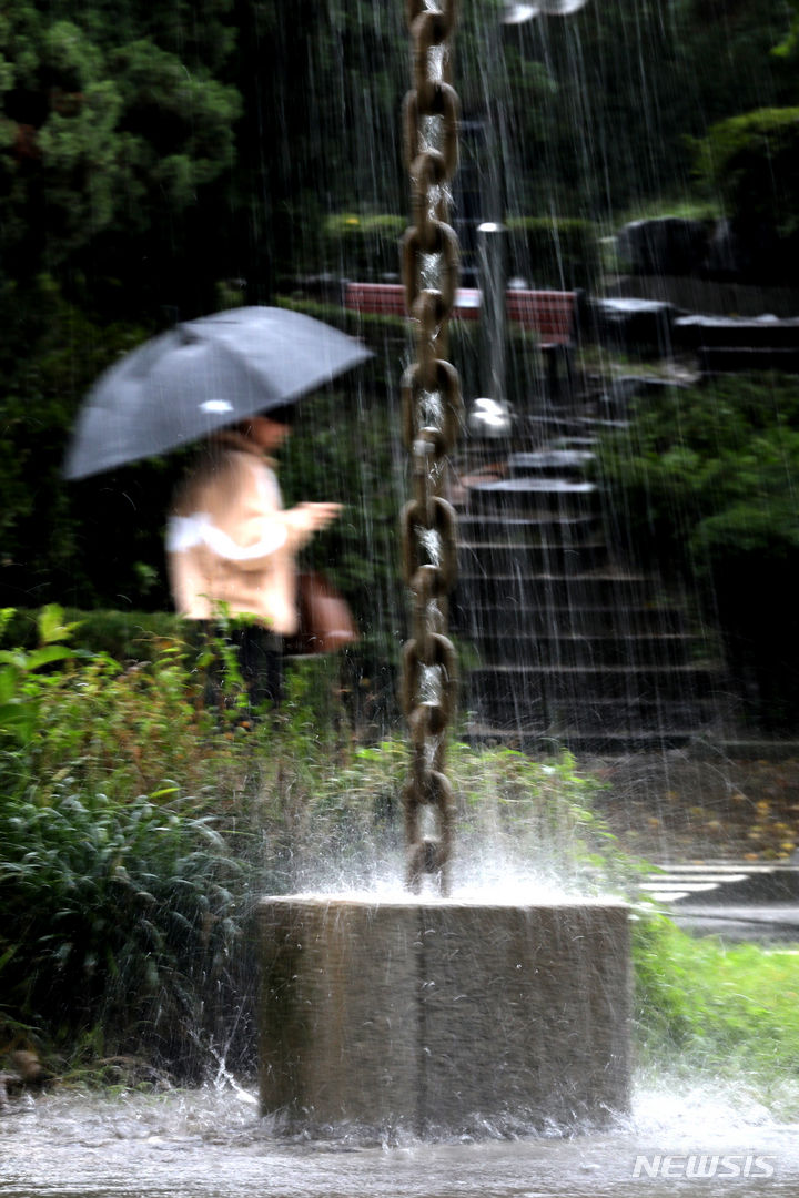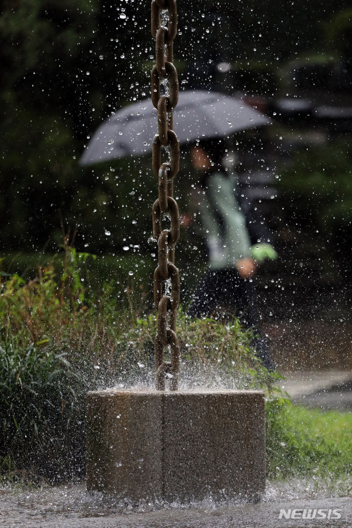 韓国各地に秋の雨が降った13日、ソウル市中区の国立劇場に近い南山循環路を、傘を差した市民が歩いている様子。