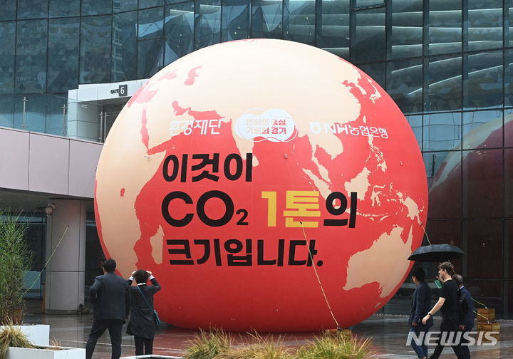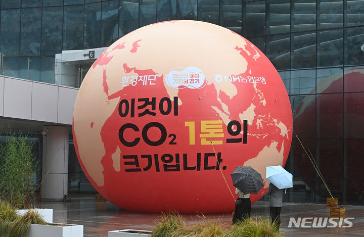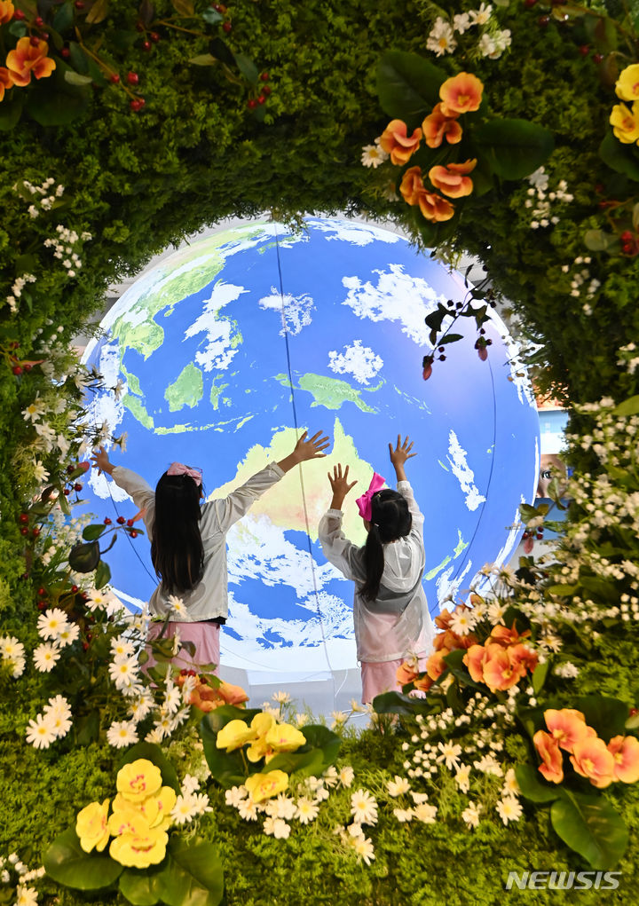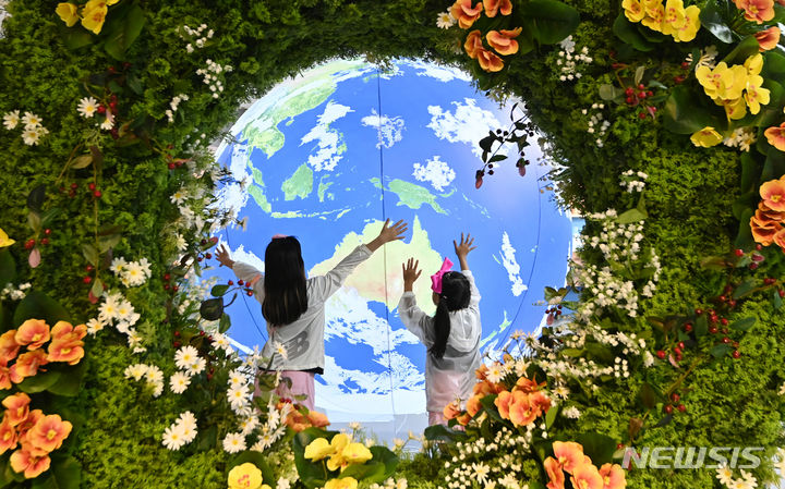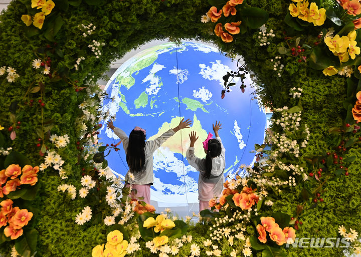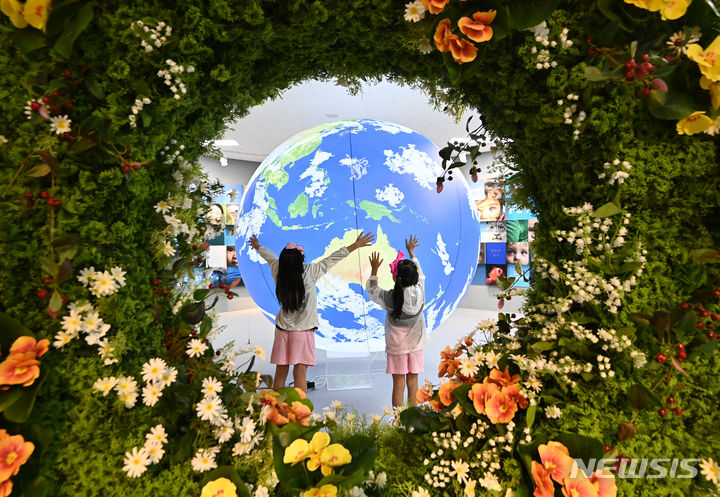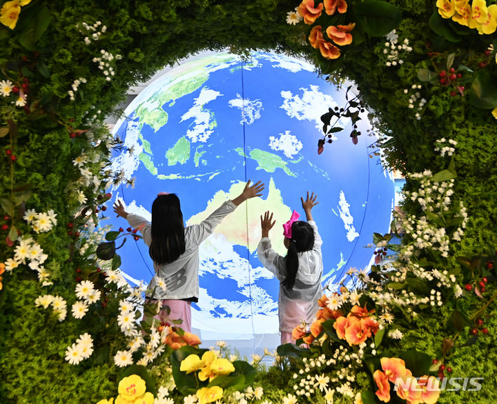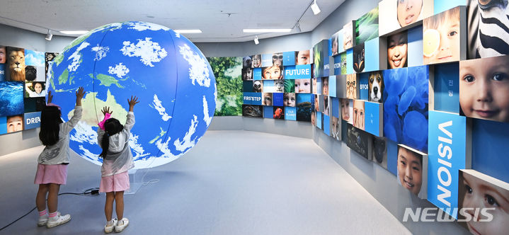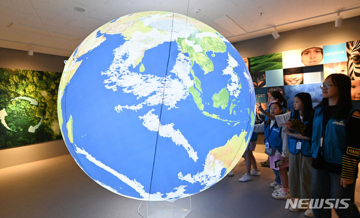ロンドン自然史博物館の気候変化体験展が開かれた20日、京畿道水原市霊通区の水原コンベンションセンターに展示された地球儀を見ている子どもたち。