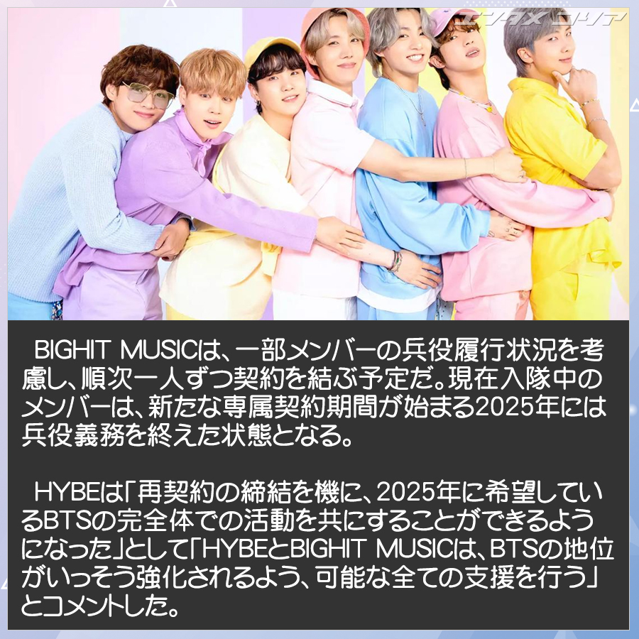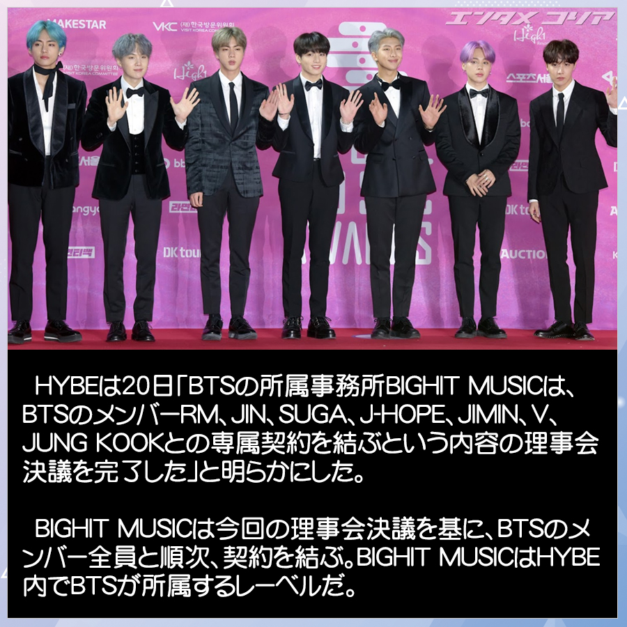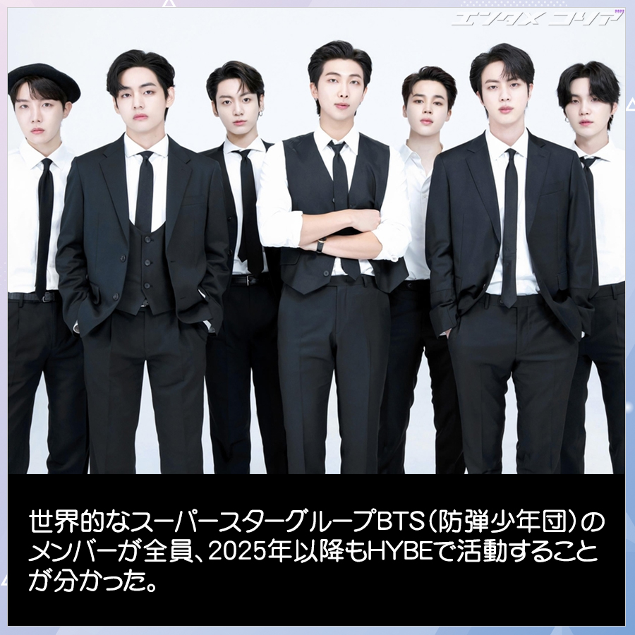世界的なスーパースターグループBTS(防弾少年団)のメンバーが全員、2025年以降もHYBEで活動することが分かった。 HYBEは20日「BTSの所属事務所BIGHIT MUSICは、BTSのメンバーRM、JIN、SUGA、J-HOPE、JIMIN、V、JUNG KOOKとの専属契約を結ぶという内容の理事会決議を完了した」と…