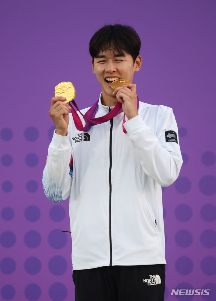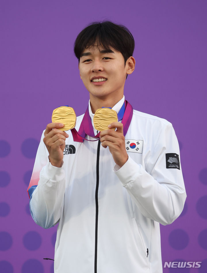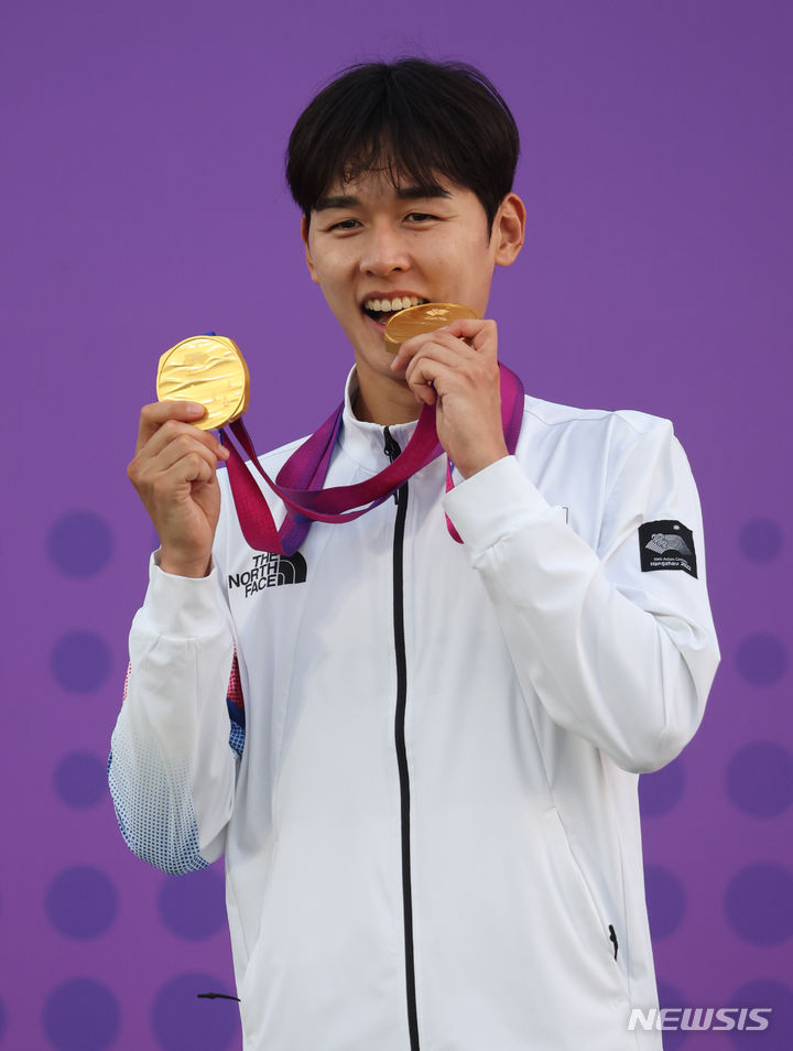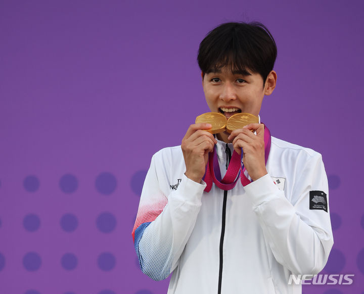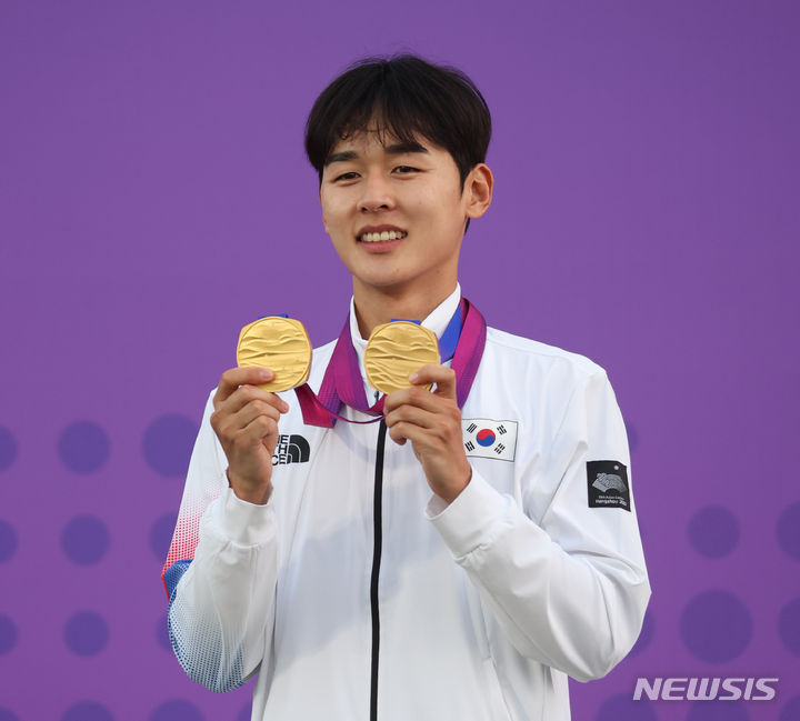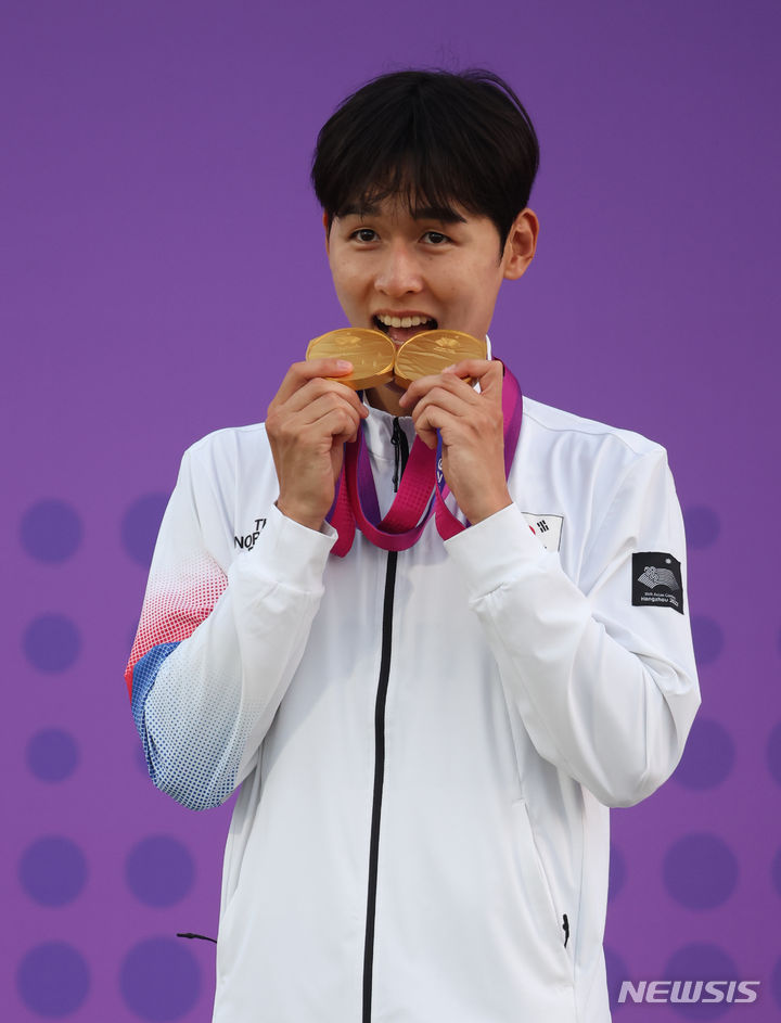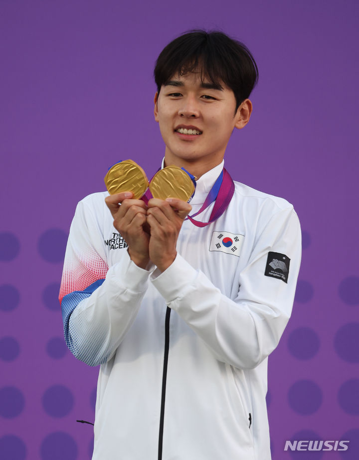 【NEWSIS】24日(現地時間)、中国・杭州の富陽銀湖スポーツセンターで行われた近代五種個人戦と団体戦で金メダルを獲得したチョン・ウンテ。金メダル2個を手に授賞式に臨んだ。