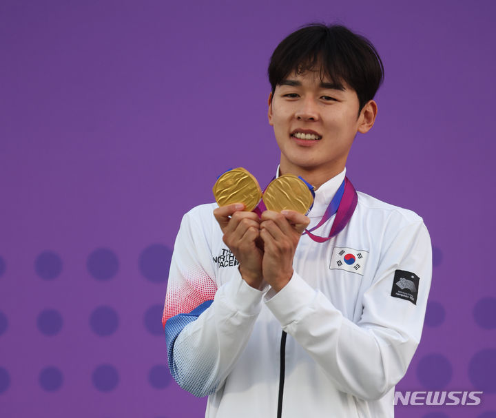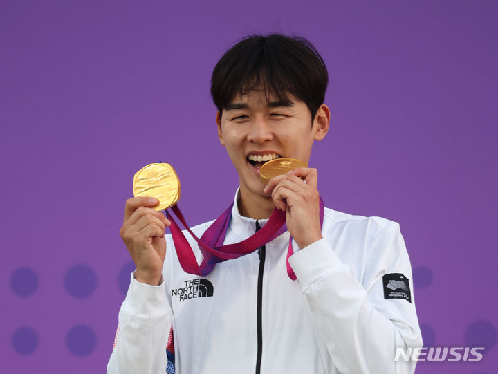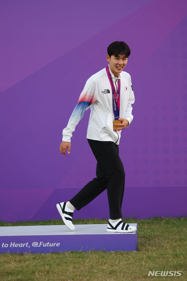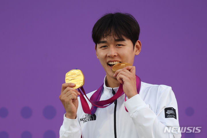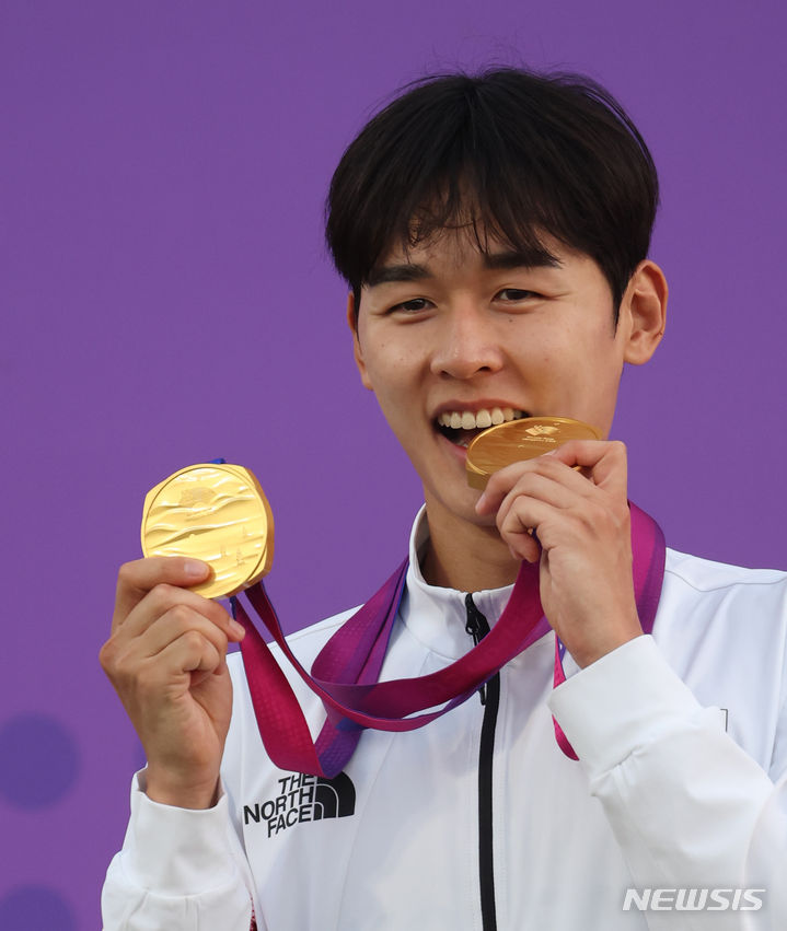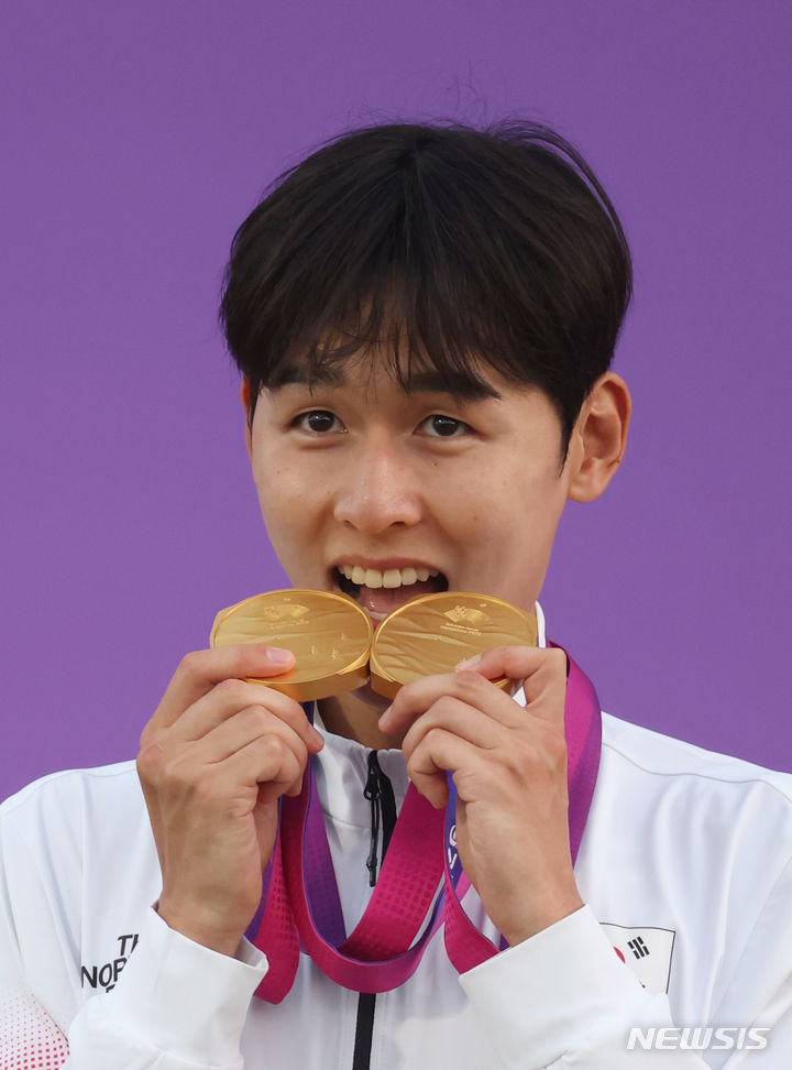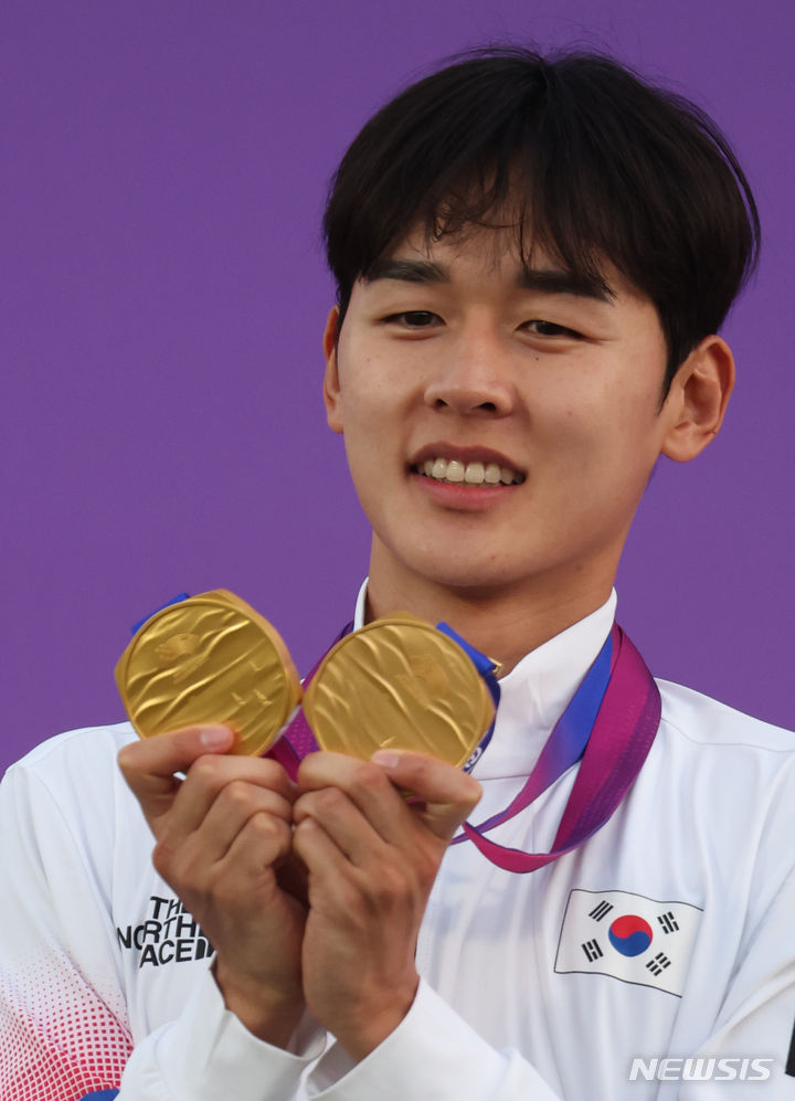 【NEWSIS】24日(現地時間)、中国・杭州の富陽銀湖スポーツセンターで行われた近代五種個人戦と団体戦で金メダルを獲得したチョン・ウンテ。金メダル2個を手に授賞式に臨んだ。