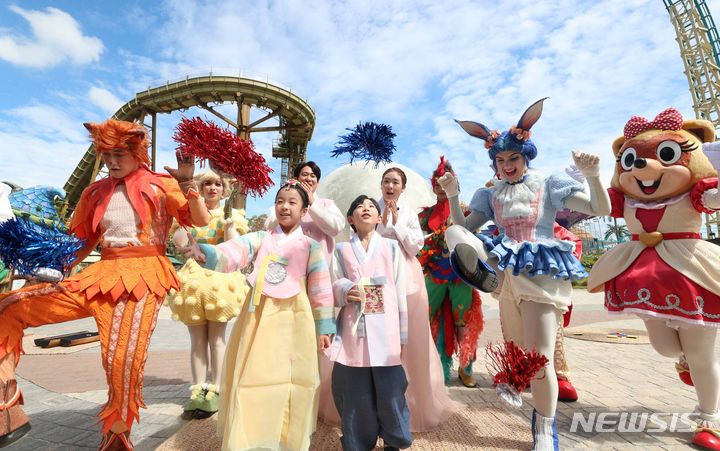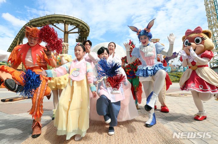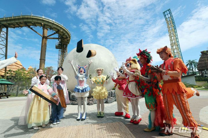 秋夕(チュソク=中秋節、今年は9月29日)連休を三日後に控えた25日、釜山市機張郡のロッテワールド・アドベンチャー釜山で、韓服(韓国の伝統衣装)を着たコンパニオンや外国人キャストたちが民俗遊びを体験した。