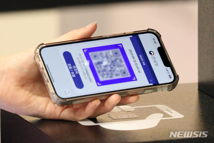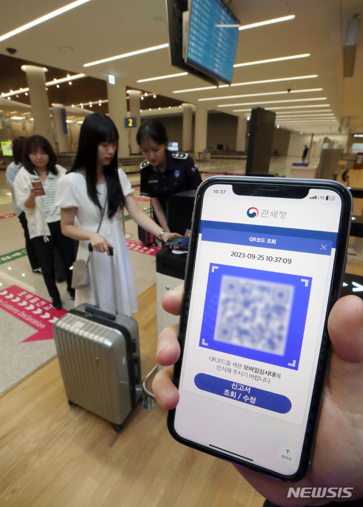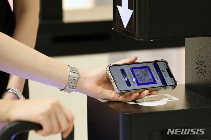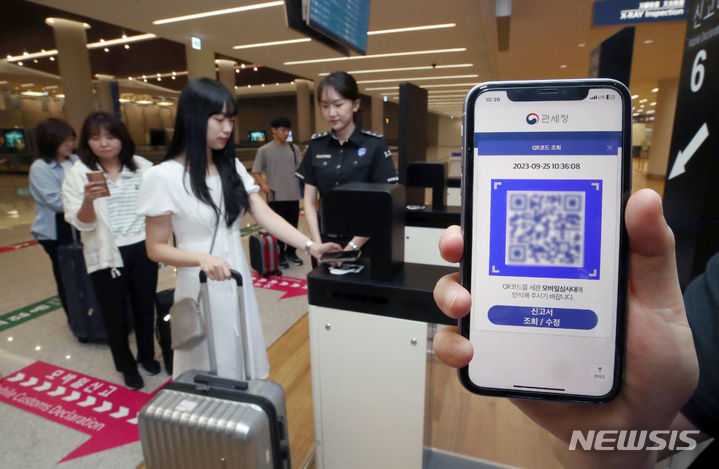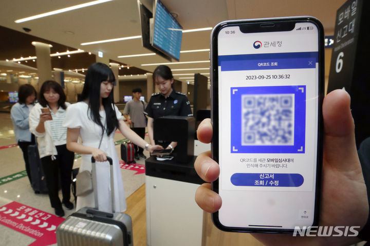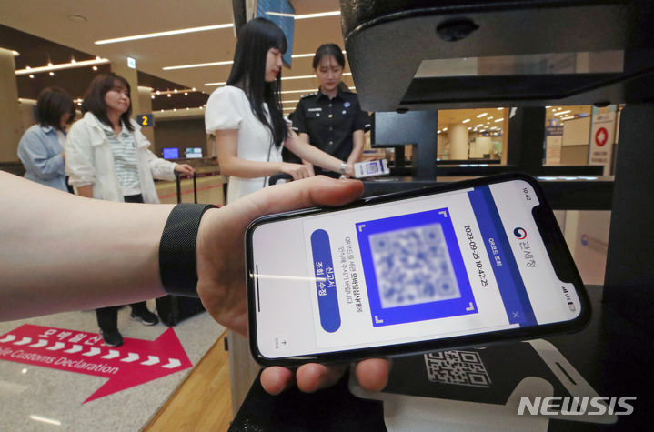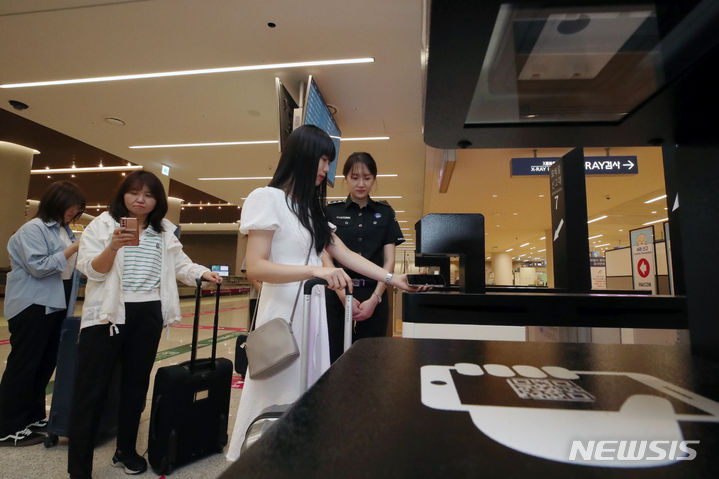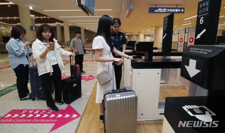 仁川空港税関の職員たちが25日午前、仁川国際空港第2旅客ターミナルの入国ロビーでモバイル申告システムを実演した。