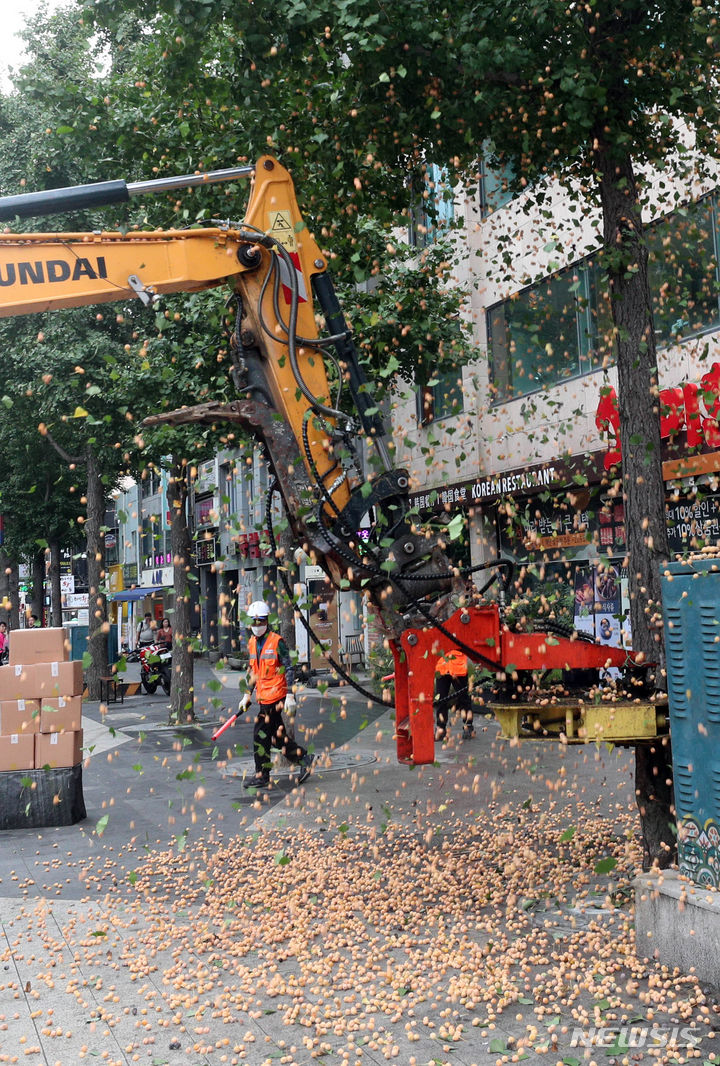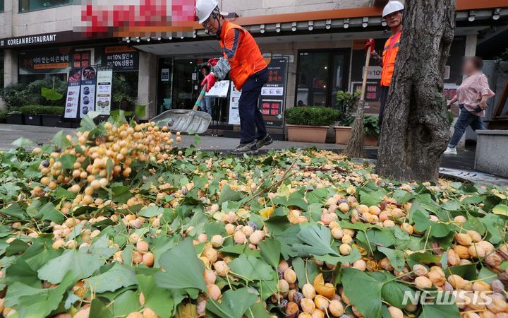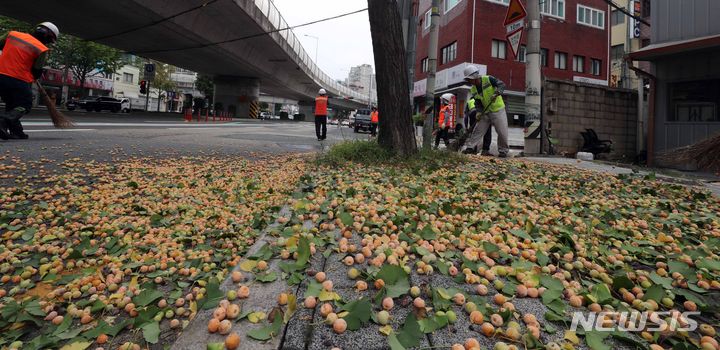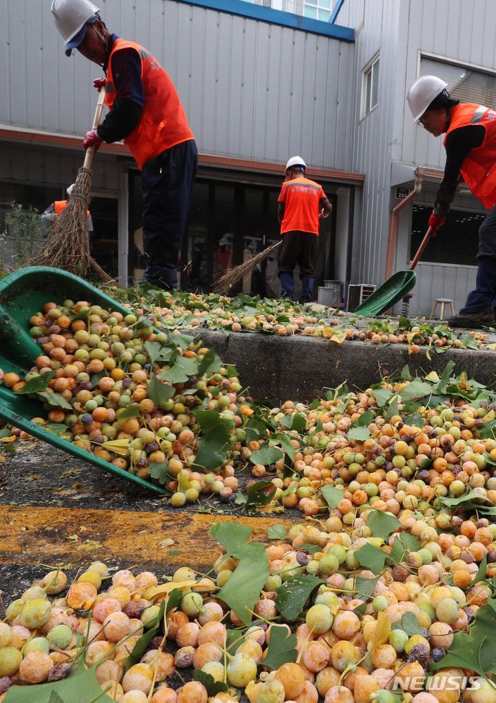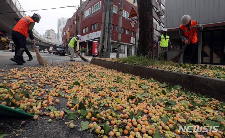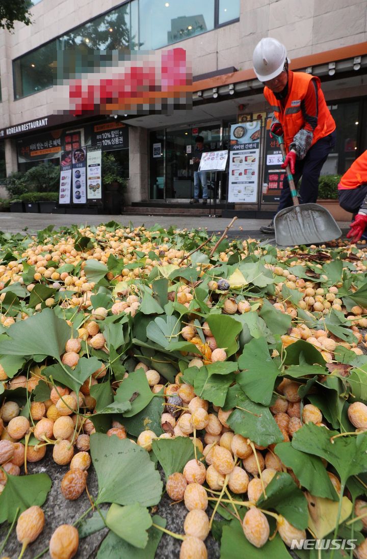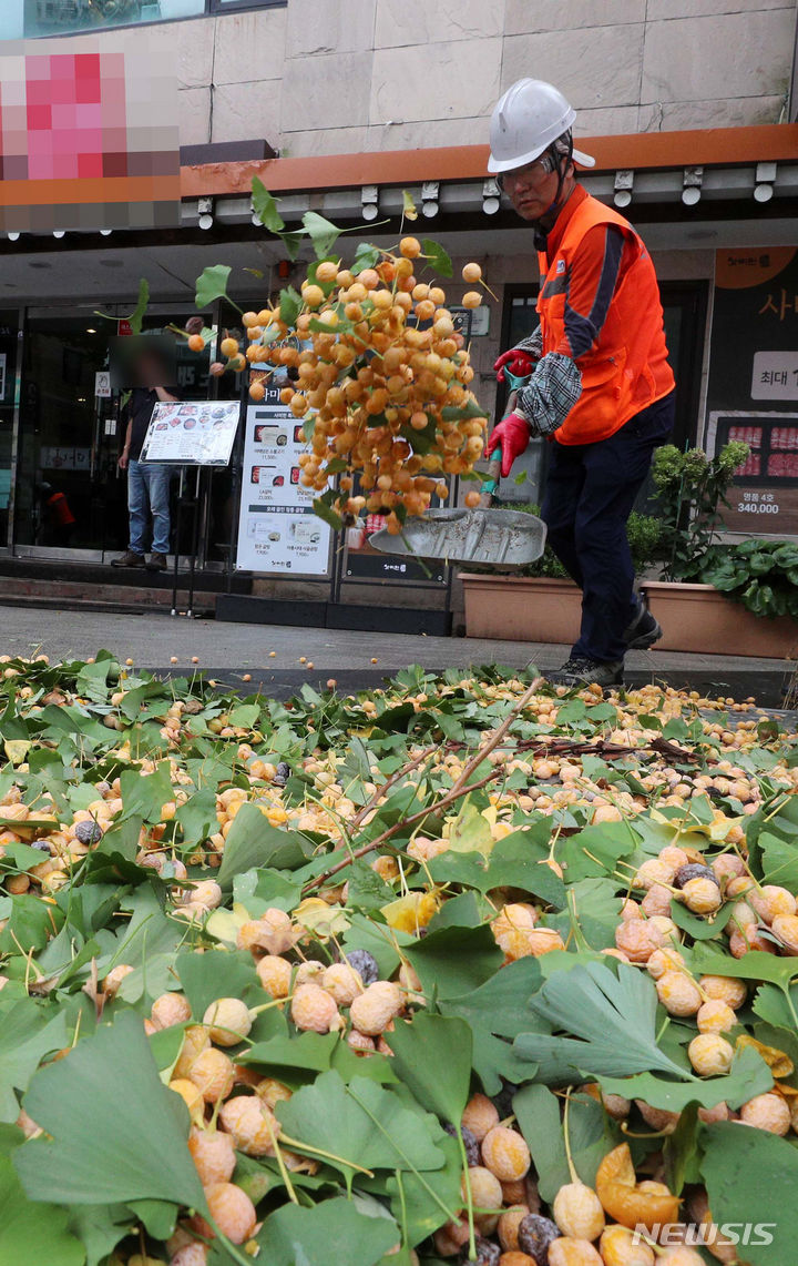 釜山市の釜山鎮区庁関係者が26日午前、釜山市民公園付近の道路脇で、秋の都心における悪臭の主犯たる「イチョウの実」の回収作業を行っている。釜山鎮区は、10月20日までイチョウの実の集中採集期間として作業を行う。釜山地域の街路樹16万8000本のうち、イチョウの木は合計3万4000本で、このうち実がなる雌株はおよそ1万本だ。